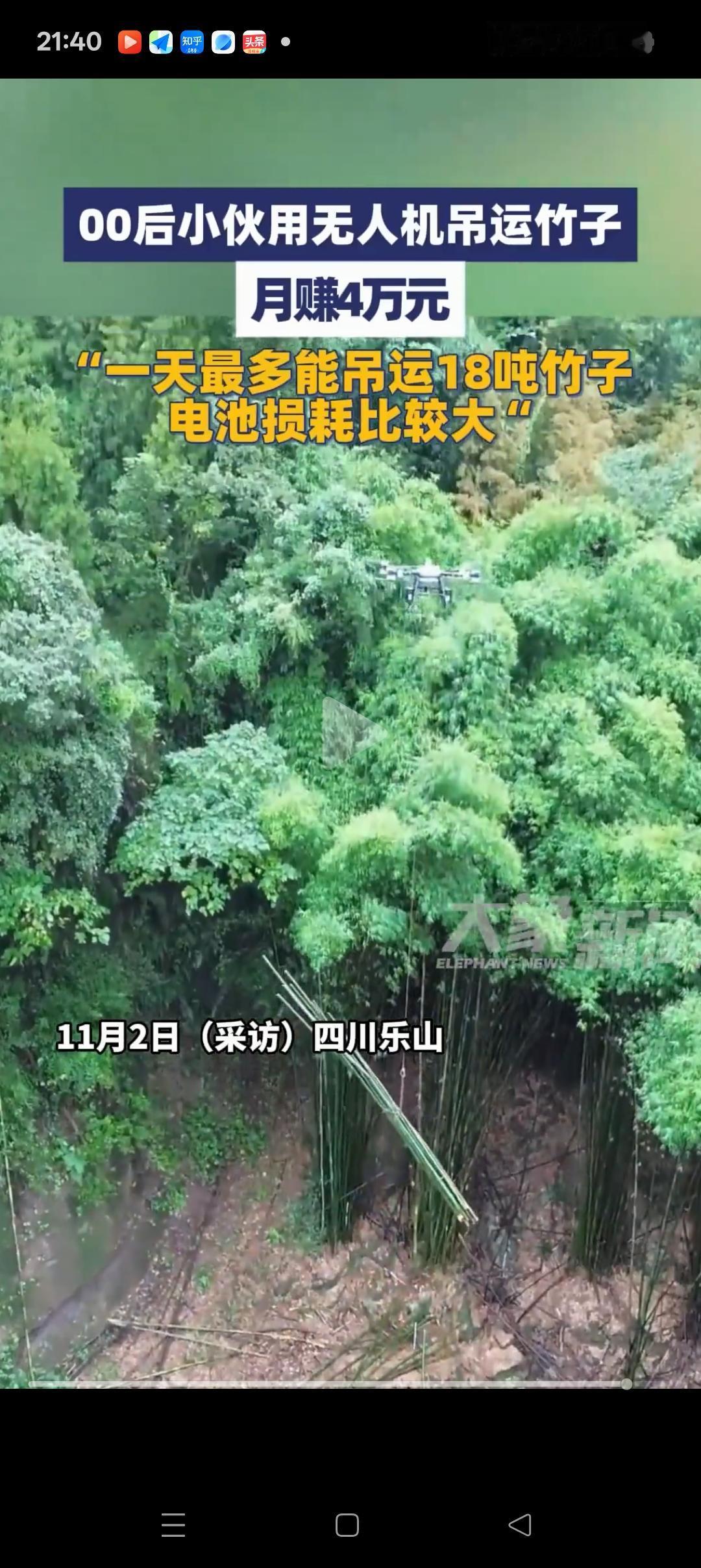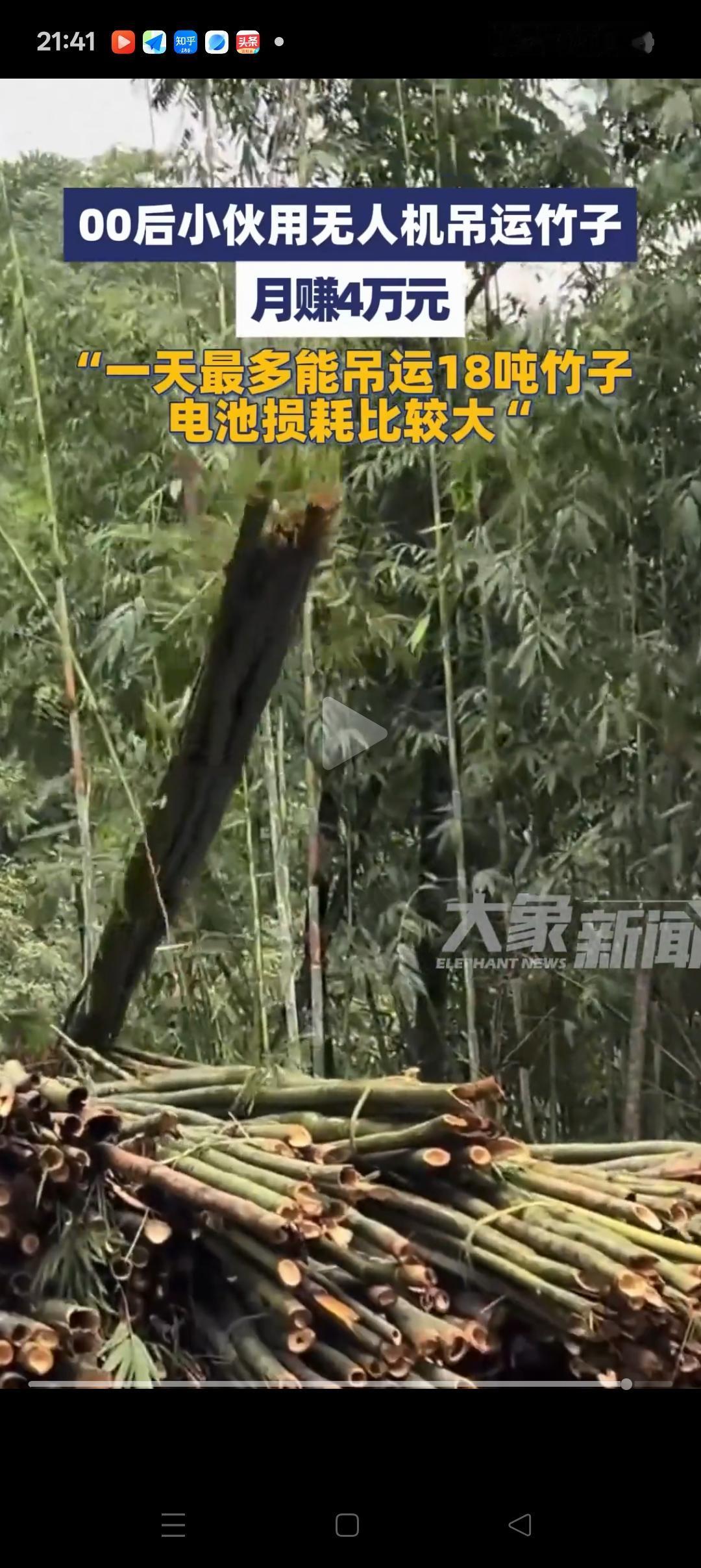 “还是年轻人脑子灵活”,四川,00后小伙因父亲搬运竹子摔了,于是买了一架无人机吊运竹子,一天最多能吊18吨,一个月赚40000块钱。 算了下,一个月赚40000块钱,那就是每天收入1300多。1300在除以18吨,意味着每吨竹子运出来的成本在70多块钱。 这还不包括车子的运费,人工砍竹子的费用,加起来成本估计有100多块钱一吨,就感觉有点高。 即使这个成本能接受,一个无人机一天18吨,也是基本不可能完成的任务。除非无人机不间断作业,他可以配备好几个电池,不断的充电。 反正想了想,这钱也不是那么好赚的,还是年轻人胆子大,脑子灵活,佩服。。