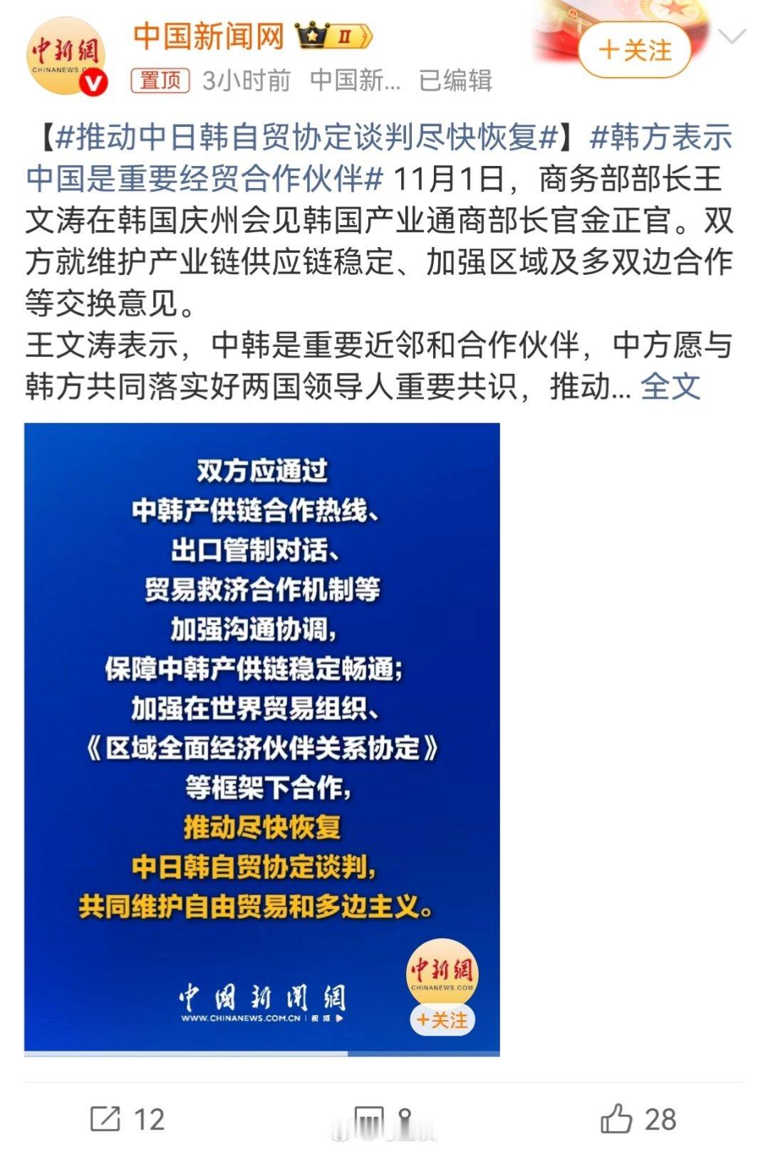 推动中日韩自贸协定谈判尽快恢复好!虽然有牢美从中作梗,这个协定很难达成,但是很
