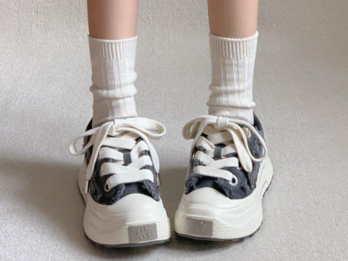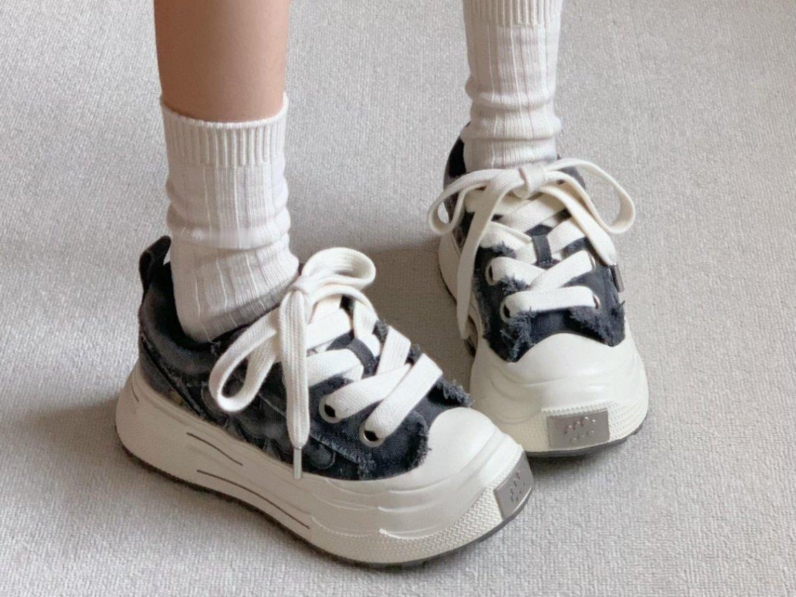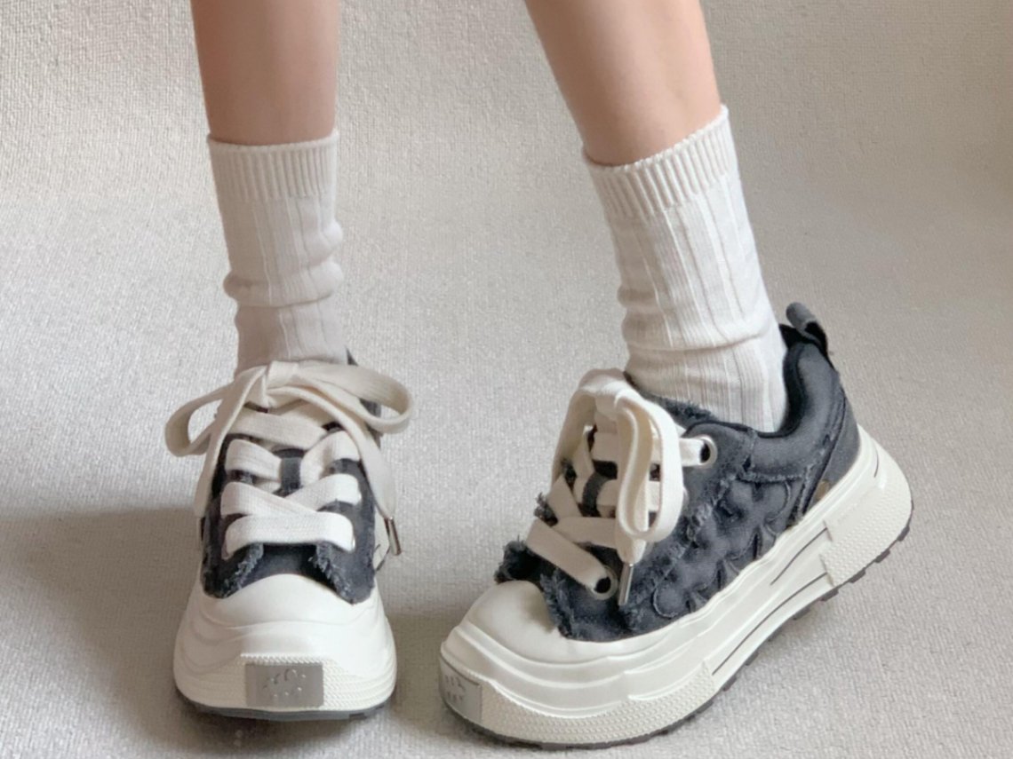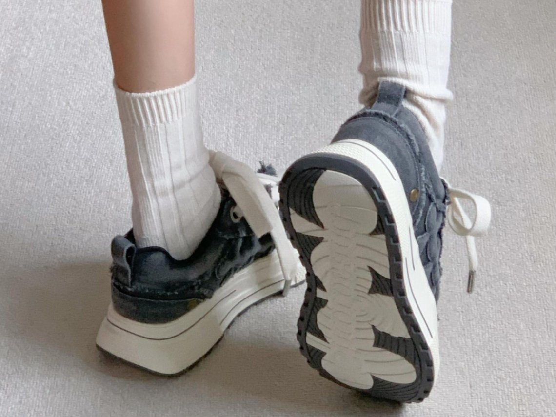 搭配白色堆堆袜,简约又不失层次感,日常出街配牛仔裤,走甜酷风搭短裙,都很合适。这种风格融合了复古与街头潮流,既保留了帆布鞋的休闲随性,又通过做旧和厚底元素打造出独特的时尚感,是近几年年轻群体很爱的鞋款类型,轻松就能穿出个性与态度。