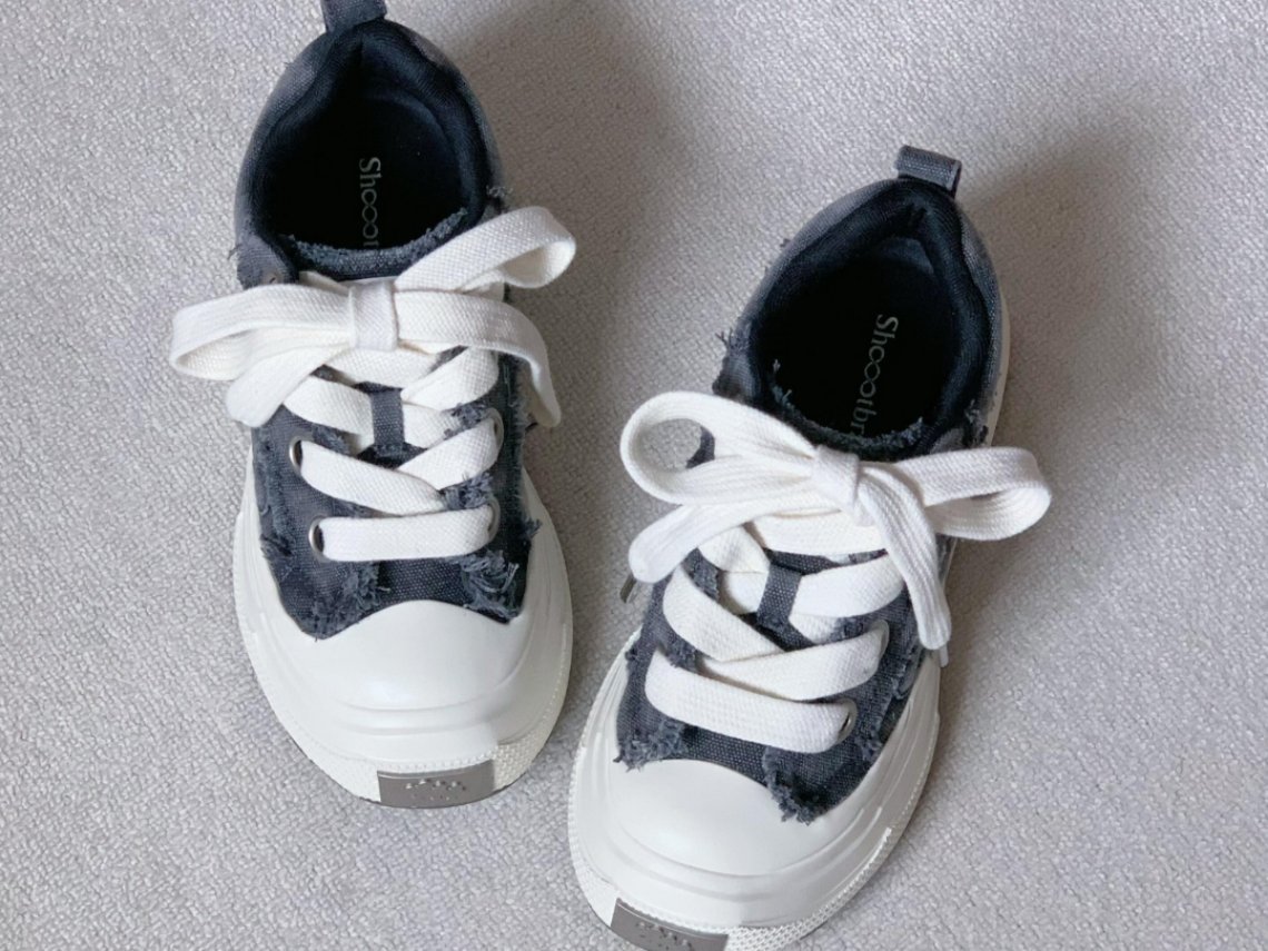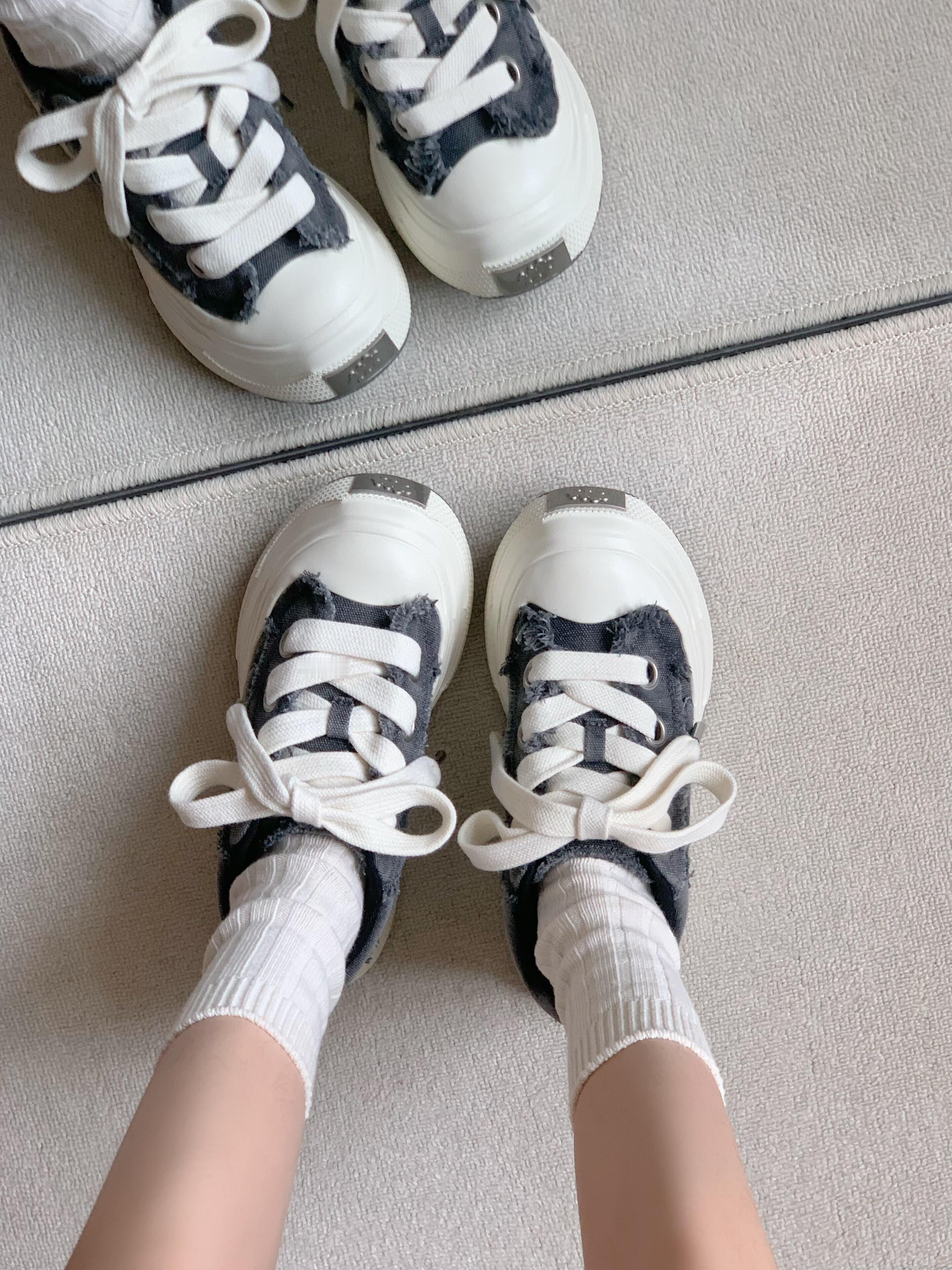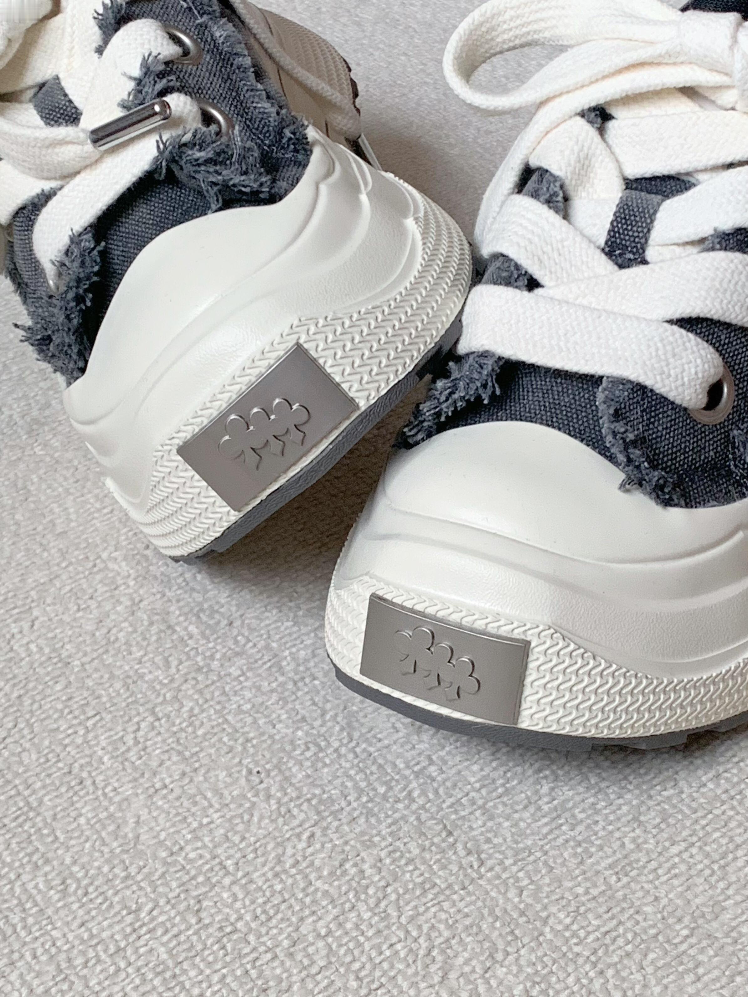 当下很火的做旧风厚底帆布鞋,深灰色,鞋面做旧毛边设计很有复古感,搭配米白色鞋带和鞋头,形成经典撞色。厚底设计不仅增高显腿长,还自带潮流感,鞋头的金属饰片增添细节亮点。
