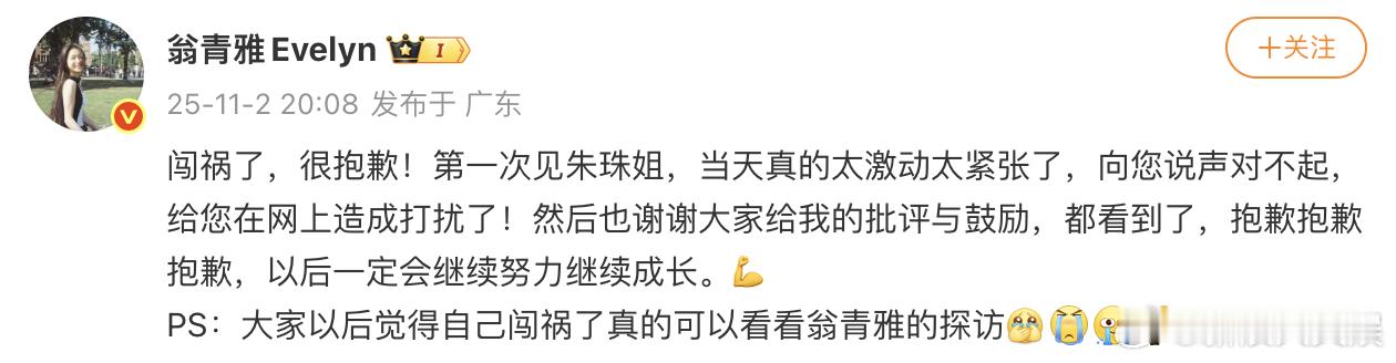 朱珠回复翁青雅没关系11月2日,翁青雅道歉后,朱珠评论回复:“没关系,