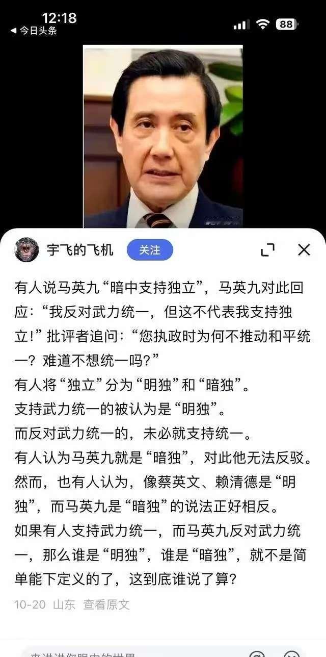 马英九终于说出了心里话,表示他反对武力统一,但并不支持独立。 说白了,不支持武力统一,但是和平统一又不积极地争取,那不是台独是什么呢? 马英九到现在了,还在为自己找借口,当初要不是他提出的“三不政策”,国民党也不会在台湾大选中成为在野党,更不会离开祖国这么这么长久。 而台湾回归,哪一次不是武力收复呢?明朝的郑成功,清朝的康熙,还有日本交出台湾岛,哪一次不是都是由武力来决定的。 说到底,大陆其实也不想动武,因为两岸人民同宗同族,但是台湾不跟大陆谈怎么和平统一啊。 所以怎么统一台湾说什么也没用,不是吗?任他们花言巧语,台湾必须尽快彻底实现统一,统一以后再说怎么建设和发展台湾。
