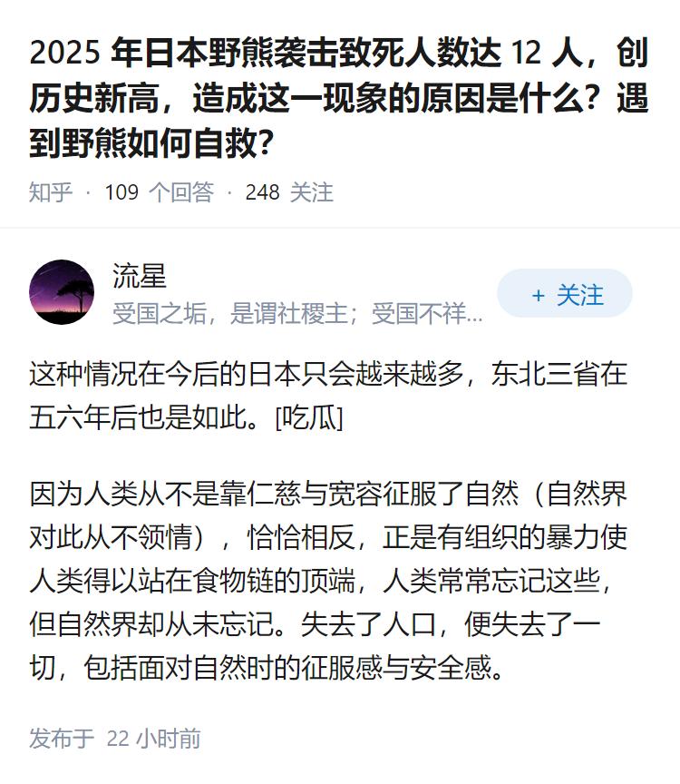 2025 年日本野熊袭击致死人数达 12 人,创历史新高,造成这一现象的原因是什么?遇到野熊如何自救?