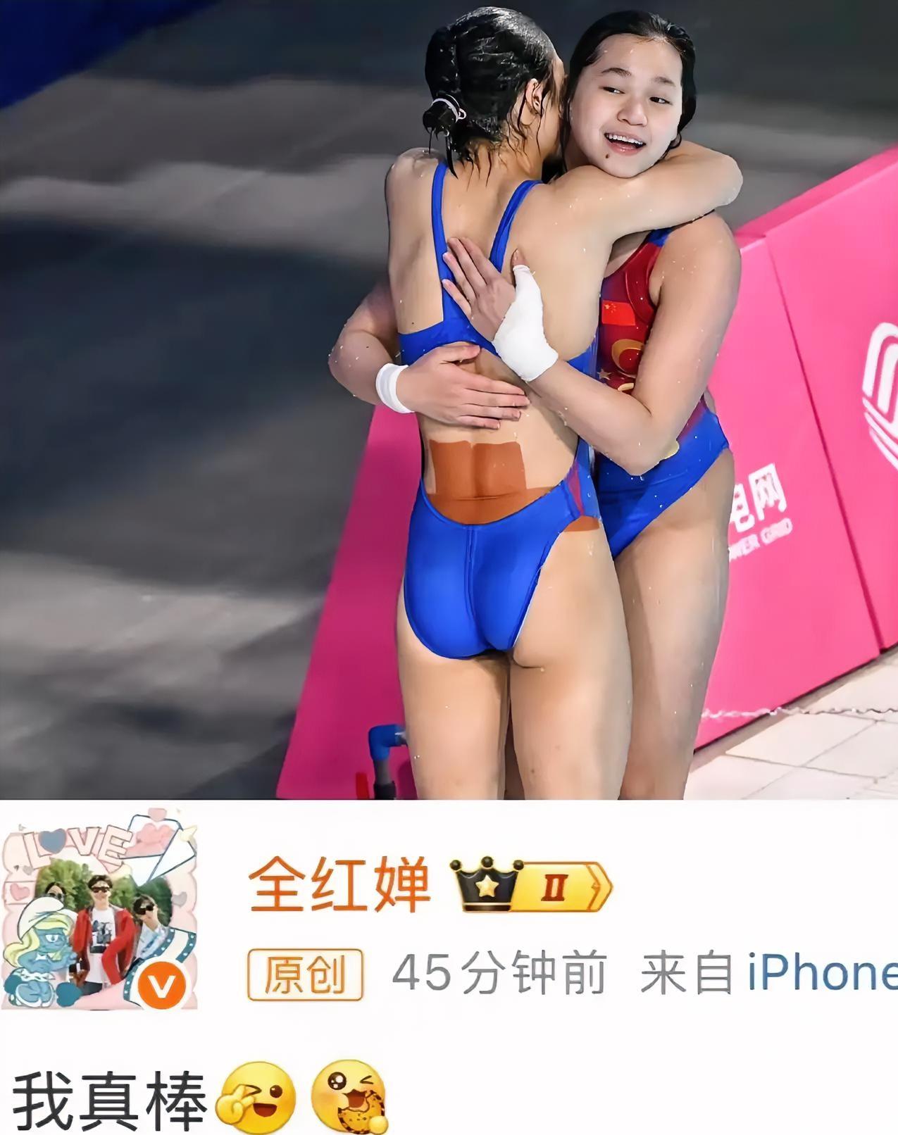 11 月 2 日晚, 广州奥体中心热闹非凡, 第 15 届全运会先期开赛的跳水比赛决出首金。强大的广东女子跳水队以 2369.80 的总分摘得女子团体冠军,其中最让人瞩目的当属全红婵。 这是全红婵时隔 183 天伤愈后的首秀,在双人 10 米跳台中,她与搭档王伟莹配合默契,一举拿下这个项目的第一名,为广东队夺金立下大功。原来,开赛不久前全运会官网就显示,全红婵只参加女双 10 米跳台比赛。自今年 5 月 3 日世界杯总决赛后,她养伤、休养,还在广东封闭训练,这 183 天没出战任何赛事。 赛后,全红婵发文 “我真棒”,简单三个字,自信尽显。她复出首战夺冠背后是无数汗水与坚持,这份努力和她直爽自信的性格,太让人喜欢了!
