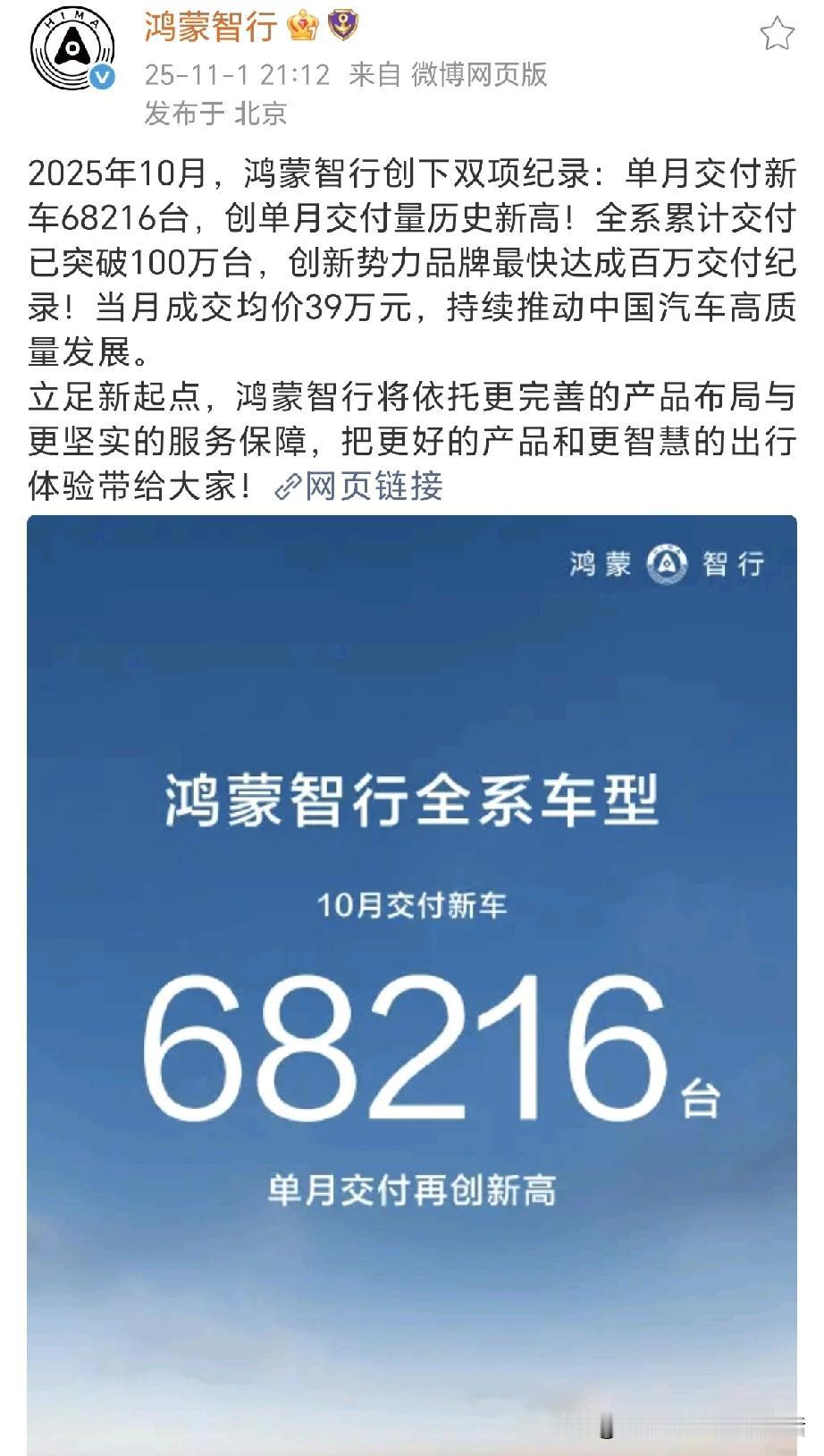 孙少军:赛力斯10月销量51456辆, 要不是孙少军发出来,大家都还蒙在鼓里,原来问界已经这么强了,赛力斯发布10月产销快报,10月销量51456辆,创历史新高,今年1-10月累计销量356085辆。 ​​​ 我们再来看看鸿蒙智行的销量数据,2025年10月,鸿蒙智行单月交付新车68216台,创单月交付量历史新高!这其中问界就有51456台,占到了75%。 张老板自己都没想到会这么火爆吧,估计做梦都要笑出声了! 问界车主说:“关注问界M7挺长时间,它的安全性让我更加坚定了这份选择。主动安全系统介入反应快;车辆对刹车距离的控制精准,刹车过程平稳不突兀,每处细节都透着扎实的安全实力。” 赛力斯集团董事长(创始人)张兴海表示: “问界的每一位用户都是问界珍贵的火种,我相信星星之火可以燎原。”