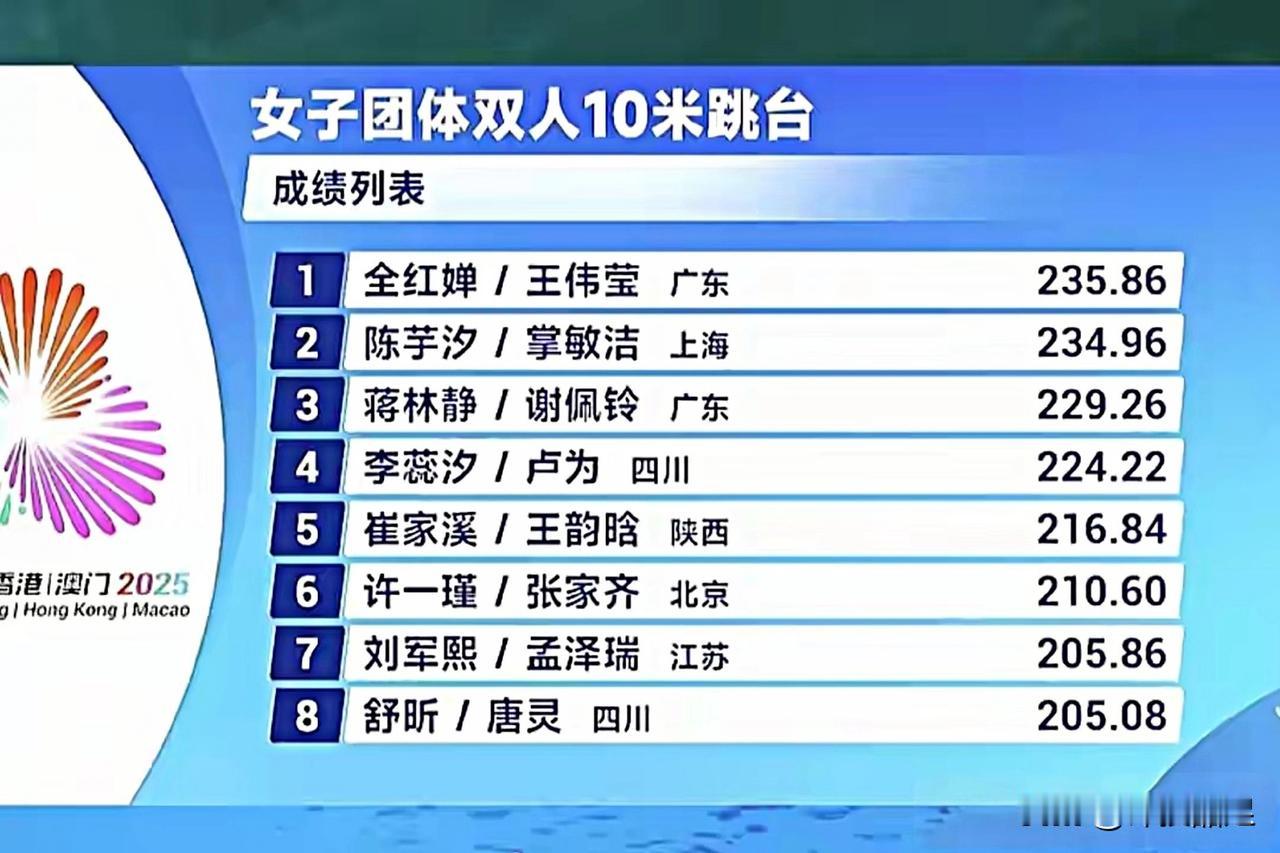 昨晚全运会女子跳水团体决赛,伤愈复出的全红婵发挥稳定,裁判全给8.5分,与之一争高下的陈芋汐也有不错的表现,但裁判给分并不统一,有给8.0分的,也有给8.5分的,还有给9.0分的。网友戏称,给9.0分的是上海裁判,给8.0分的是广东裁判。也有网友说,给9.0的是印象分,给8.0的是实际分。最终广东队的全红婵/王伟莹组合还是众望所归,以0.9分的微弱优势力压上海队的陈芋汐/掌敏洁组合夺得冠军。