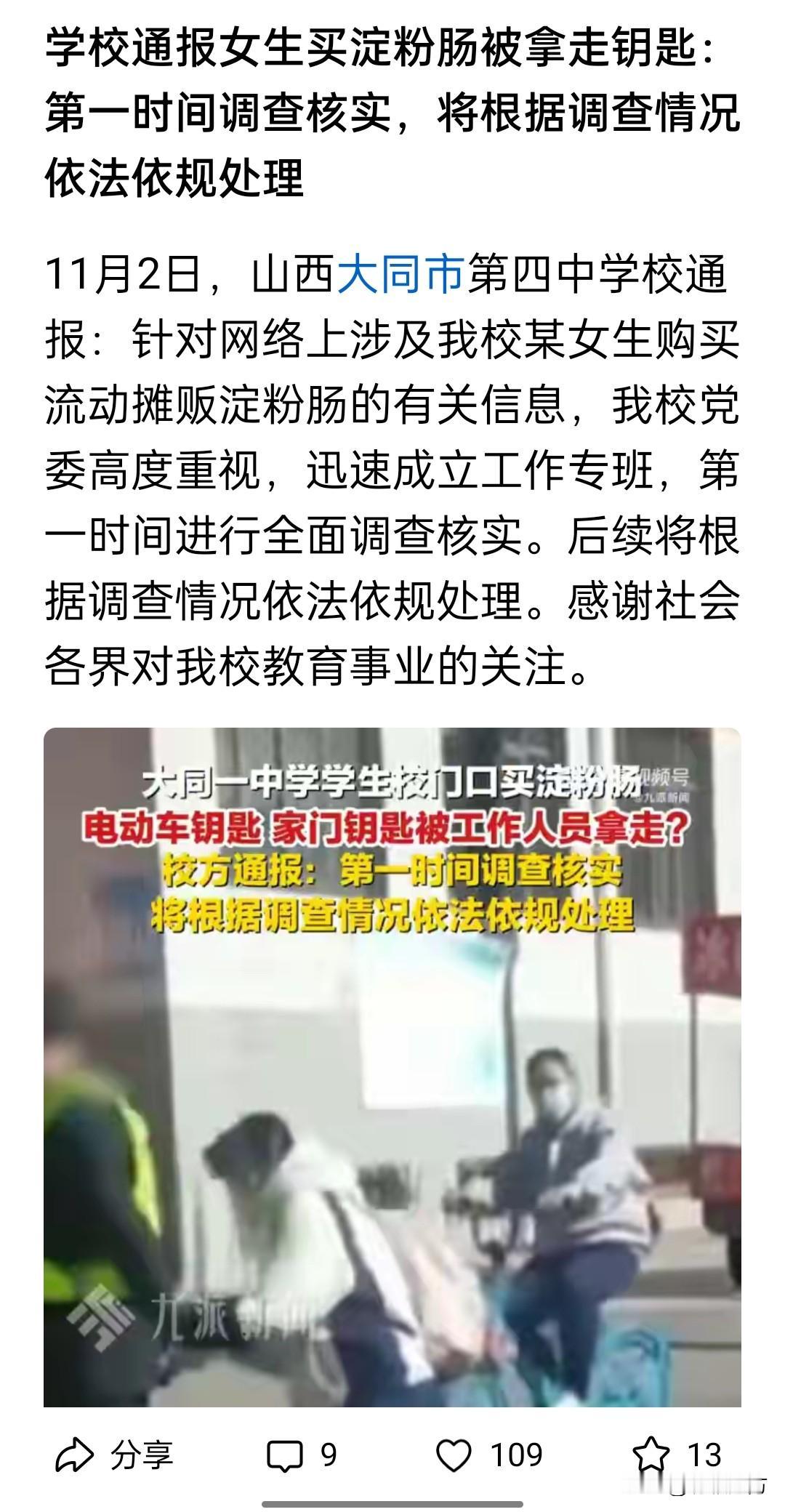 大同四中一女生在校门口买淀粉肠,被学校工作人员拿走电动车钥匙和家门钥匙。第二天学校发声明称第一时间成立专班进行调查核实。 事情本身并不复杂,学校有没有权力管理学生在校外的用餐行为?是不是可以强行扣压学生的私人物品?我想都是没有的。一件简单的事件,在第二天发声明的时候还没有调查清楚,可能难的不是调查,而是怎么给事情定性,要不要追责?追责到哪一级? 一位校领导说事件已经上报,并称视频有夸大成分,但到底是哪里有夸大却没说,是学生的哭叫声太大了?没人愿担责能担责,才是小事件揭示出的大问题。大同中学
