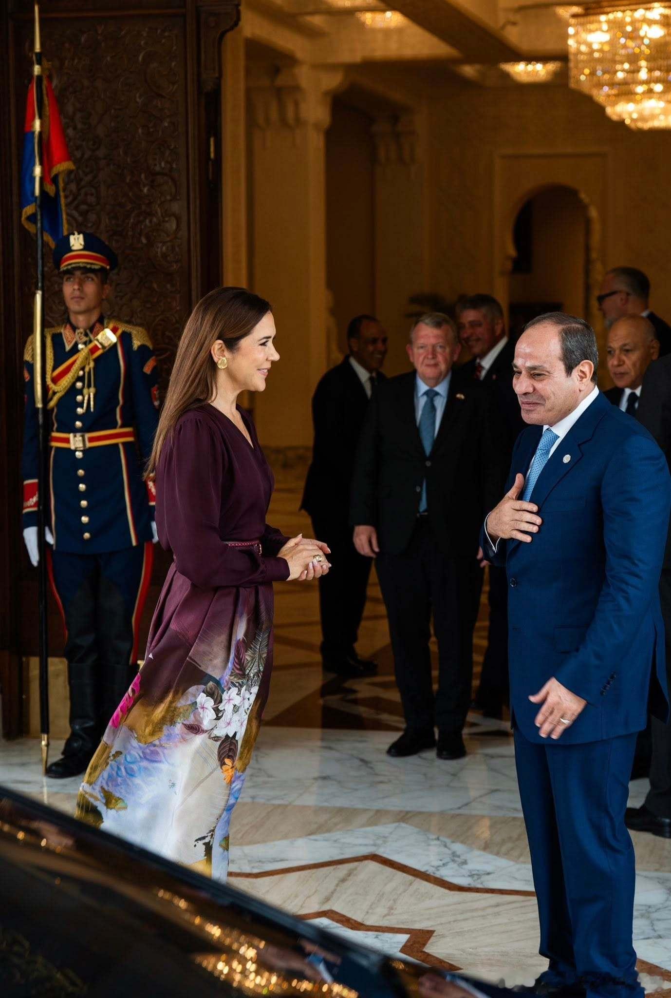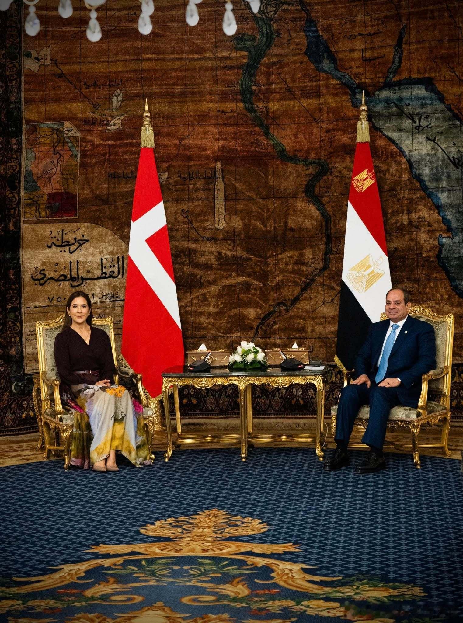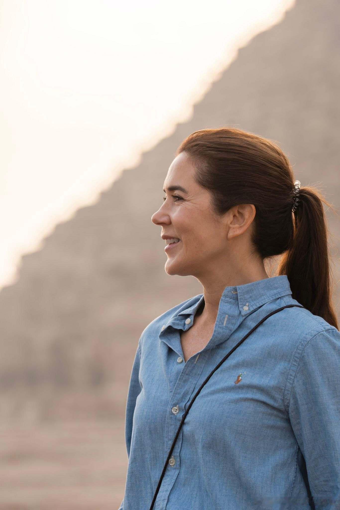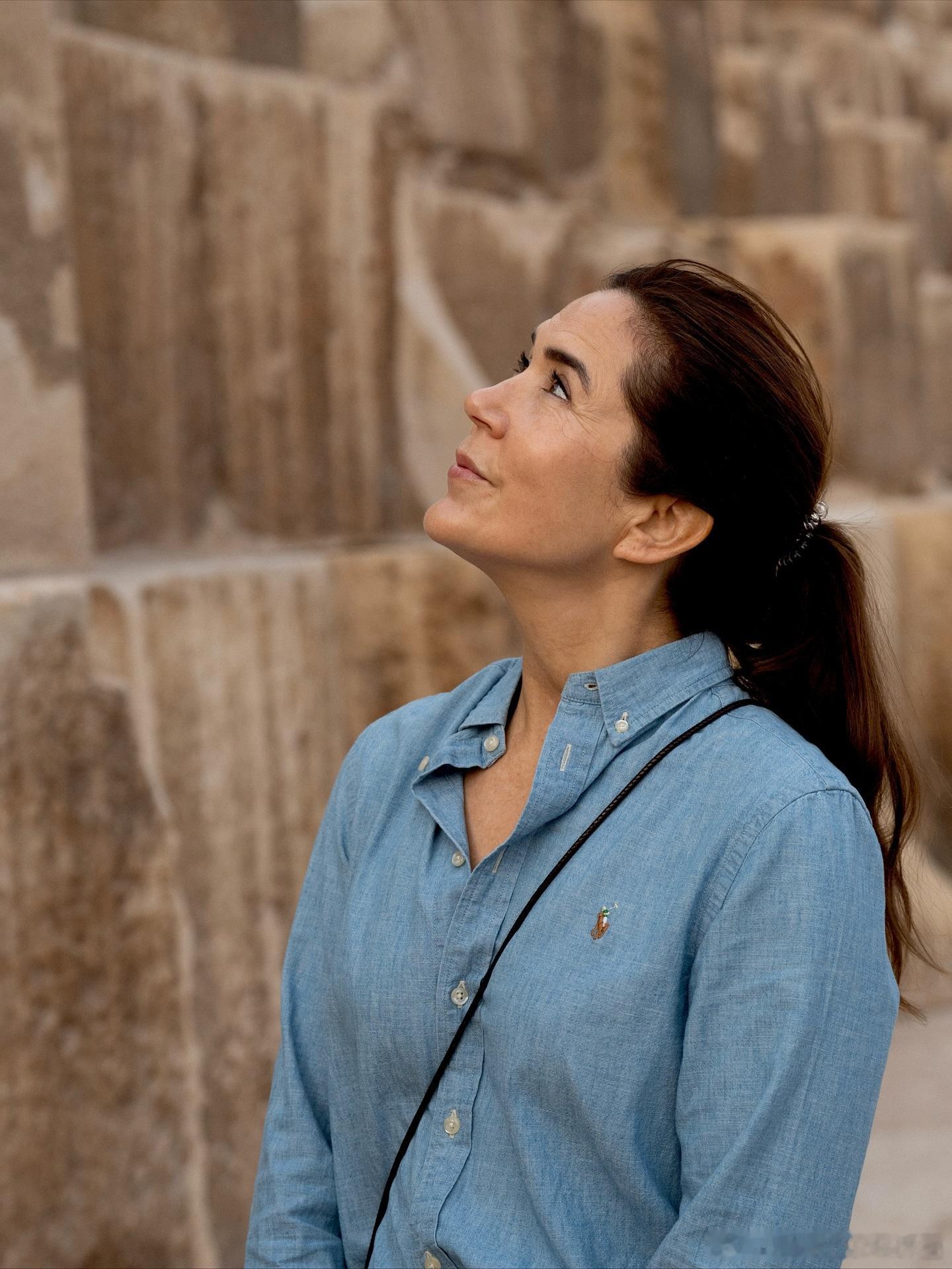 新闻 2025.11.2 丹麦王后玛丽访问埃及,出席大埃及博物馆开幕庆典的后续,被准许在日出时胡夫金字塔进行参观,访问大埃及博物馆,最后与埃及总统阿卜杜拉·法塔赫·塞西进行会面。大玛丽的牛仔上衣来自Ralph Lauren,绿色裤装来自Zimmermann,旧红色上衣来自Jesper Hovring,摄影师上大分。