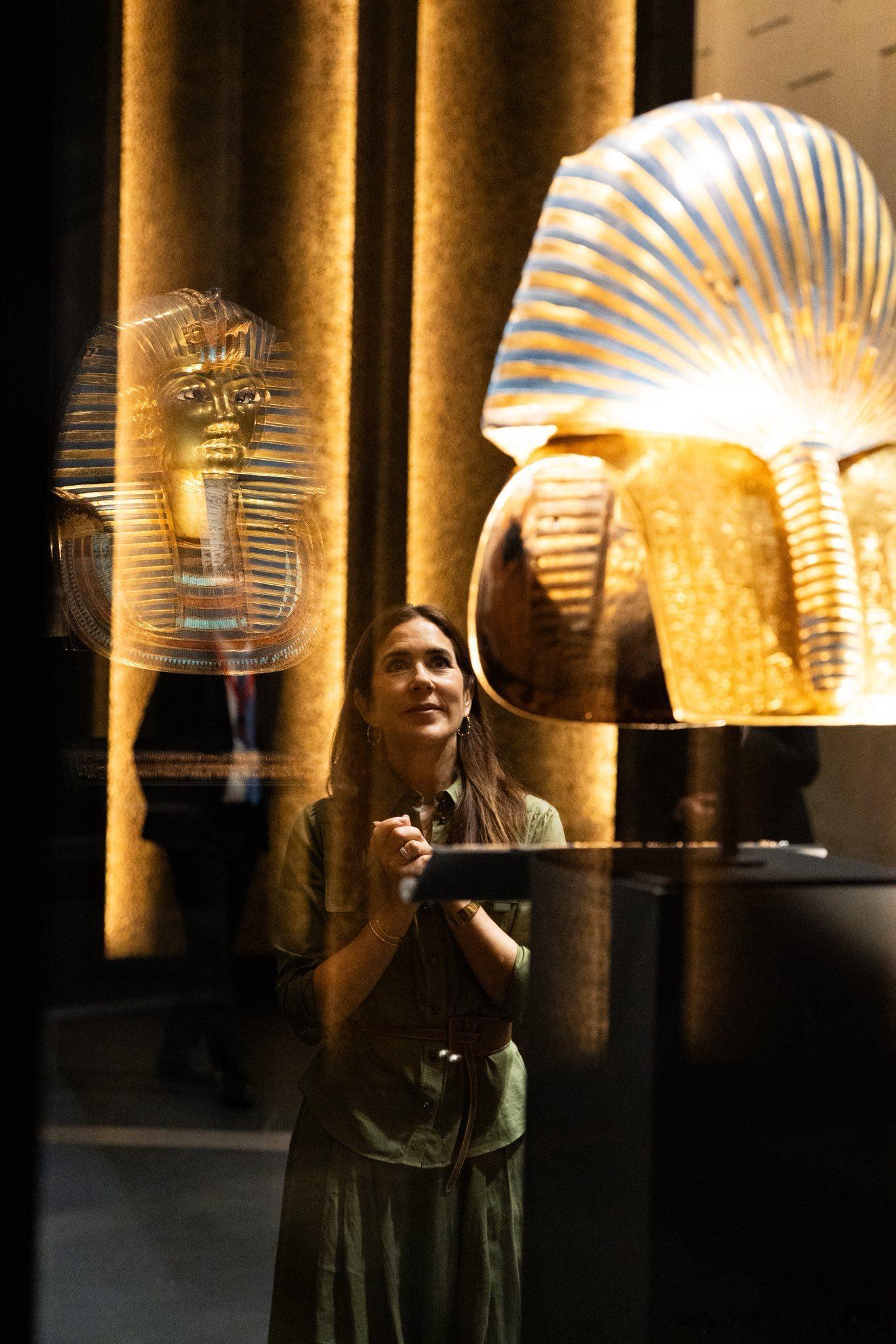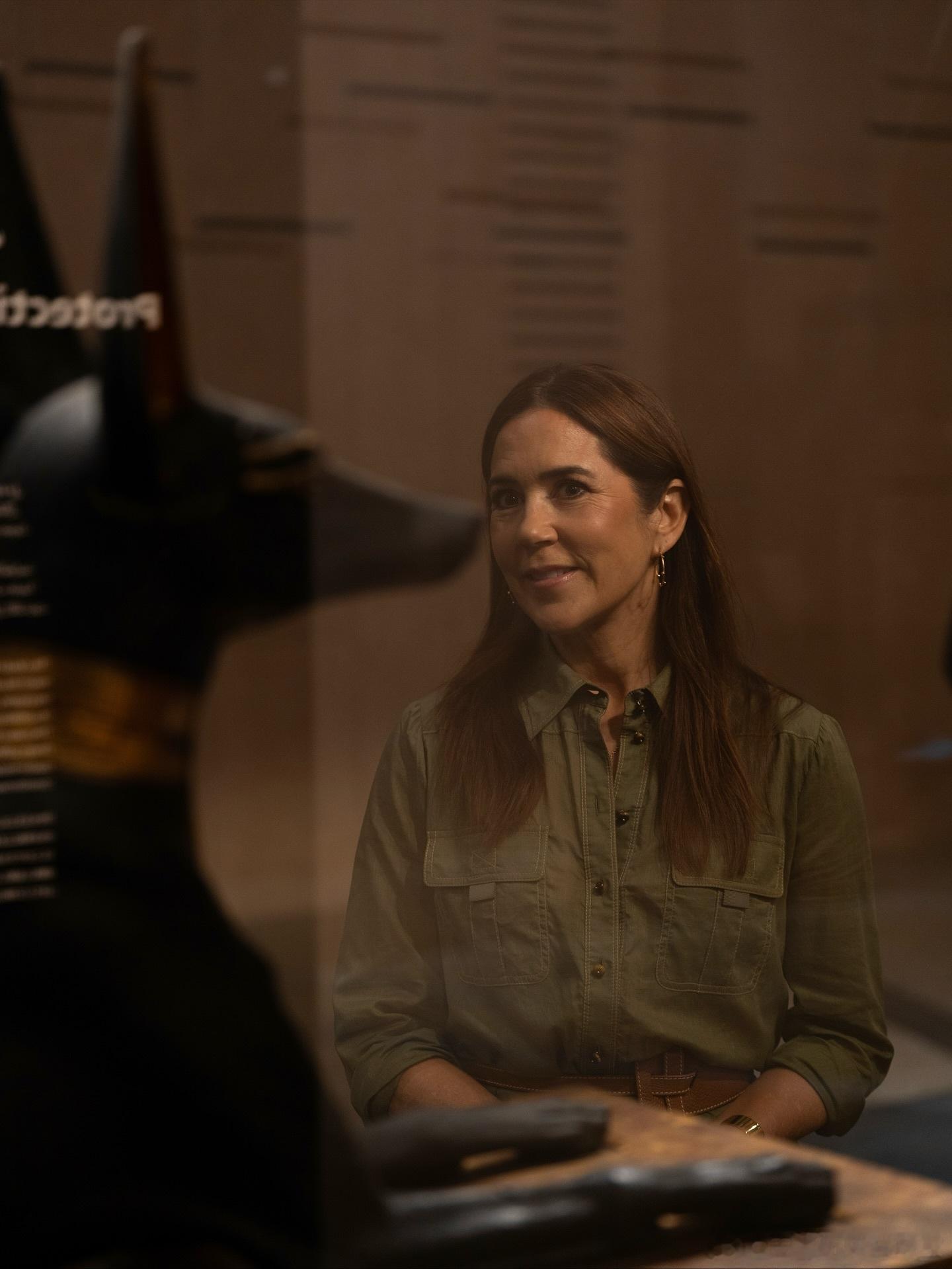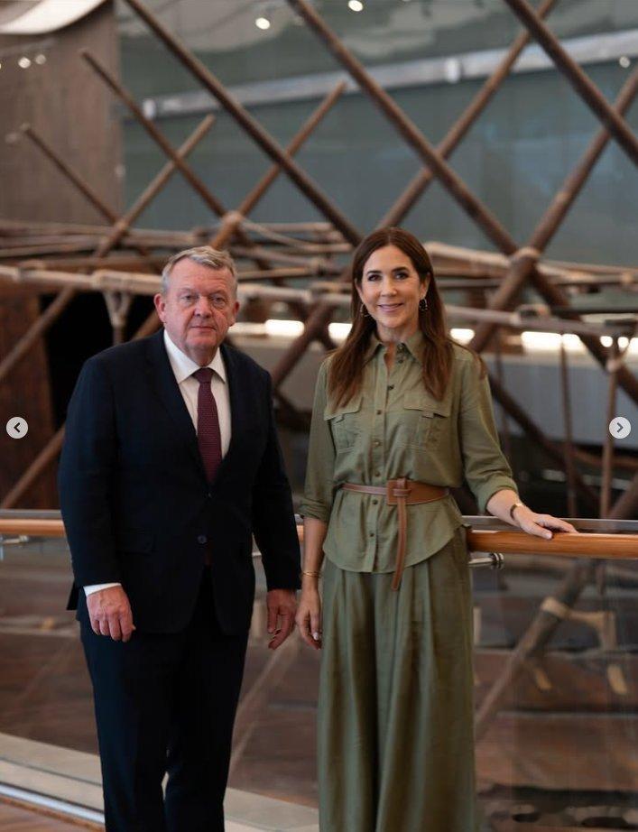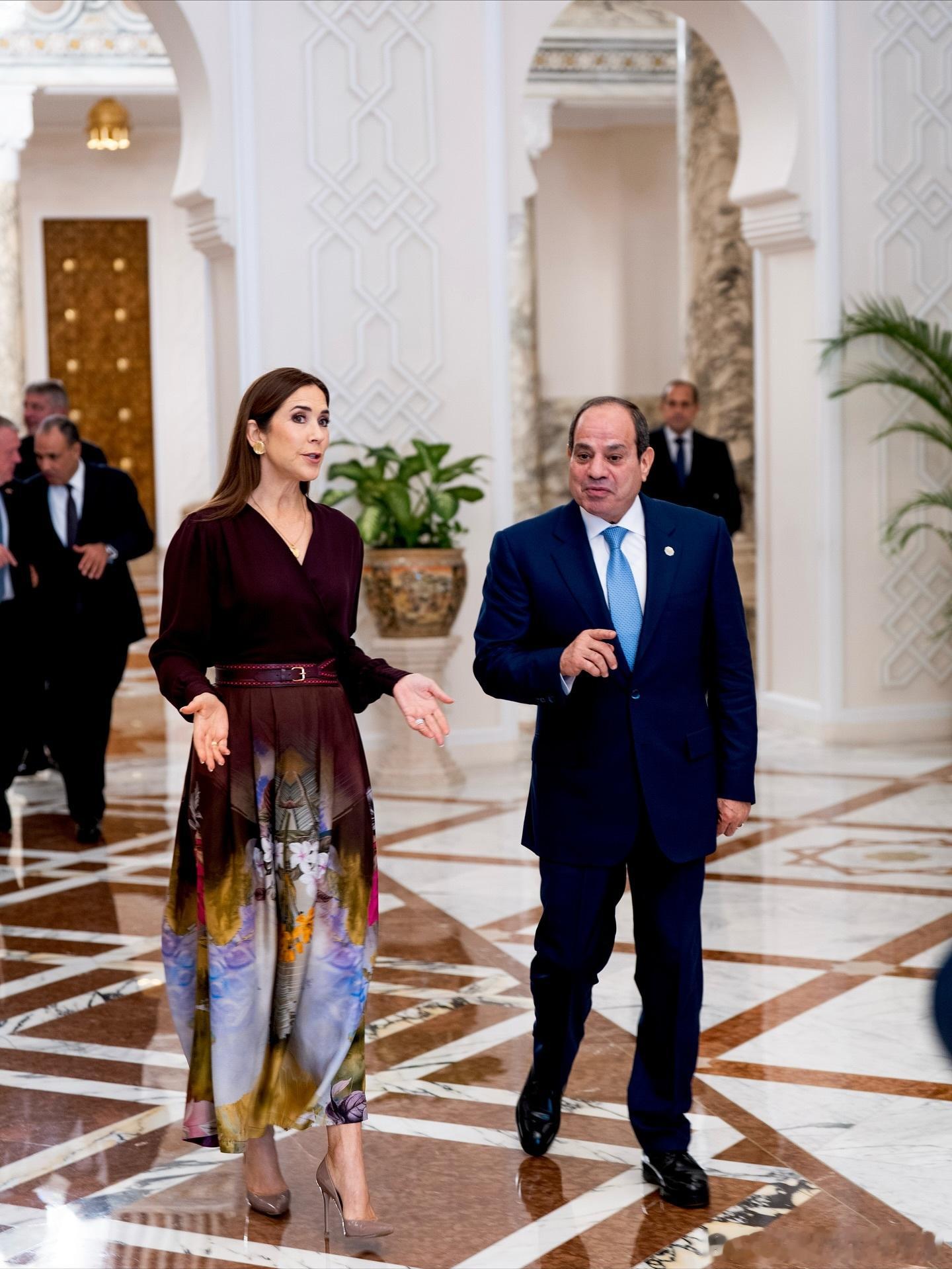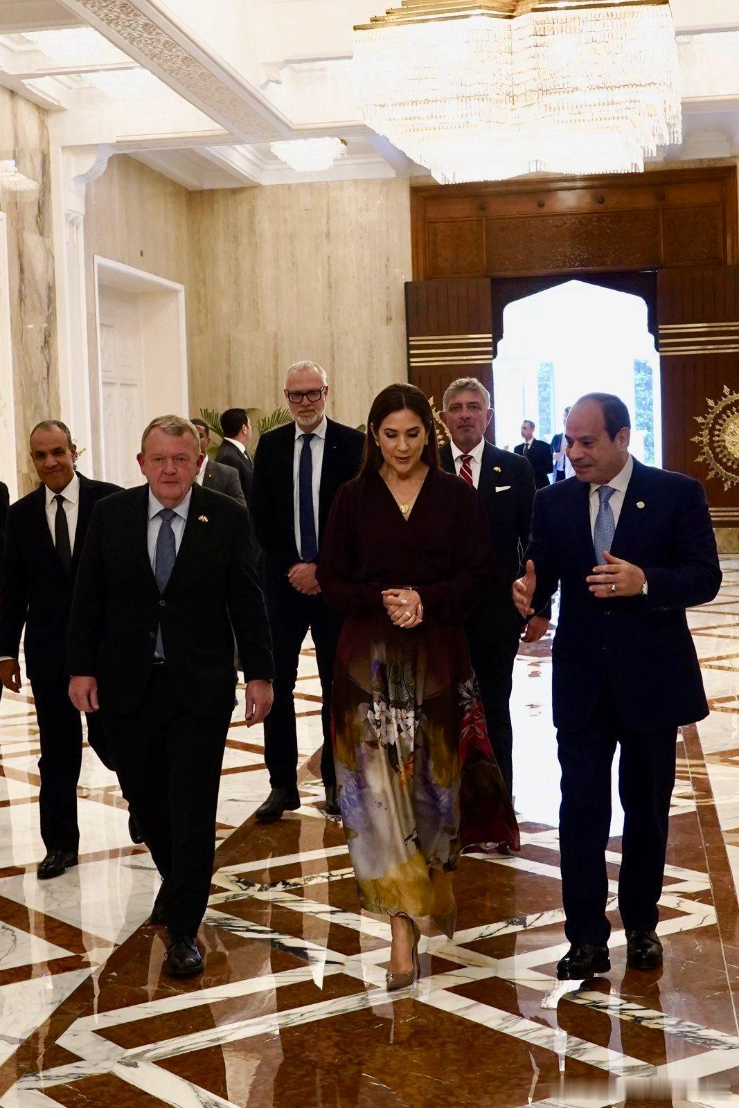 新闻 2025.11.2 丹麦王后玛丽访问埃及,出席大埃及博物馆开幕庆典的后续,被准许在日出时胡夫金字塔进行参观,访问大埃及博物馆,最后与埃及总统阿卜杜拉·法塔赫·塞西进行会面。大玛丽的牛仔上衣来自Ralph Lauren,绿色裤装来自Zimmermann,旧红色上衣来自Jesper Hovring,摄影师上大分。