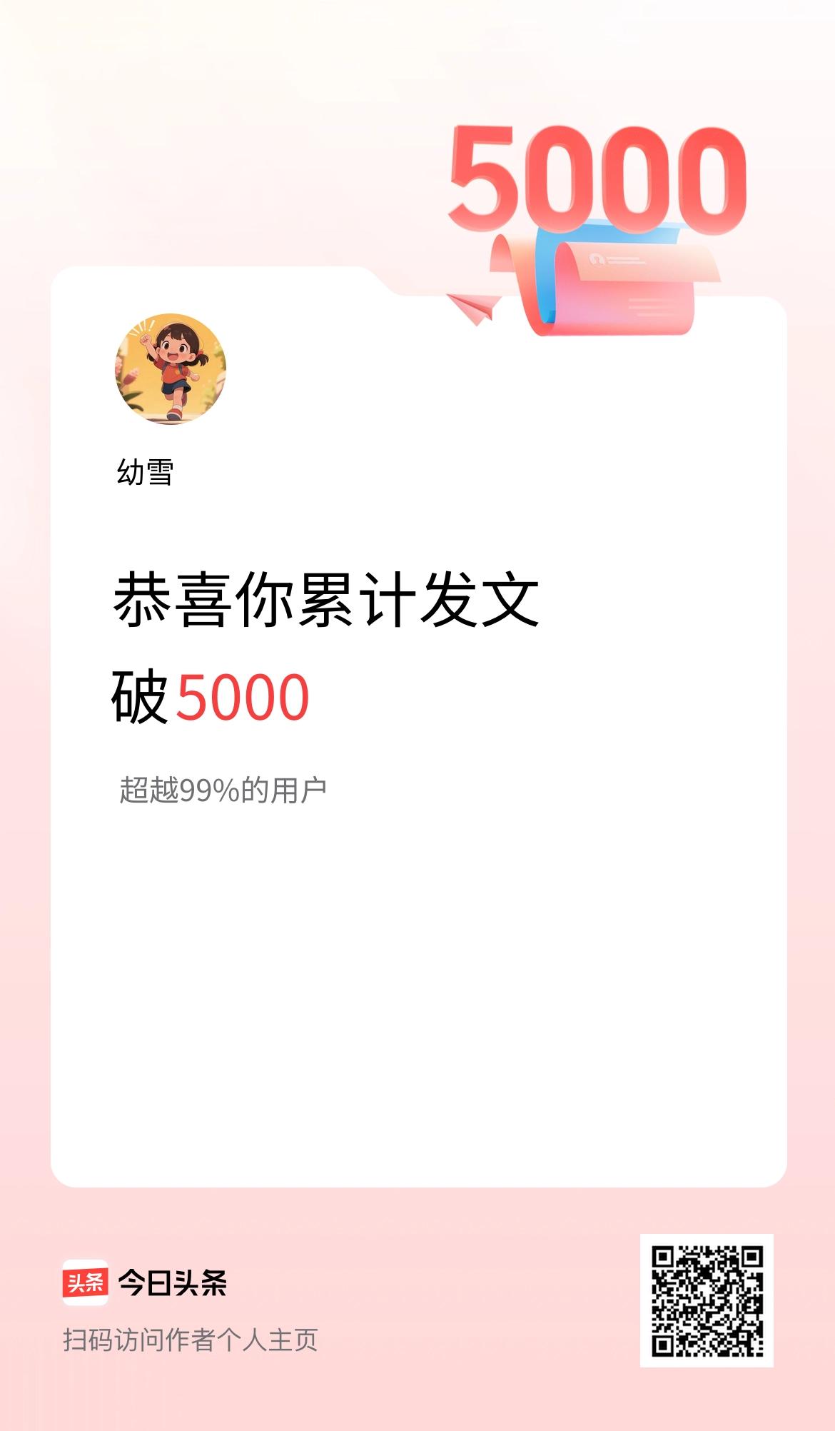 恭喜自己头条破5000篇! 这是一段充满坚持与热爱的旅程。 每一篇内容都凝聚