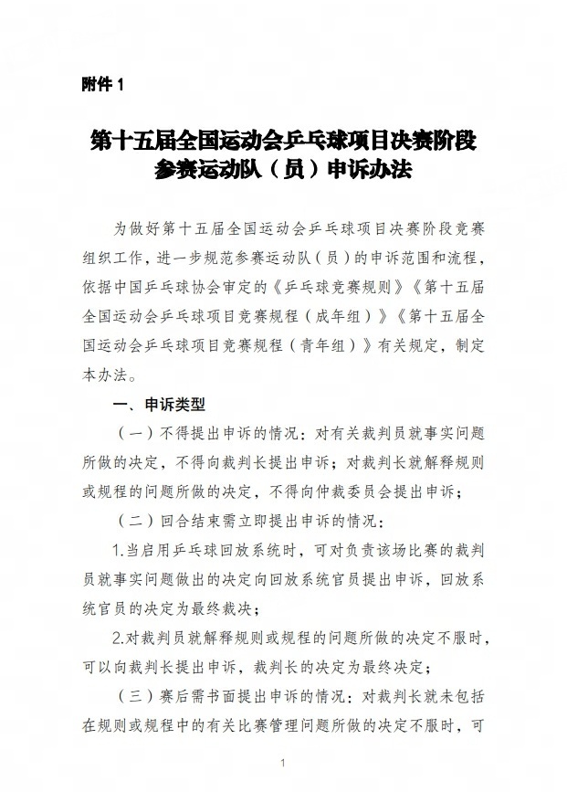 官方消息,中国乒协在官网发布《关于印发第十五届全国运动会乒乓球项目决赛阶段竞赛专项文件的通知》。就运动队(员)申诉办法、临场裁判员选派工作实施细则、乒乓球视频回放系统实施细则以及球拍检测实施细则一一公布。