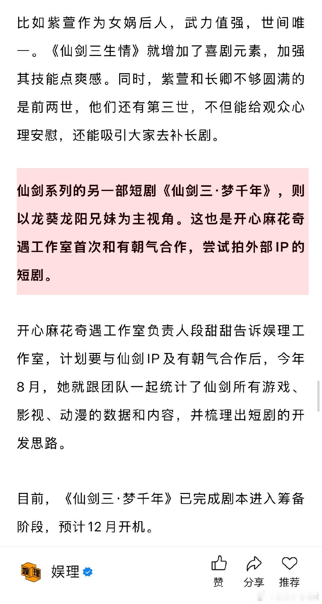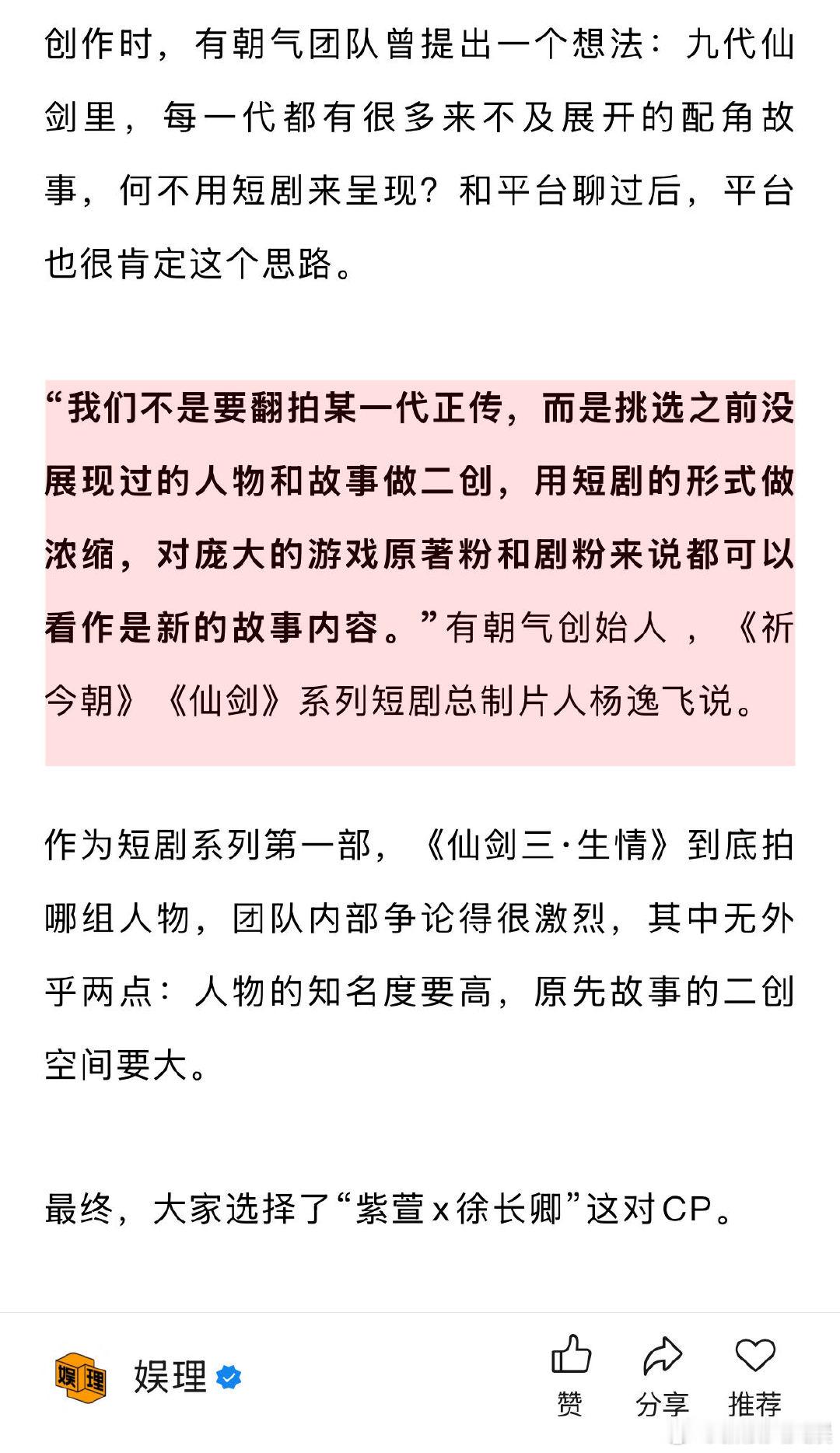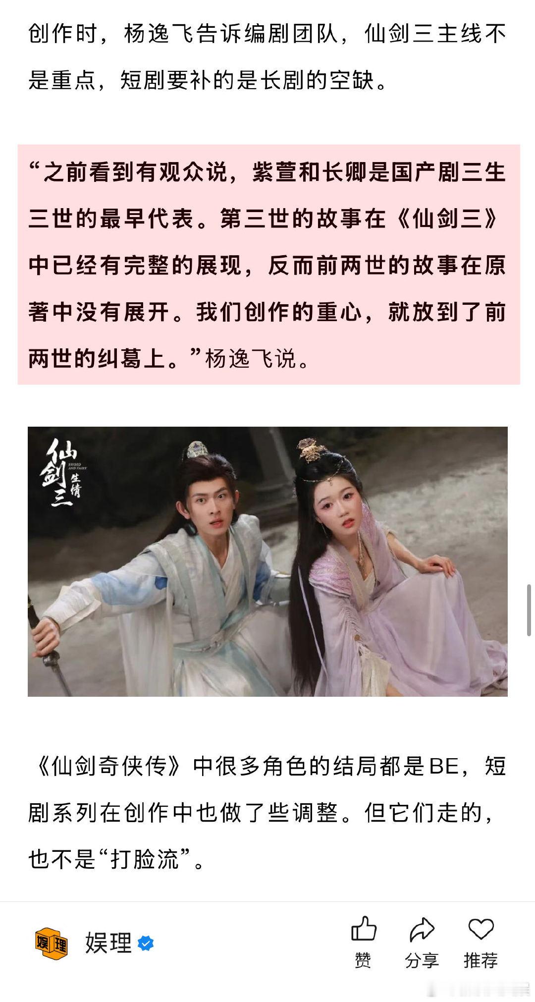 短剧仙剑将拍龙葵龙阳番外 制片人谈仙剑短剧主角是紫萱徐长卿 短剧《仙剑三·生情》选择了“紫萱x徐长卿”作为主角,总制片人杨逸飞认为短剧要补的是长剧的空缺。“之前看到有观众说,紫萱和长卿是国产剧三生三世的最早代表。第三世的故事已经有完整的展现,反而前两世的故事在原著中没有展开。我们创作的重心,就放到了前两世的纠葛上。”娱理独家↓