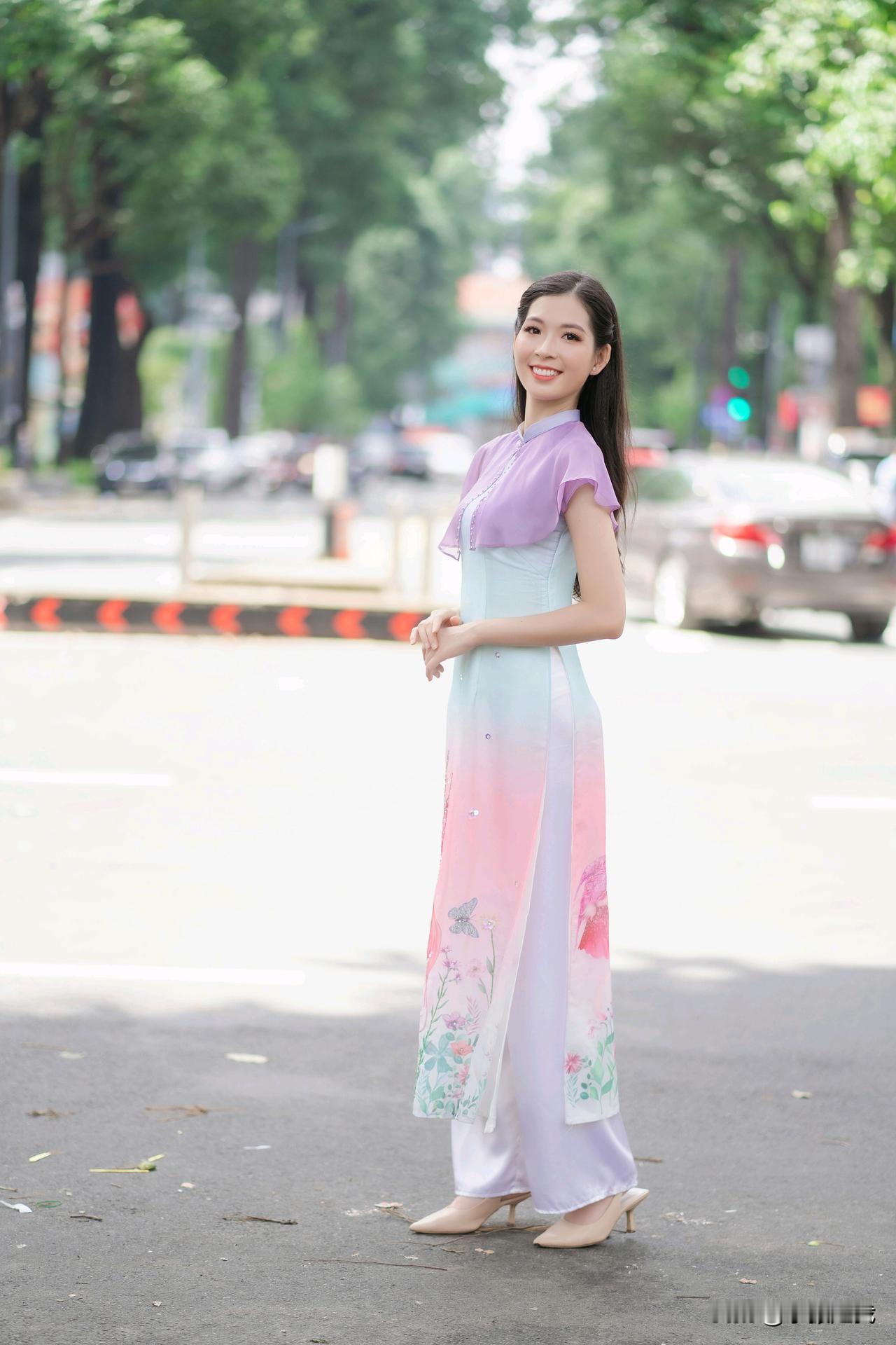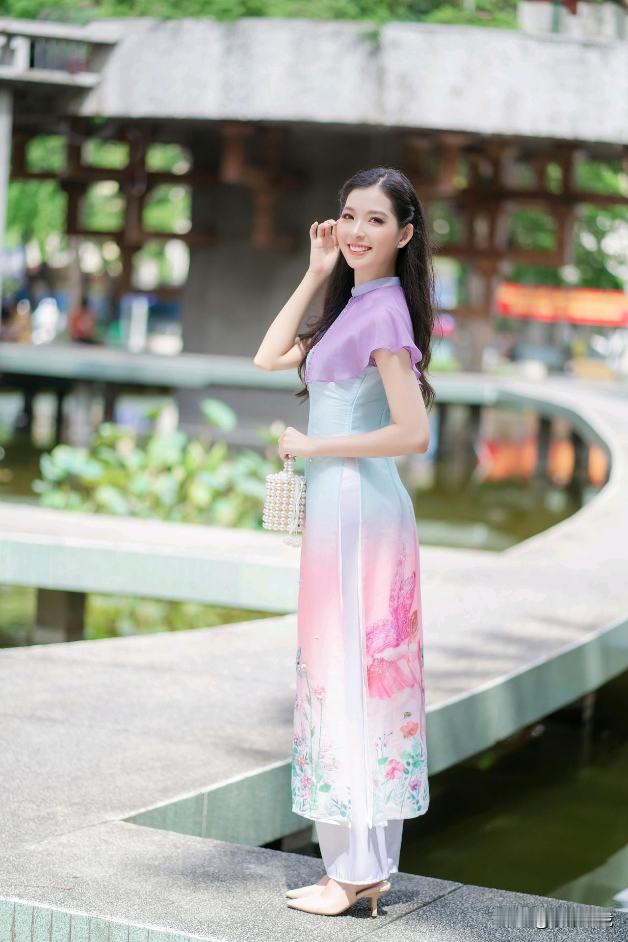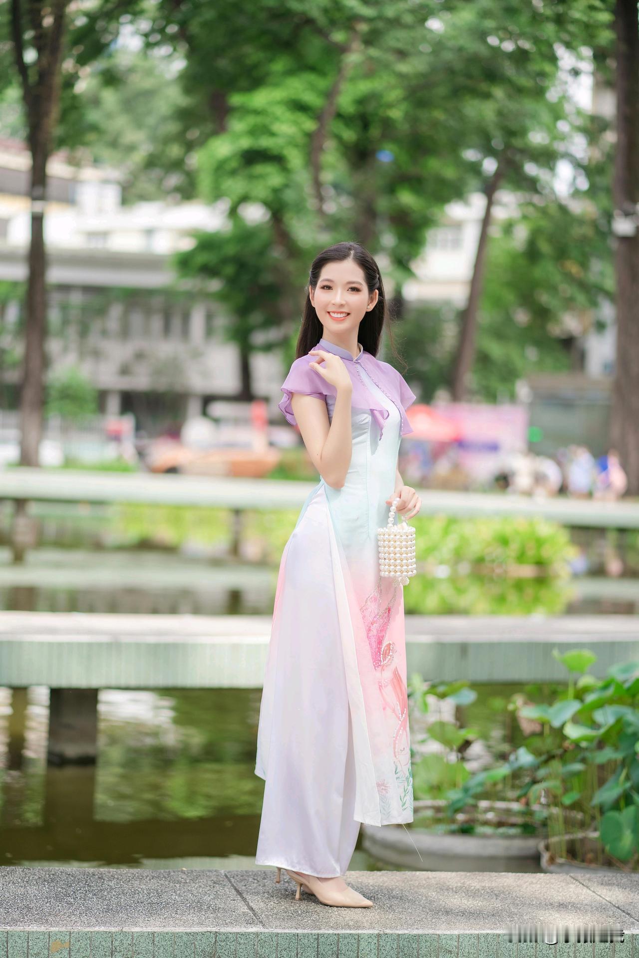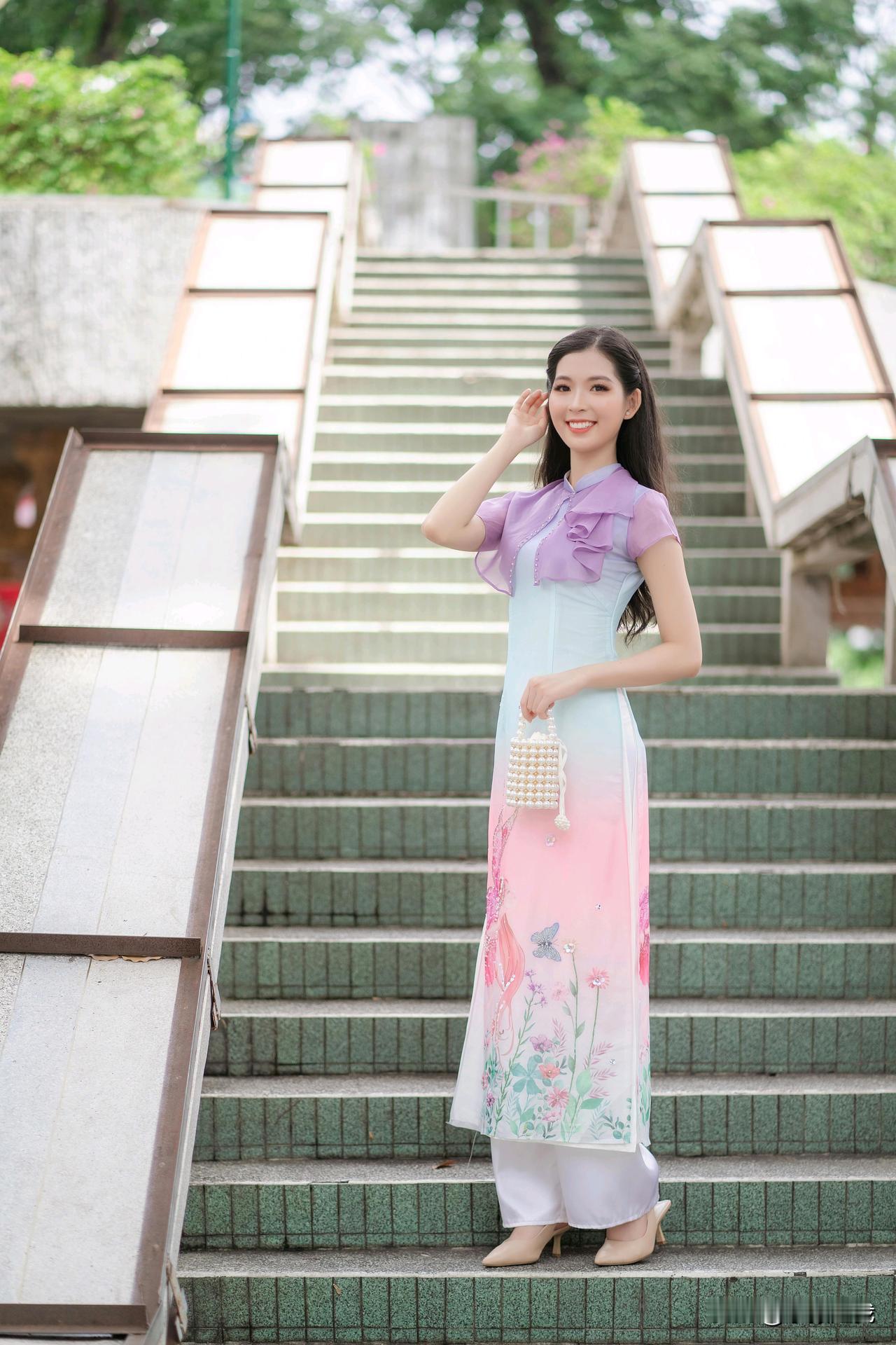 浅紫叠染青蓝,渐向粉调晕开,是夏末风里的温柔色谱。裙摆缀着蝶与花的轻梦,珍珠包曳着细碎光,步履间尽是清雅。城市的绿意与石阶作衬,将传统奥黛的婉约,织进日常的明亮里。在街拍时,如何吸引到大众的视线?