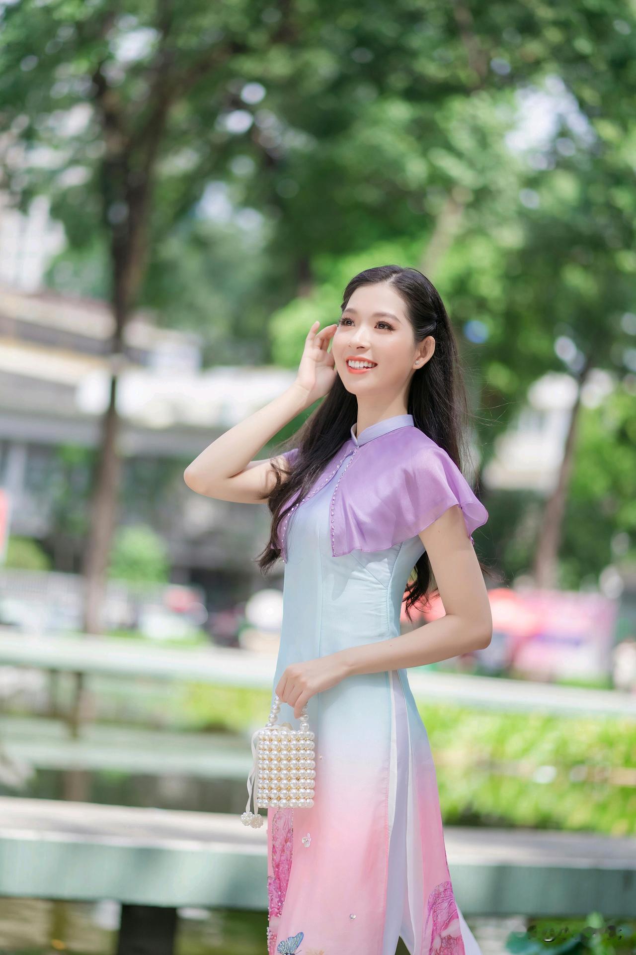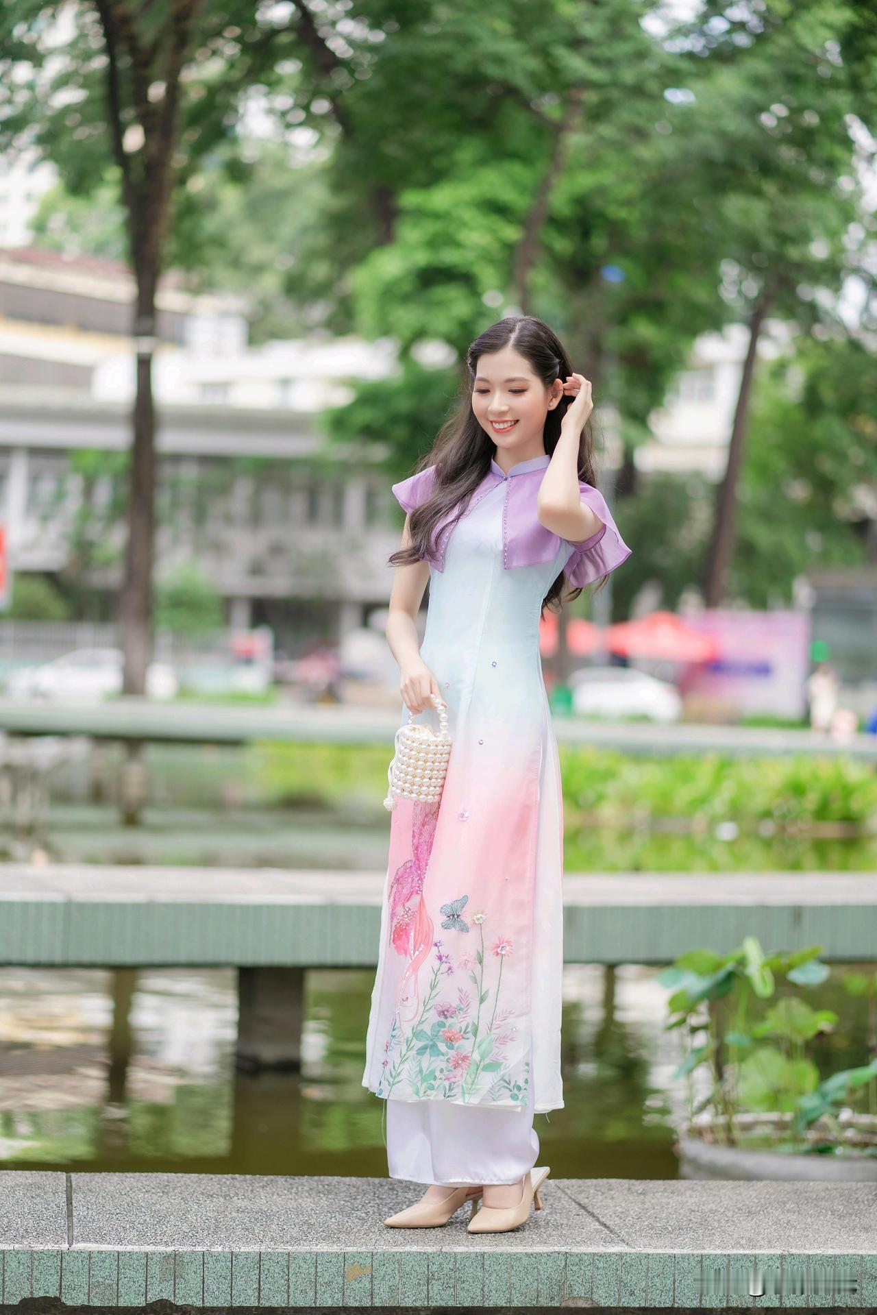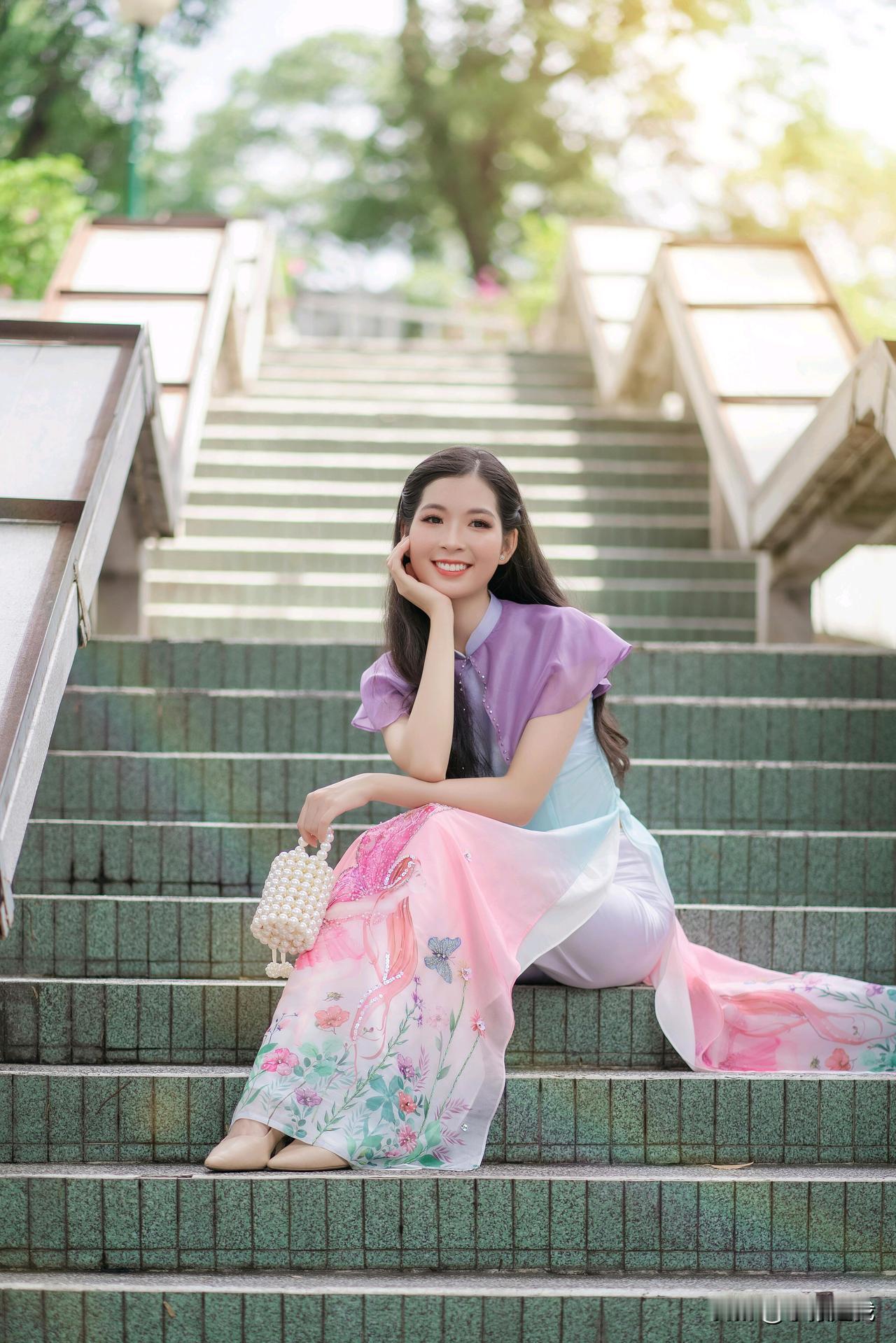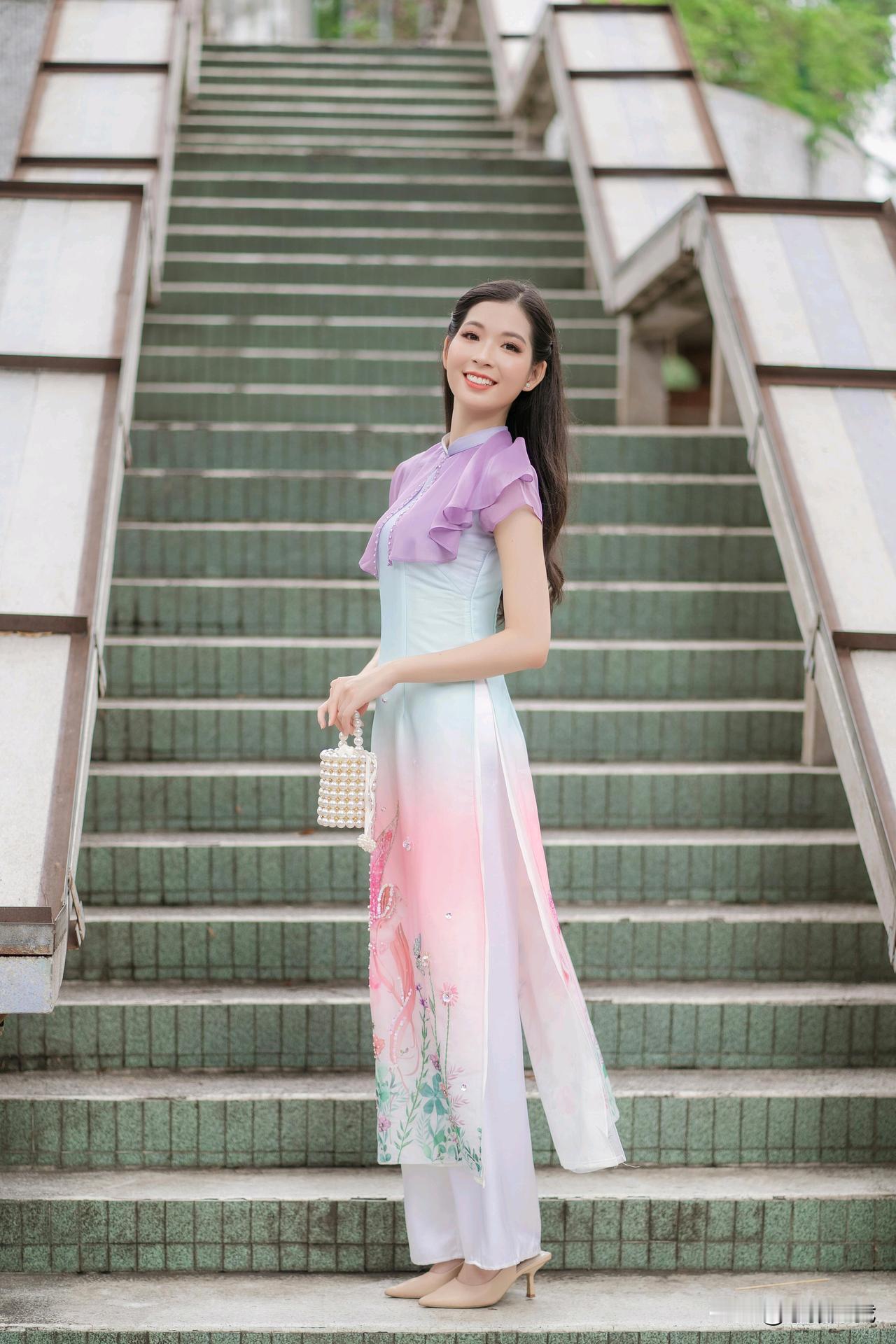 浅紫叠染青蓝,渐向粉调晕开,是夏末风里的温柔色谱。裙摆缀着蝶与花的轻梦,珍珠包曳着细碎光,步履间尽是清雅。城市的绿意与石阶作衬,将传统奥黛的婉约,织进日常的明亮里。在街拍时,如何吸引到大众的视线?