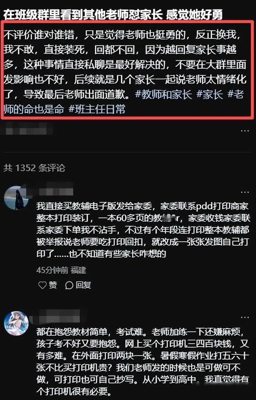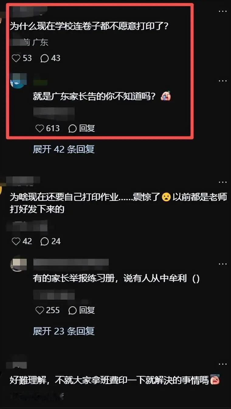家长举报学校打印作业,最后坑了谁? 在孩子的教育问题上,家长和学校本该是携手共进的伙伴,可现实中,家校之间却常常因为一些看似不起眼的小事产生摩擦,甚至演变成激烈的矛盾。就比如去年冬天,广东一所小学里发生的那场关于作业的风波,至今回想起来,仍让人唏嘘不已。 事情的起因很简单,一位家长在家长群里发声,称学校统一打印课后作业加重了孩子负担,在没有和学校进行有效沟通的情况下,直接向教育局举报。也许这位家长觉得自己是在为孩子争取权益,可他没想到,自己的这一举动,就像推倒了多米诺骨牌,引发了一系列连锁反应。 教育部门迅速介入,学校接到通知后,只能无奈停掉打印作业的服务。消息传来,低年级的老师们连夜更改教学计划,此后所有作业只能以电子版的形式发到家长群,家长需要自行拿去打印,孩子再动手完成。 一开始,家长们并没有意识到这一变化会带来多大的影响。但随着时间的推移,问题逐渐暴露出来。住在城中村的李女士,每天下班后都要骑着电动车,在寒风中奔波半小时,只为了去打印店给孩子打印作业。像李女士这样的家长不在少数,有些小区附近根本没有打印店,孩子的作业常常因为打印不及时而晚交。 在一次家长群里,一位家长抱怨道:“小区里没有打印店,每次都要跑好远,孩子作业总比别人晚交,这不是耽误孩子学习嘛!”可没想到,班主任冷冷地回复:“不想打印就别做,作业从来不是非做不可的。”这话一出,群里瞬间安静下来,家长们心里满是委屈和无奈,却又不敢再多说什么。 这场风波的背后,反映出的不仅仅是作业打印的问题,更是家校之间沟通不畅的矛盾。近年来,家长动不动就举报、投诉的现象屡见不鲜,这让老师们在教学工作中变得小心翼翼。有老师无奈地说:“现在上课、布置作业都得反复斟酌,生怕哪句话说错了、哪个作业布置得不合适,就被家长抓住把柄。” 而当初举报的那位家长,如今也陷入了困境。孩子家里没有打印机,最近几次作业都因为格式不对被老师退回。看着孩子失落的眼神,他心里也不是滋味。曾经以为自己的举报能为孩子减负,可没想到最后却让孩子和自己都陷入了更麻烦的境地。 这就不禁让人反思,在教育孩子的过程中,家长和学校到底应该如何相处?当家长对学校的做法有意见时,是应该选择直接举报,还是先和学校沟通,寻求更好的解决办法呢?或许,只有当家长和学校能够真正站在孩子的角度,相互理解、相互配合,才能为孩子创造一个良好的教育环境。 这场关于作业的风波,也该让我们警醒,教育需要的是理性和沟通,而不是冲动和对抗。你怎么看待这件事呢?欢迎在评论区分享你的观点 。