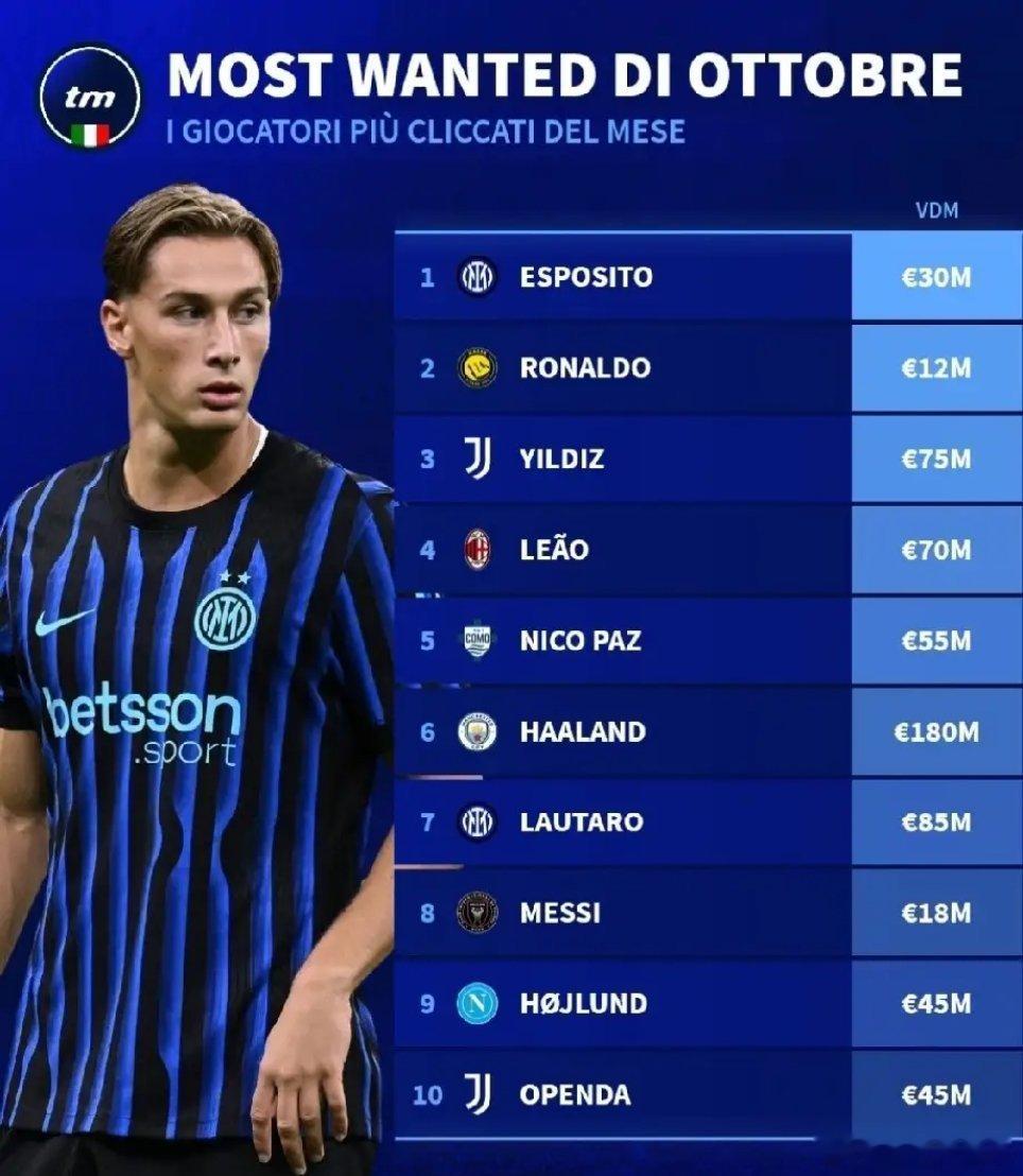 皮奥是10月份德转意大利站球员页面被访问次数最多的球员,压制C罗、梅西。[doge]