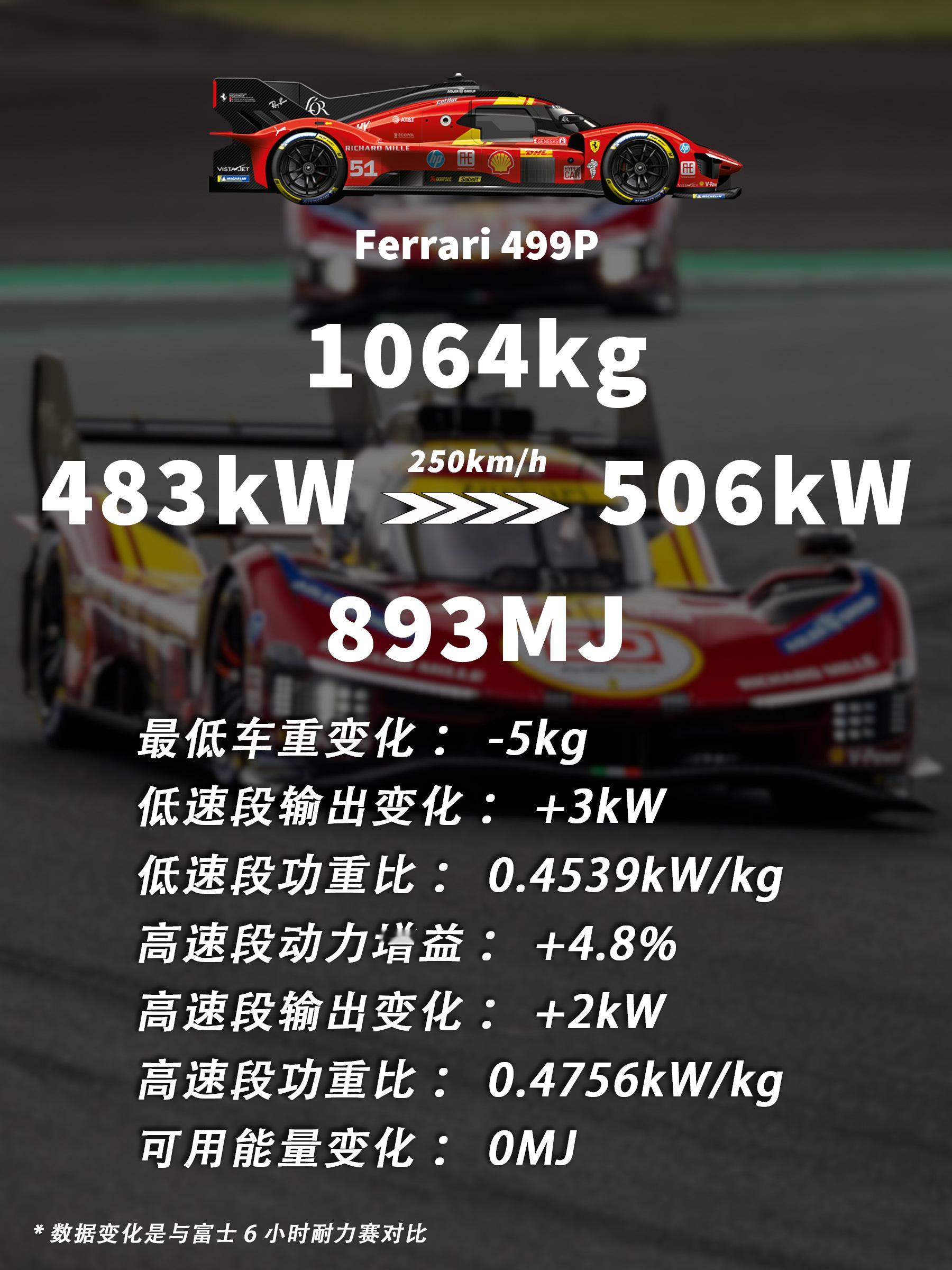 ❇️ 法拉利的数据调整幅度并不大,车重减了一点,然后输出微微抬升,虽然看上去要争夺靠前位置还是有难度,不过争冠组另外两个对手都有削弱,对积分领先不少的跃马来说稳打稳扎应该就可以了。