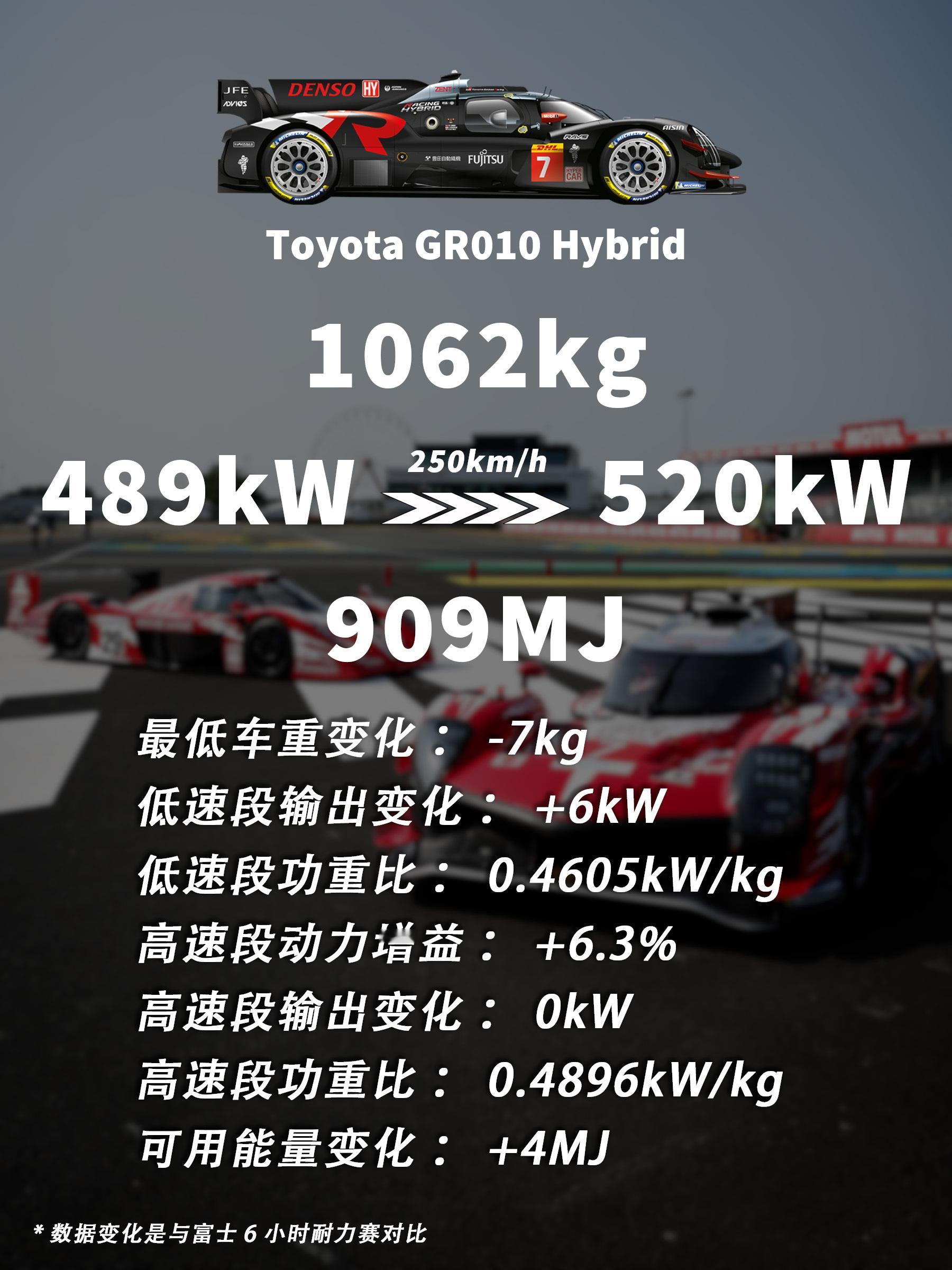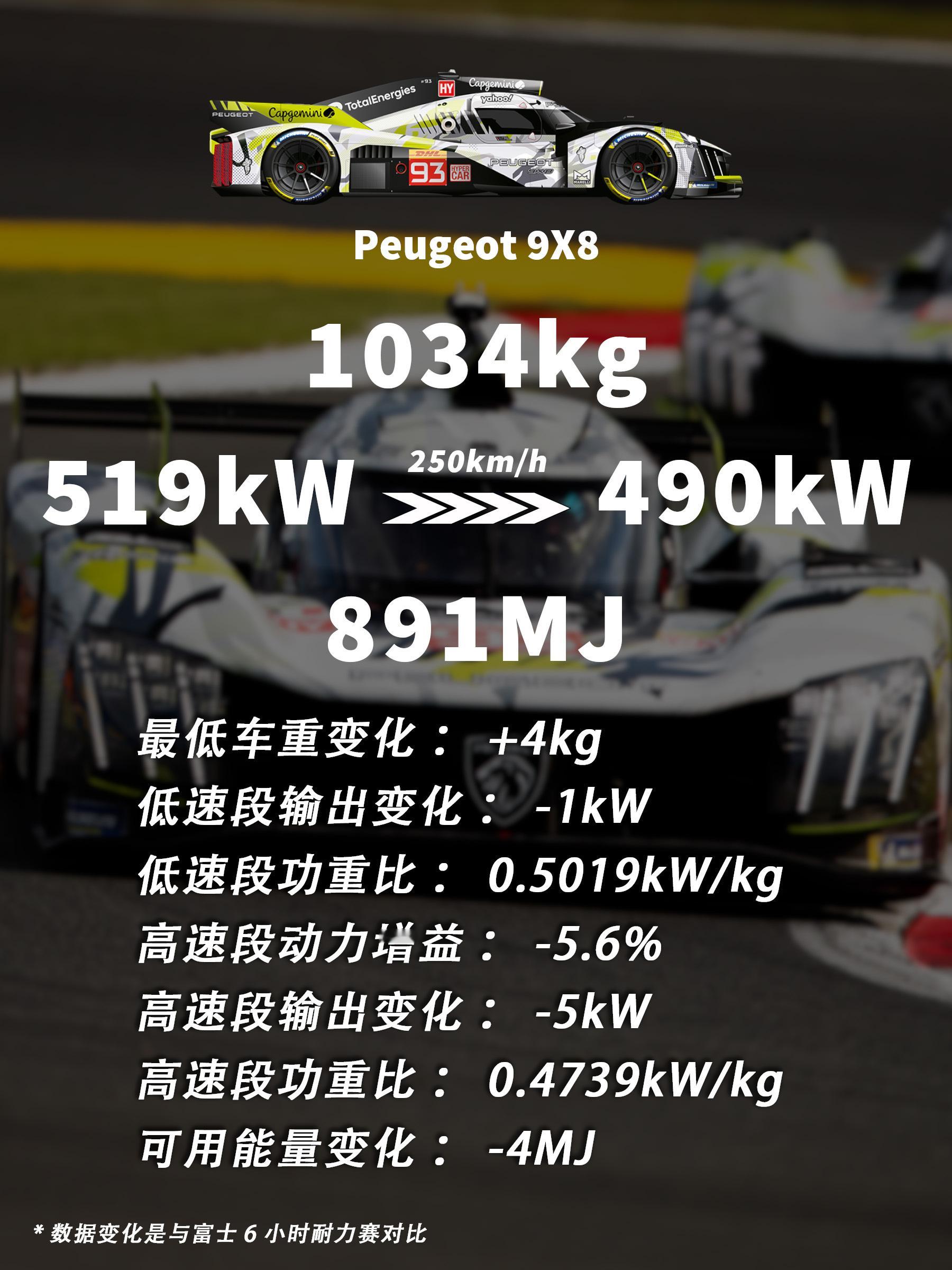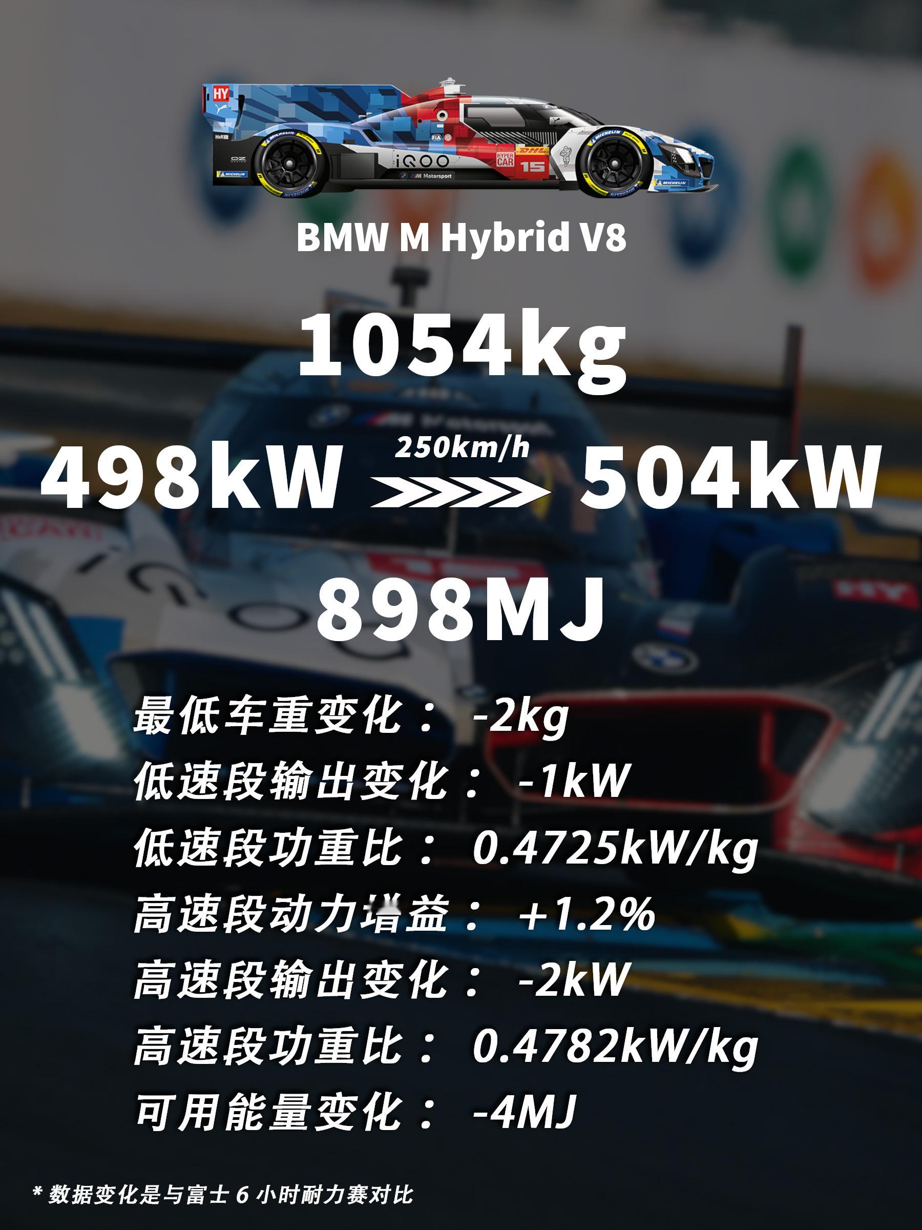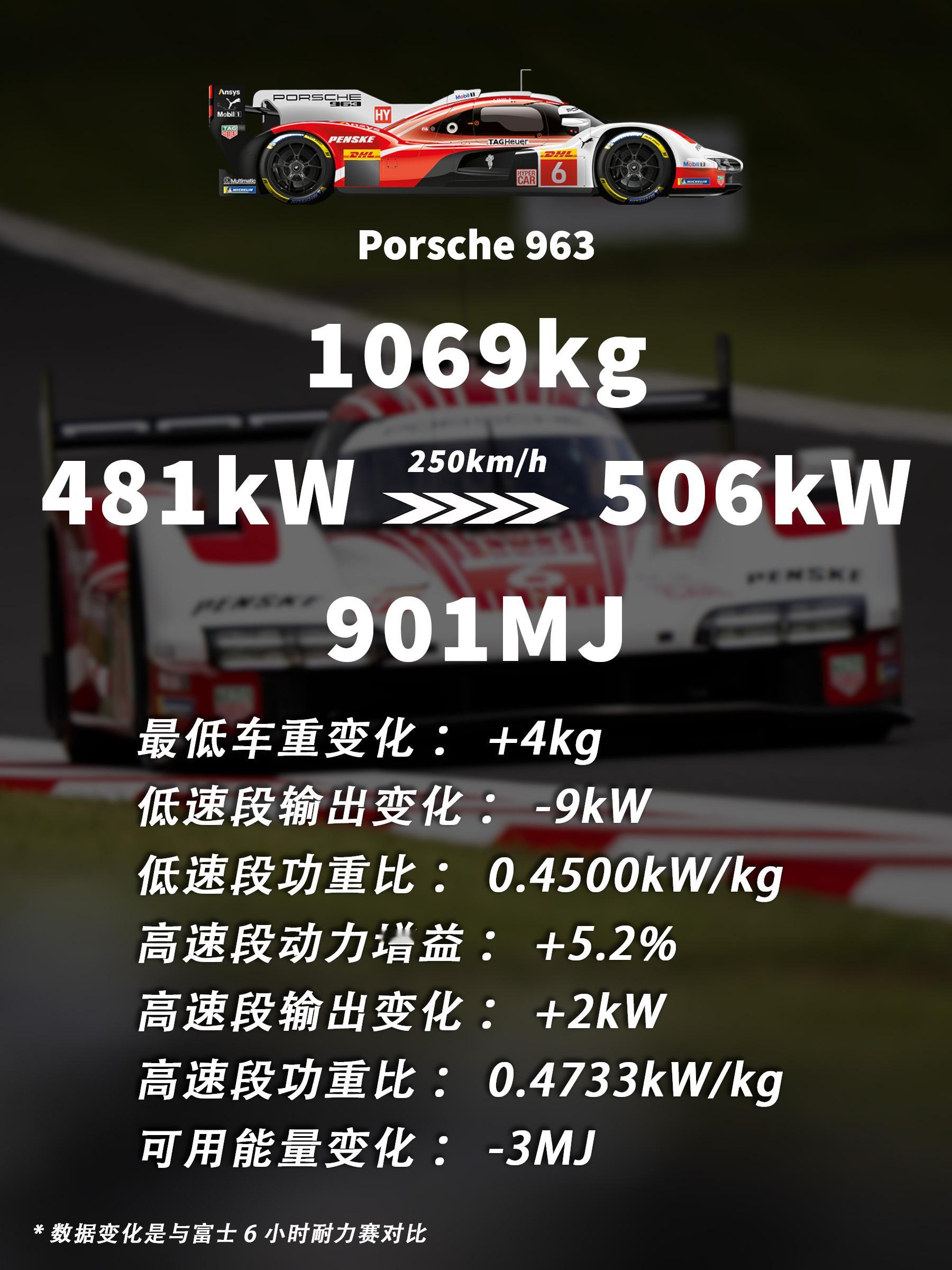 ❇️ 保时捷在自己可能的WEC最高组最后一舞里获得了“顶级待遇”,车重全场最高之余同时低速段输出来到最低,而且可用能量也有小幅度下调。鉴于PPM双车在圣保罗和富士都以3-4完赛,在BoP上进行削弱也说得过去,只是巴林的赛道特性对于低速功重比吃亏的赛车来说还是挺要命的,这无疑会让保时捷的逆转难度进一步加大。