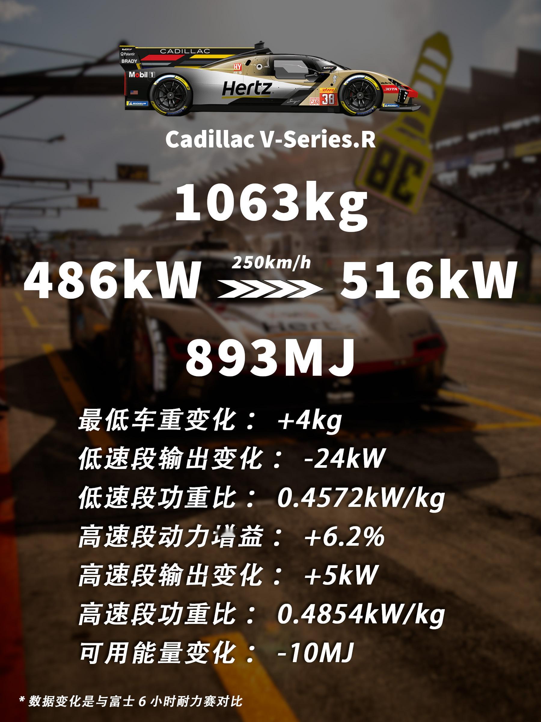 ❇️ BoP调整机制依然是参考之前三场常规分站成绩最好的两场,考虑到COTA因为雨战数据并未采用,所以实际上是斯帕、圣保罗和富士三场中选两场;除了凯迪拉克之外,其他制造商各个数据的调整幅度都跟之前的分站差不多,而这次“秤砣大战”(1060公斤以上车重)的选手变成了四家,法拉利、保时捷和凯迪拉克三位争冠组选手全数在列。