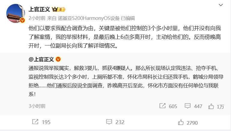 上官正义疑是被以“钓鱼执法”被拘留三小时后续 正义会迟到但不会缺席! 11月1日上官正义接到粉丝线报后来到湖南怀化卧底调整贩卖婴幼儿事件,戚掌握相关证据信息后举报给当地执法部门,很快湖南城南派出所和相关工作人员接到举报贩卖婴幼儿报案后迅速的进行抓捕,随后被湖南怀化市城南派出所所长以协助调查为名让举报人上官正义来所里配合调查!可万万没想到城南派出所所长却以“钓鱼执法”为由没收手机,拘禁3个小时并不准上厕所! 让人无法理解的是,怀化市局一名科长要求归还手机时而鹤城分局田姓领导态度极其恶劣的拒不归还! 作为在打拐民间第一人的上官正义他以一人之力冲在打拐最前线为打拐和拯救那些被拐人不知道做出了多少贡献,网络贩婴、伪造出生证明、打击代孕和黑砖窑事件等等都不知道为警方提供线索并协助破案不知道有多少起案件了! 一直以为他最大的危险来自那些被他铲掉利益链接关系的不法分子集团,因为他每次举报协助破案后都会收到相关的威胁信息,甚至还有人公开悬赏百万要伤害他。所以上官正义的行踪一直都是漂移不固定的,而他安全也是广大网友们关注和关心的。 万万没想到,如此正义的人士却在湖南怀化被扣留了! 从最新上官正义发出来的信息看,他已经离开了湖南怀化,对他被非法没收手机、扣留三个小时以及派出所所长态度恶劣的相关录音证据的事在他离开时怀化市相关工作人员都没有和他联系。 正义举报并协助破案没功劳反被以“钓鱼执法”恶言恶语相向,请问这是在寒了谁的心?在打击谁?