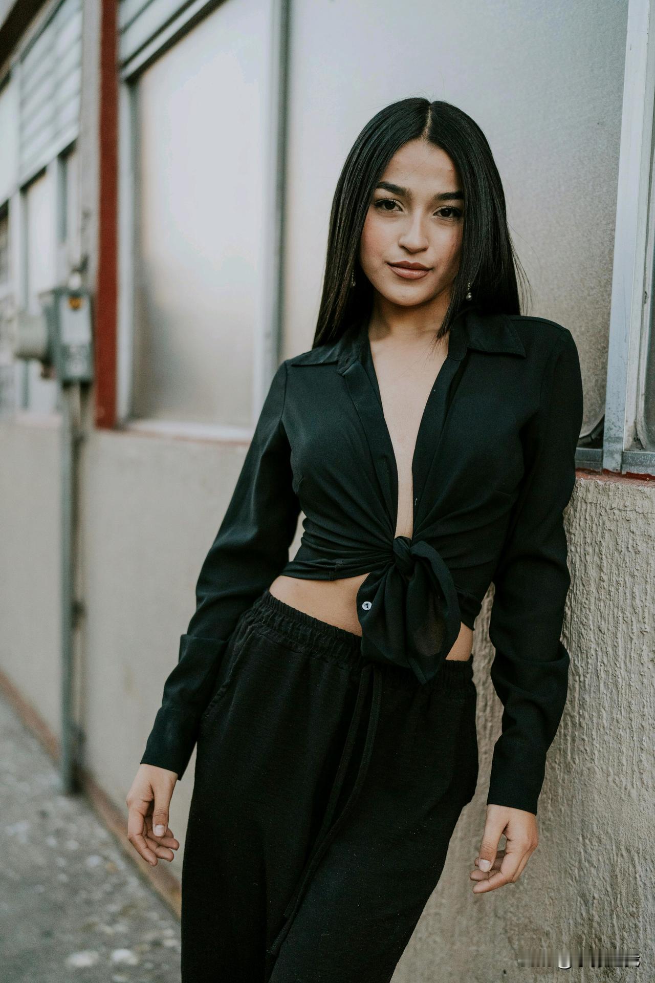 【黑系穿搭三面魅力|工业风与自然感随意切换】🖤 同一套黑色系穿搭竟能在三种场景中碰撞出不同火花!工业风水泥墙前,上衣在腹部巧妙打结勾勒腰线,金属管道与灰墙构成冷峻背景;极简白墙边斜倚时,长款耳饰摇曳出慵懒弧度;而绿植白栅栏前的清新画面中,双手插兜的微笑又瞬间切换成邻家女孩模式。 最爱那些藏在细节里的小心机——露腹设计恰到好处展现健康美感,黑发红唇在冷色调环境中格外醒目。从清冷工业感到治愈自然风,这套穿搭完美示范了如何用基础款hold住多场景。 三组画面共同诠释:真正的搭配功力在于用简单单品穿出丰富语言!你最喜欢哪种风格演绎?快来评论区晒出你的黑色系穿搭公式吧📸