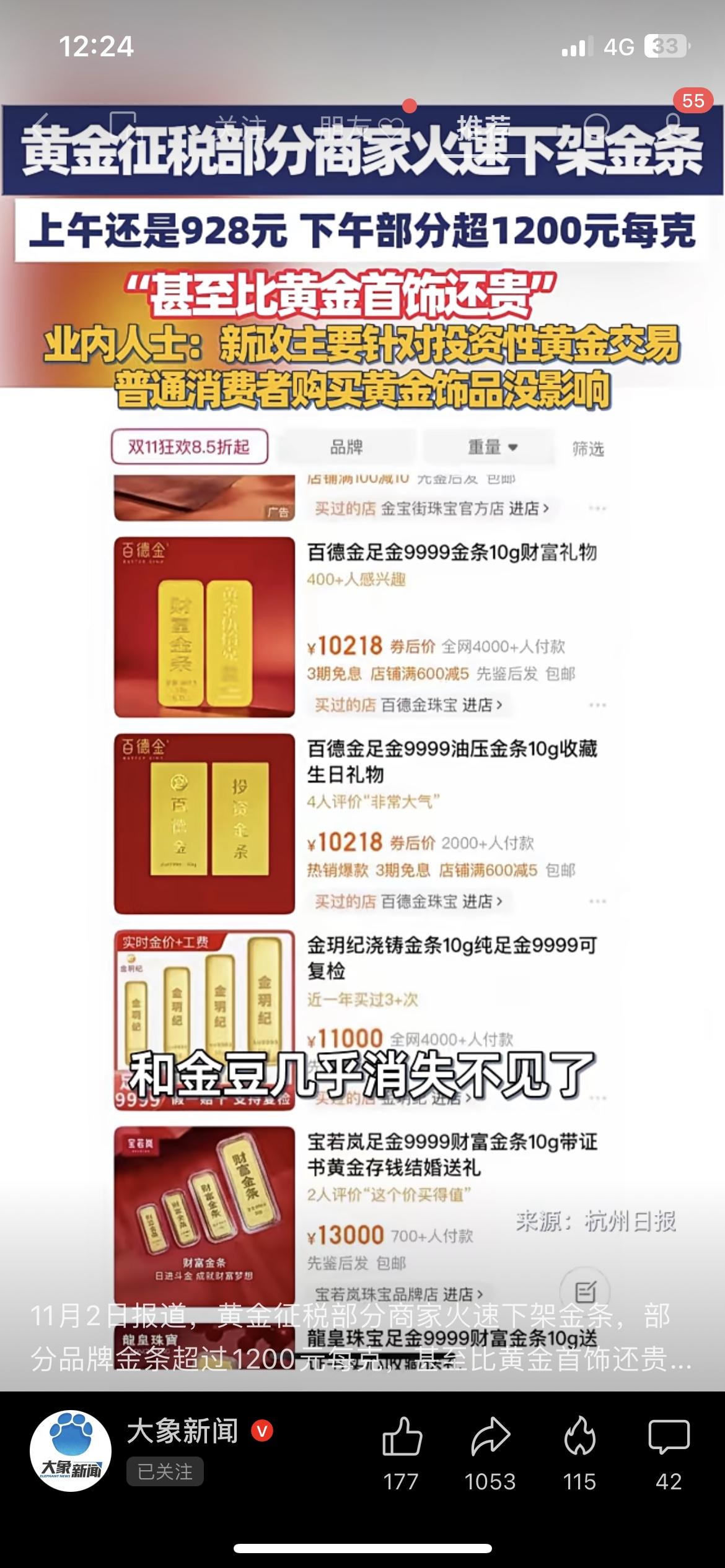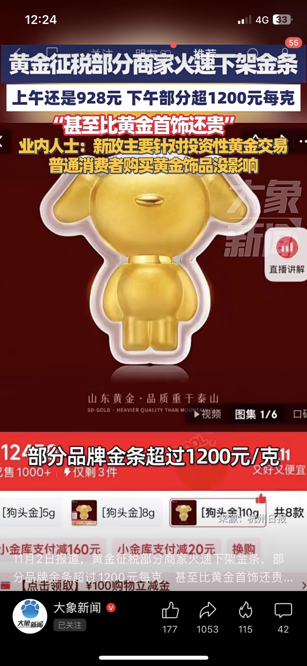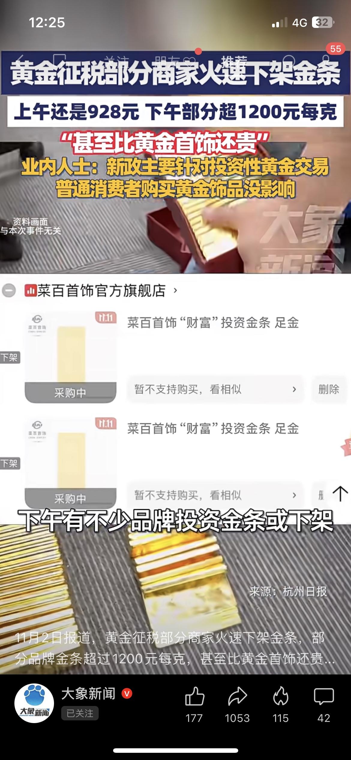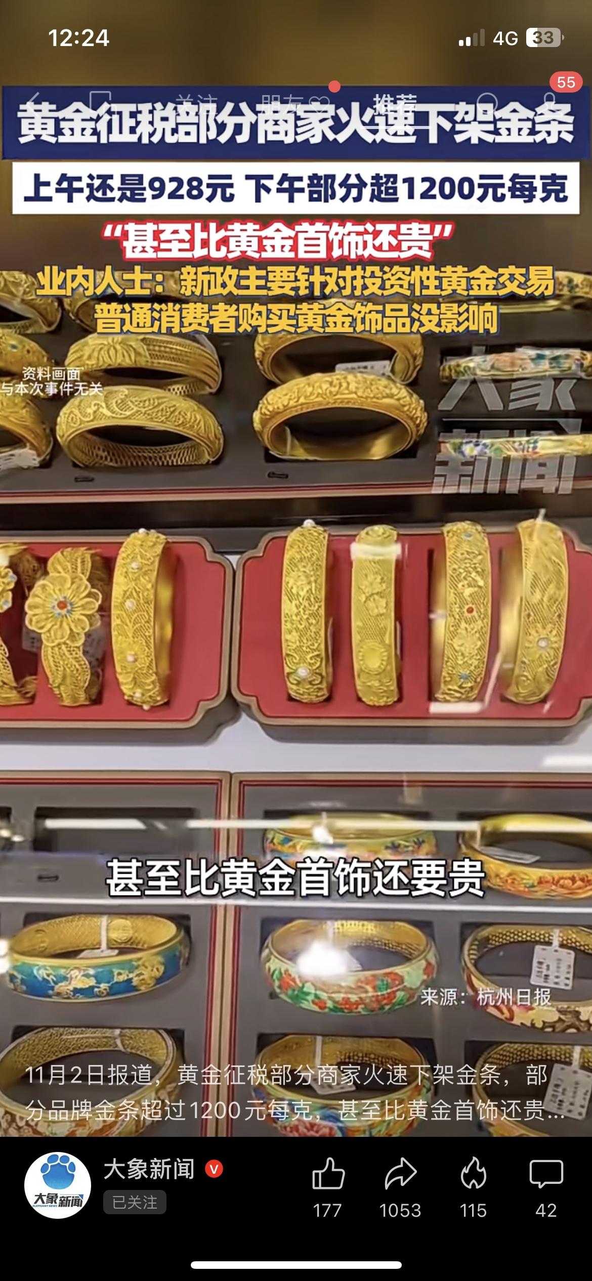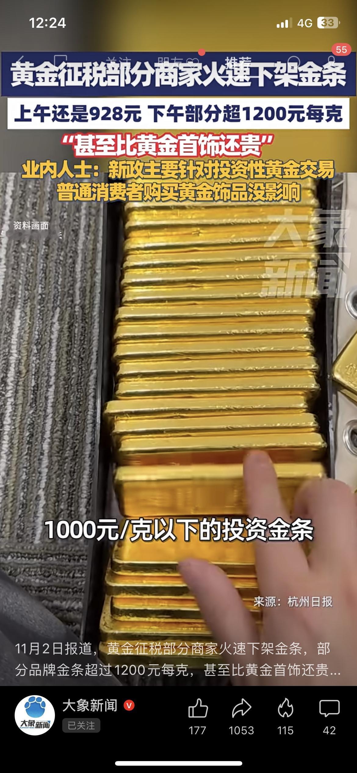 黄金突征税!半天涨272元,商家疯了 刚砸下来的新政!黄金突然加税,商家直接连夜下架金条——上午还是928元一克,下午直接飙到1200元,比金镯子都贵! 普通买首饰的倒是没事,但想囤金条的直接傻了:这涨得比抢钱还快?你们说现在囤金是赚是亏? 划重点:买金饰不受影响,想投资金条的先按住钱包!投资金条金价 黄金售卖价格 金条行情 黄金投资新政策 黄金新规