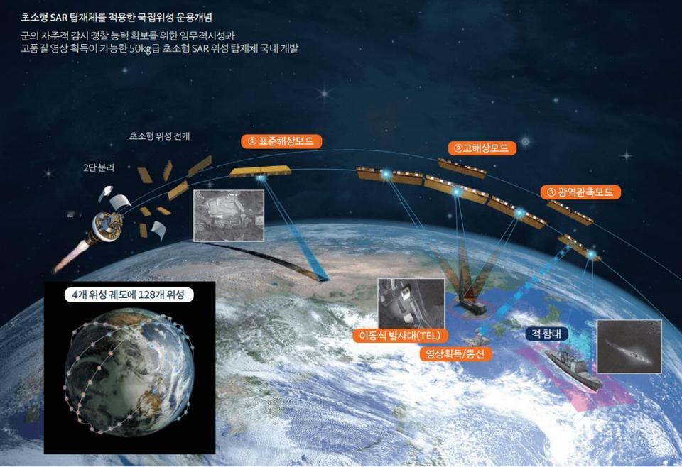 此外,“425项目”完成后,韩国还计划利用国产固体燃料运载火箭发射50~60颗小型与超小型侦察卫星。其中 11颗由科学技术信息通信部负责(EO卫星),40颗由国防部开发(SAR卫星)。这些卫星预计在2020年代后期完成部署,届时将能够每30分钟对朝鲜半岛及周边地区进行侦察。因为朝鲜正大幅增加机动导弹发射车数量,并利用夜间、铁路或水库等“非典型场所”发射导弹,传统光学卫星已难以应对。