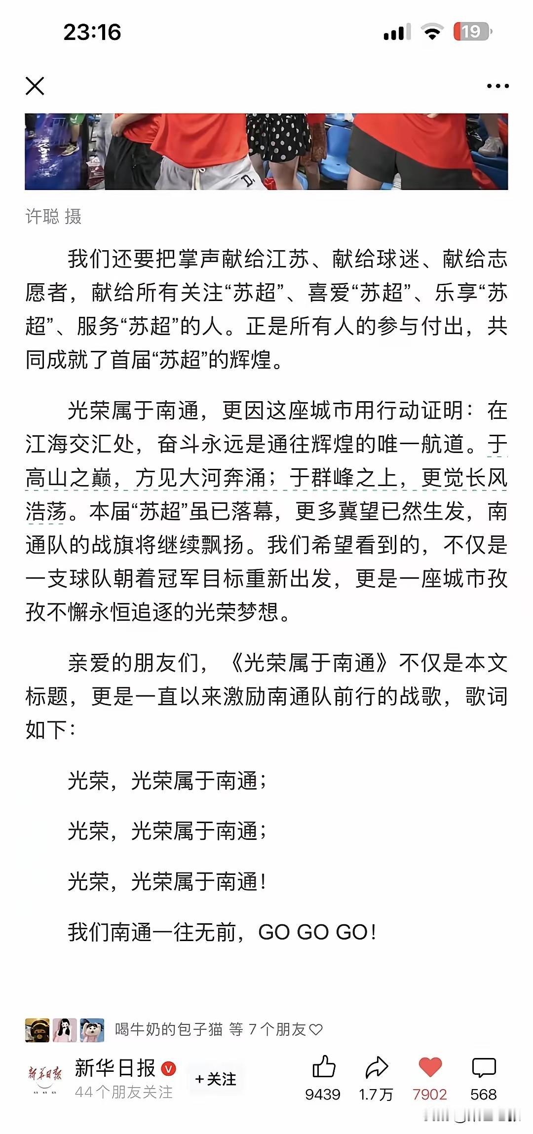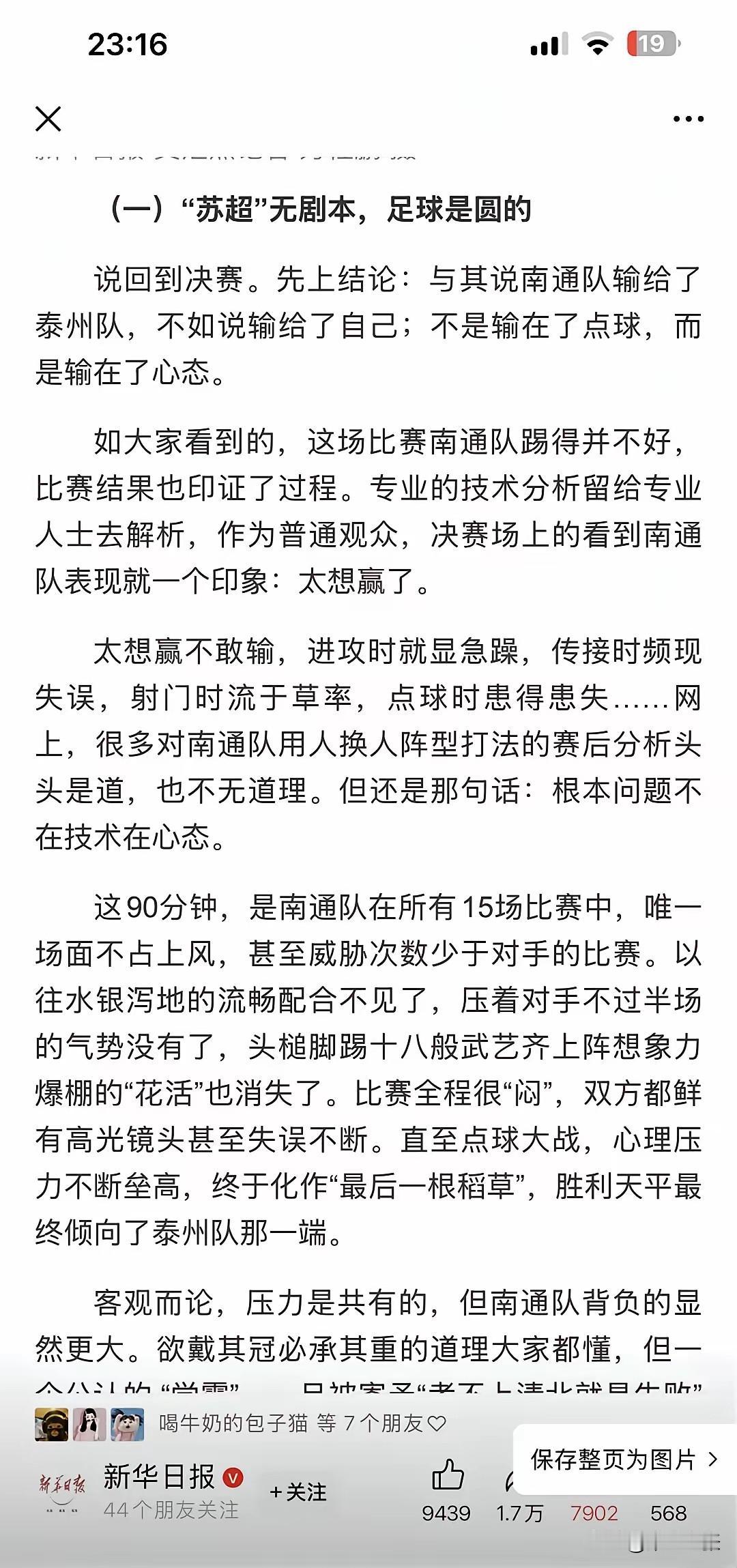 新华日报为南通队单开《光荣属于南通》一文,这操作十分圈粉,对冠军却一笔带过。南通队在“苏超”联赛总决赛中,与泰州队激战至点球大战,五罚三中惜败,最终获亚军。 网友留言感人至深,“没人会记得第二名,除非他是南通”。大家爱足球,更爱那片故土。赛事旨在鼓励南通青训模式,培育各地足球火种。南通队虽未夺冠,但他们拼搏的姿态,以及南通这座城市 14 年的坚守,令人动容。愿来年江苏十三市足球百花齐放!