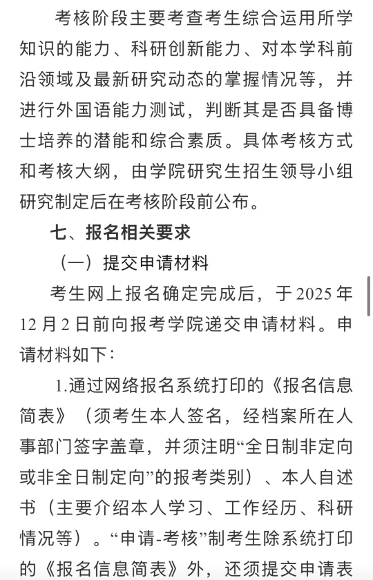 博士研究生申请考核制的招生选拔分为申请、材料审查、考核三个环节。我校2026年博士研究生招生工作将于秋季学期开展,并根据当年度招生指标情况于春季学期进行补充招生。(一)申请考生向报考导师提出申请,经导师同意后进行网上报名。秋季学期网报报名时间:2025年11月9日—2025年12月1日,春季学期招生工作时间安排详见研究生院网站后续相关通知(下同)。