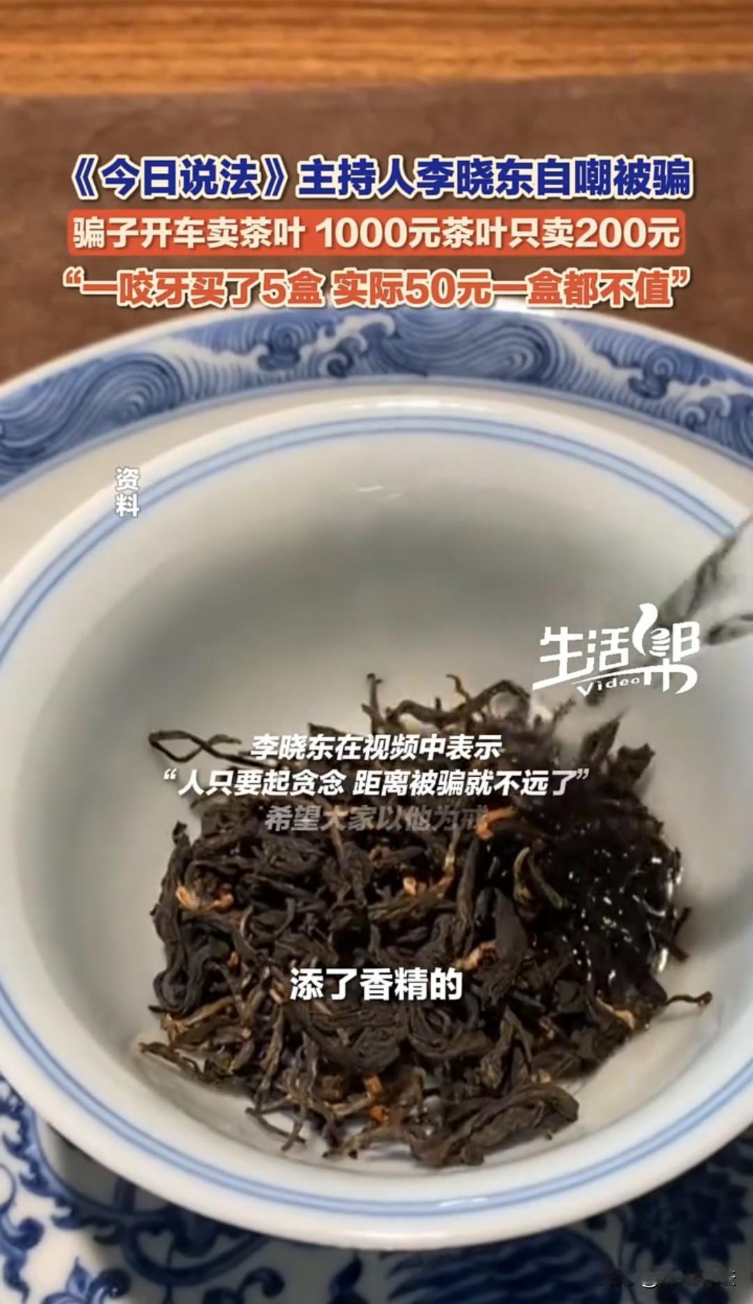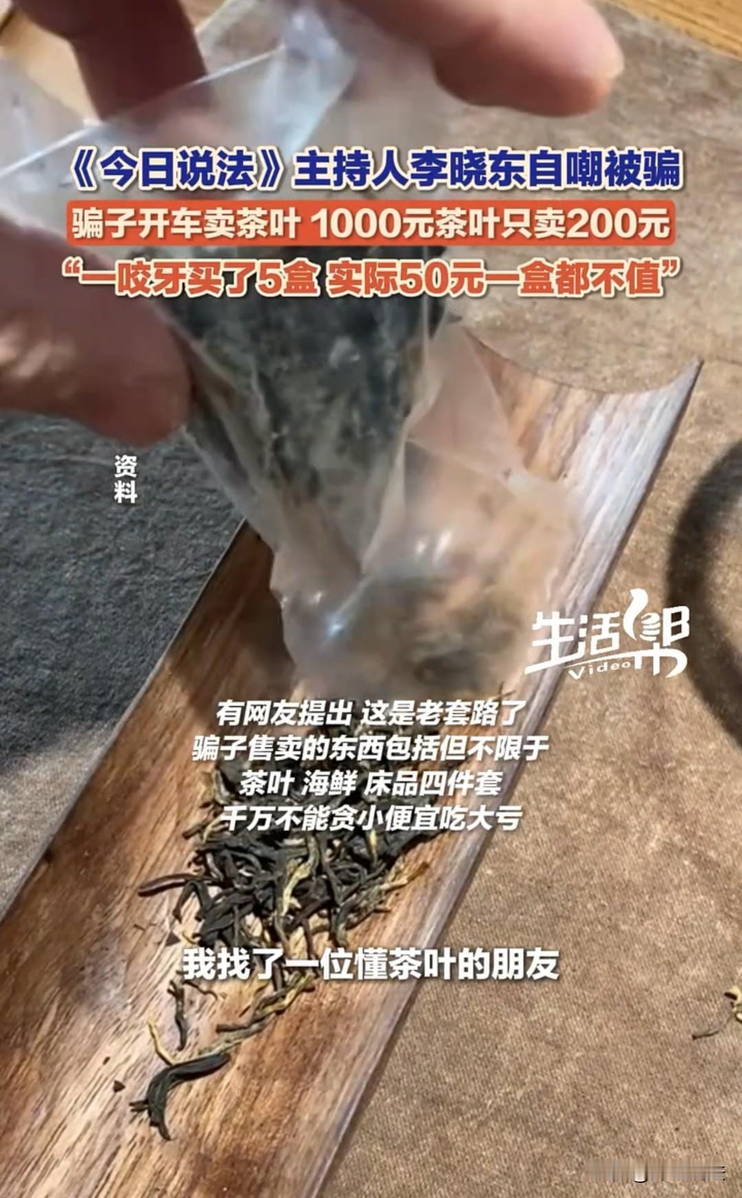北京,《今日说法》主持人李晓东天天讲法普法,却被一个开奔驰车的人骗了。对方称自己来北京开茶叶展销会,现在要返程了,后备箱里堆了很多茶叶,不处理掉后排就没法坐人,便问主持人:“能不能帮忙买一点?”主持人说自己不喝茶,还是算了。对方又说,原价1000元一盒的铁观音,只卖300元,问他行不行。主持人依旧不愿买,结果对方又降价到200元一盒。主持人动了贪便宜的心思,一咬牙买了五盒,花了1000元。结果次日拿去懂茶的朋友家鉴定,朋友说这是添了香精的伪劣茶叶,50块钱一盒都不值,根本没人要。 李晓东下班后,就高高兴兴地准备回家。他刚走到路边,突然就有一位男子上前询问他要不要茶叶。 以李晓东的职业习惯,觉得在路边卖茶叶好像不符合常理,有可能是骗子。 但是对方很诚恳,说:“你买不买没关系,你先过来瞧一瞧吧,我的铁观音原价是1000元,现在只需要300元。” 作为一个主持人,平时也不缺钱,对于这样降价销售的产品,他其实并没有多大的心动。 但是男子还是没有放弃,直接将李晓东带到了奔驰车前面,打开了后备箱,还有点面露忧伤地说道:“我是来北京开展销会的,带的货品比较多,现在准备回去了,但是我还有家人,如果不把这些茶叶卖掉,家人就无法回家。” 李晓东一听对方是为了带家人一同回家才卖茶叶,心中的善意好像被触动了,便停留了下来。 男子又真诚地说道:“我这些铁观音都是好货,平时一千元一盒,一分都不少,即使是亲朋好友都是这个价格。要是今天不是为了带着家人一起回家,自己也不可能这样低价卖出。” 李晓东好像有点感动了,但是自己从来不喝茶,买来也是放在那里没用,所以还是拒绝购买。 男子这时来了一句:“如果300元不行,那就200元一盒吧。我也知道你不缺钱,就看在我解决困难的份上,帮帮我吧!” 李晓东终于被对方说动了,虽然他觉得这些东西买回去真的没有用,但是都是男人,能帮一把算一把,就一狠心买了五盒,花了1000元。 最开始,李晓东还觉得自己做了好事,心里美滋滋的,茶叶可以不喝,但是好事一定要做。 可是一回家躺在沙发上,感觉事情没有这么简单,自己天天讲法,这好像就是一个圈套。 为了证实自己的想法,他赶紧拿着这些茶叶,找到爱喝茶的朋友鉴定一下,看看是不是有问题,能不能值200元一盒。 对方看到后直接笑话李晓东:“你咋啦?骗局到自己身上就中招了?你这茶叶啊,是添加了香精的,给我50元一盒我也不要。” 自己被骗彻底实锤了,这股憋屈劲让李晓东很难受,自己怎么就被对方说动购买了呢? 为了抒发情绪,他在自媒体上吐槽:“所有的骗局当中,总有一款适合你,一定要擦亮眼睛,随时警惕啊!” 大家为了安慰李晓东,说他是善良,要是不善良,也不会被骗。 但李晓东也说了大实话:“人不要有贪欲,一旦有贪欲,就给被骗埋下了祸根。” 一、卖茶人以低价茶叶冒充高价茶叶出售给主持人李晓东的行为,可能构成诈骗罪。 根据《刑法》第二百六十六条规定,诈骗罪是指以非法占有为目的,用虚构事实或者隐瞒真相的方法,骗取数额较大的公私财物的行为。 在该事件中,卖茶人虚构了茶叶是参加展销会剩余、原价较高但现低价处理的事实,隐瞒了茶叶是添加香精的伪劣产品这一真相,使李晓东产生错误认识,进而基于这种错误认识支付了1000元购买茶叶,符合诈骗罪的构成要件。 同时,根据《消费者权益保护法》第五十五条规定,经营者提供商品或者服务有欺诈行为的,应当按照消费者的要求增加赔偿其受到的损失,增加赔偿的金额为消费者购买商品的价款或者接受服务的费用的三倍;增加赔偿的金额不足五百元的,为五百元 。法律另有规定的,依照其规定。 李晓东作为消费者,有权要求卖茶人退一赔三,即除了退还1000元货款外,还应赔偿3000元。 二、若卖茶人没有合法的经营资质,其销售茶叶的行为还可能违反了《无证无照经营查处办法》等相关法律法规,可能面临行政处罚。 对于此事,大家如何看? 素材来源于:红星新闻11月3日报道。