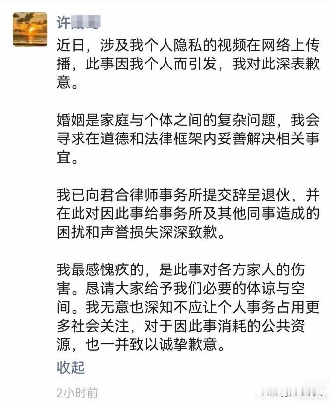 上海许律师发朋友圈道歉,已从律所辞职,离婚已经成了事实了。 万万没有想到啊,当时如此冷静的许大律师,竟然在朋友圈发道歉信了,口口声声说他对不起家人,口口声声说他错了,要向家人道歉。 那天的冷静呢?那天怀孕了,怎么了?这句话说的如此云淡风轻。 没想到道歉来得这么快。 但是关于他的道歉,大家并不买单,原因很简单,其实他不是知道错呢,而是怕呢,因为他的律师师所已经和他解除了合同,按照这个剧情发展下去,他很快就很有可能一无所有。 解除合同,离婚,净身出户,取消执业证这些已经成了板上钉钉的事,所以才不得不道歉。