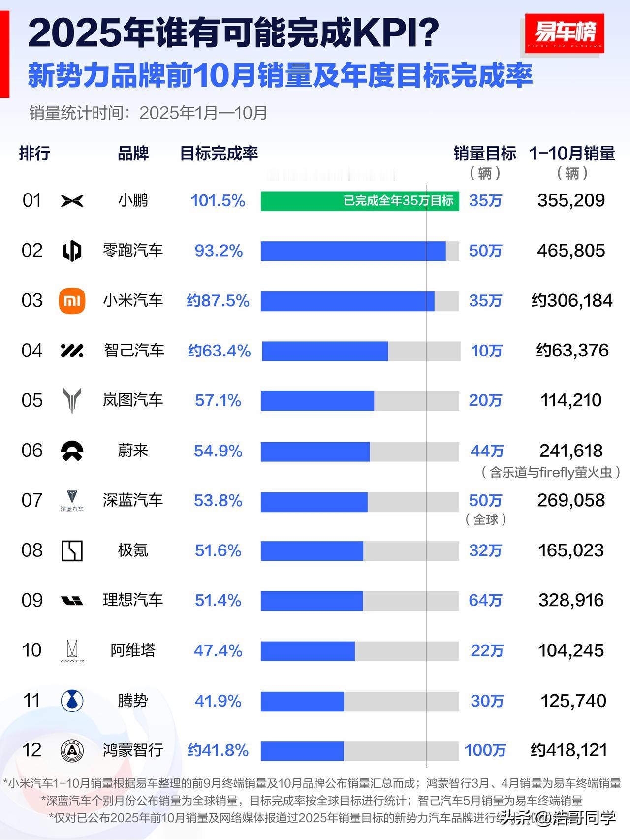 2025年第四季度只剩2个月了,看看谁完成了全年的目标任务?1~10月新势力品牌的销量如何?让我们仔细分析一下! 首先,定的目标任务数并不是随便决定的,这需要看全年发布多少款车,还有就是一年卖多少辆才能够盈利; 这里要表扬一下小鹏,已经超额完成了全年35万辆的目标任务,卖了355209,达到了101.5%,小鹏的M03是一款绝对冲量的车型,性价比十足,十几万的售价是大多数人年轻人的第一台车; 零跑汽车10月销量破7万是啥概念,早就有半价问界的零跑汽车,以绝对的性价比赢得了市场的认可,激光雷达的车型也卖十几万,这销量能不好吗? 小米汽车这边,年初的时候雷总定了一个35万辆的全年销量目标,如今10个月已经过去,已经完成了87.5%,一共卖了306184辆,这里有小米SU7的功劳,更有小米YU7的加持,还是那句话,小米汽车的销量约等于它的产能,推测小米SU7改款将于2026年初推出,大家敬请期待吧!对了,还有小米YU9,小米的大型增程车发布!