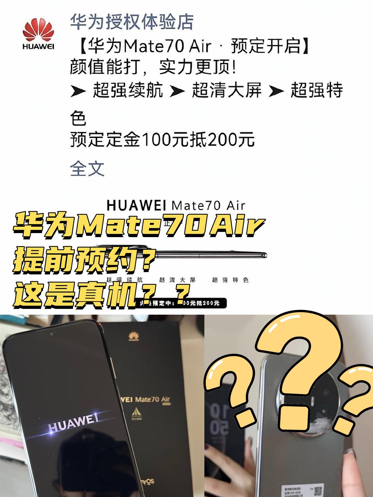 真的假的?华为Mate 70 Air现在已经开始预约了? ❓这是真的吗?有网友说华为线下门店已经开始预约Mate 70 Air了,预定100可以抵扣200元。。。 就连📱华为Mate 70 Air真机都出来了,据说搭载6.9-7英寸大宽屏,侧边指纹,还有6500mAh电池+66W快充,还是大亮中框,11月6日开售,你们觉得咋样?