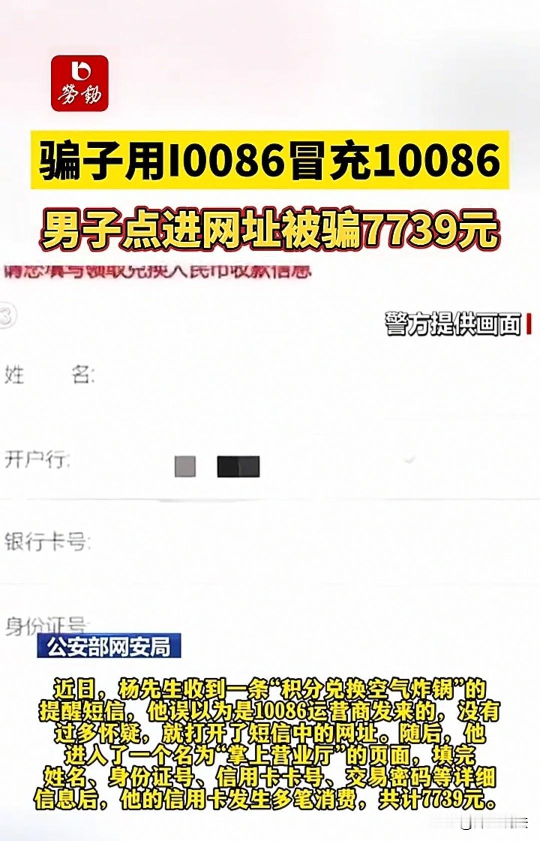 北京,男子把“l0086”看成了“10086”,误以为是运营商发短信来让自己兑换积分,结果跟着对方的流程,将自己的银行卡号、身份证号、交易密码全部填写上去,随后就收到多笔消费记录,总共损失了7739元。 杨先生每年都会去实体店兑换积分,平时都会兑换空气炸锅、洗衣液、抽纸之类的日用品。 那天他又接到了短信,说快年底了,积分比较多,让他赶紧去兑换,要不然就要清零。 杨先生觉得,要是不兑换,也太可惜了,能兑换一些日用品也挺不错的,于是就准备有空了就去兑换。 但他扫了一眼短信,发现上面留有网址,就想点进去看一看。 进去后,他发现在网上也能兑换,心想:“要是这次弄好了,那以后就不用去实体店了,就算网上兑换不方便也没关系。” 于是他就仔细研究起来,发现从网址进去后会出现“掌上营业厅”的页面,上面要求填写一些信息。 杨先生觉得要领取东西,填写这些信息也很正常,这说明对方很正规,于是就按照要求,把姓名、身份证号、银行卡号、交易密码、交易预留号码,还有银行卡背面的三位数全部如实填上。 按了确认键后,就出现了“全国银联通用”的页面。 杨先生心想,这还真方便,三下两下就搞定了,到时候对方把东西寄过来,自己下楼去取就行。 谁知道没过多久,他连续收到几条消费短信。杨先生一惊:“咋回事呢?自己又没消费,感觉上当受骗了!” 可现在为时已晚,7739元就这样没了。他赶紧报警,想弄清楚是怎么回事,自己明明是从“官网”进去的呀! 可大家一看,这哪里是“10086”,这是“l0086”!这是骗子为了混淆视听,把数字“1”改成了字母“l”,大家不注意的话,很容易以为是运营商发来的。 要知道,只要进入了骗子的网址,你输入的所有信息都会被他们获取,他们就能利用你的验证码或交易密码进行消费。 网友们看到后说:“现在真的不敢随便打开链接,骗子的手段一直在升级,任何行业都能被他们渗透,连10086都能仿冒。” 还有人说:“之前总嫌弃实体店麻烦,现在看来,要是有空余时间,去实体店兑换反倒安全得多。” 一、诈骗罪 《刑法》第266条,骗子伪造“10086”短信、搭建虚假网站,虚构积分兑换事实,骗取杨先生7739元。根据司法解释,诈骗3000元以上即属“数额较大”。 本事件完全符合“虚构事实、非法占有”的诈骗罪构成要件,且涉案金额远超立案标准,需承担刑责。 可处骗子三年以下有期徒刑、拘役或管制,并处或单处罚金。 二、 侵犯公民个人信息罪 《刑法》第253条之一,骗子非法获取杨先生的身份证号、银行卡号、交易密码等敏感财产信息。 此类信息直接关联财产安全,获取后用于盗刷,已涉嫌“情节严重”,可与诈骗罪并罚。处三年以下有期徒刑或拘役,并处或单处罚金。 三、行政法律责任 运营商若未及时封堵诈骗端口,违反《反电信网络诈骗法》,杨先生可向工信部投诉,要求其承担监管失职责任。 对于此事,大家如何看? 素材来源于:大象新闻2025年11月3日