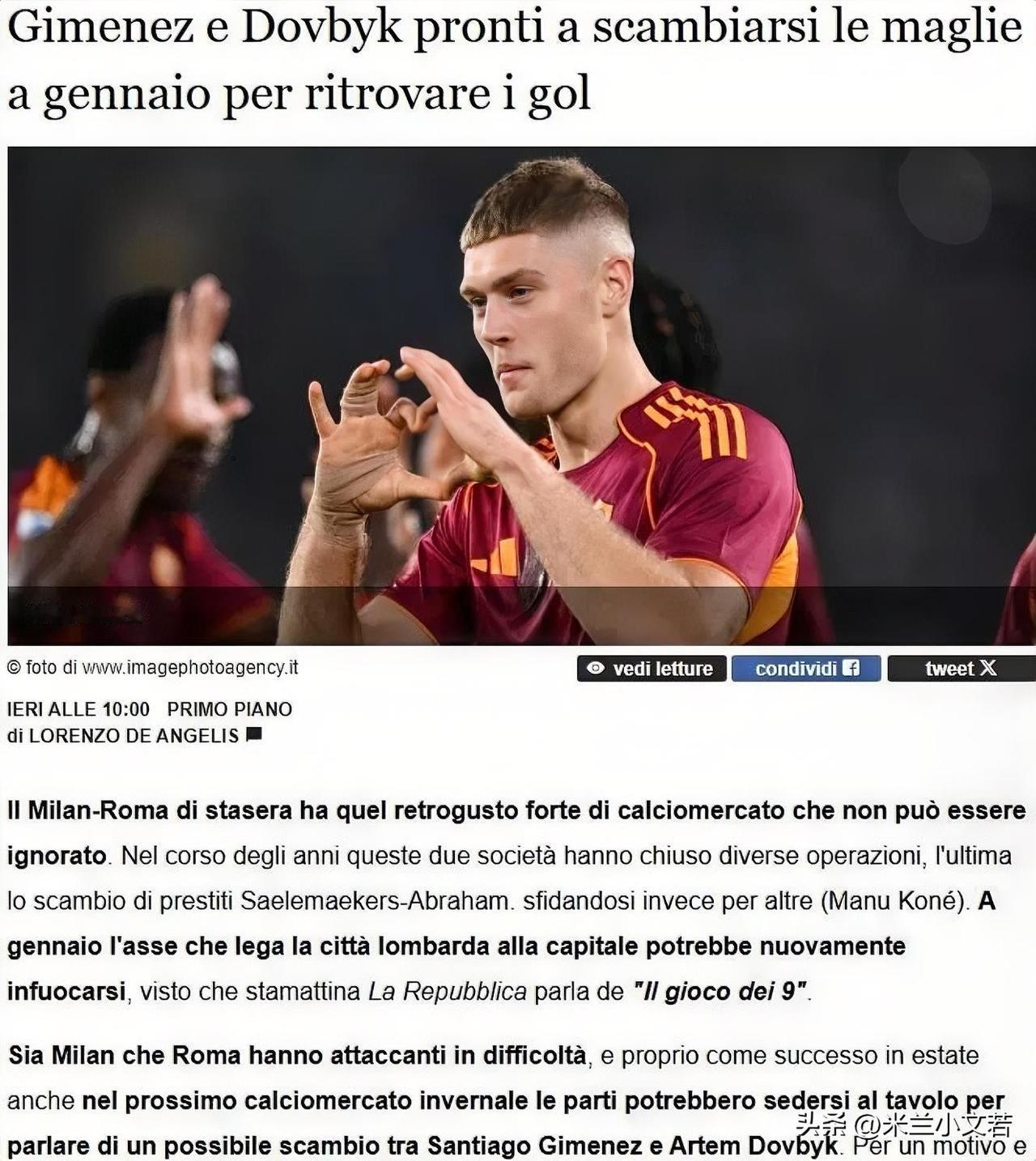 希门尼斯冬季窗口依然有可能与罗马俱乐部多夫比克进行互换式交易。今天希门尼斯再次成为米兰锋线改造的目标球员,用由于米兰的冬季窗口预算原因,不排除米兰与罗马俱乐部重新开启球员互换,希门尼斯与多夫比克互换加盟球队。 夏季窗口最后时刻这个交易差点就成功了,希门尼斯当时已经同意了,但罗马俱乐部那边好像是因为买断问题最后没有时间再次谈判而告吹,如果希门尼斯早两天点头,他现在很可能已经是一名罗马球员,个人觉得希门尼斯真的在夏季窗口加盟罗马对希门尼斯而言真的不一定是坏事。 罗马俱乐部的教练加斯佩里尼从开始就看不上多夫比克,而阿莱格里一直都说要一名中锋球员,而希门尼斯不符合阿莱格里战术要求,当时真的互换了,无论多夫比克还是希门尼斯可能都不会踢的那么挣扎。