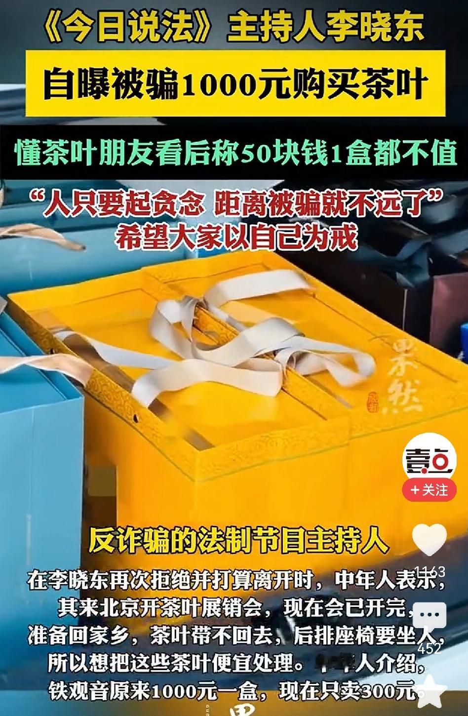 今天《今日说法》的主持人李晓东自曝被骗花1000元购买了茶叶,懂茶的朋友看后说50元一盒都不值。按理说作为《今日说法》的主持人他法律意识及防诈骗意识要比一般人强好很,但面对骗子的话术和套路,还是掉入了骗子的圈套里。可见骗子的套路并不是那么容易被识破,稍不留意就可能掉进坑里。 对于我们普通人来说,该怎么避免被骗呢?就像李晓东说的那样,还是不要有贪念,人只要起了贪念,就离被骗不远了。俗话说:天上掉馅饼,不是诡计就是陷进。我们只要不要起贪念,不要贪便宜,多留个心眼,那骗子想骗也是不容易的。