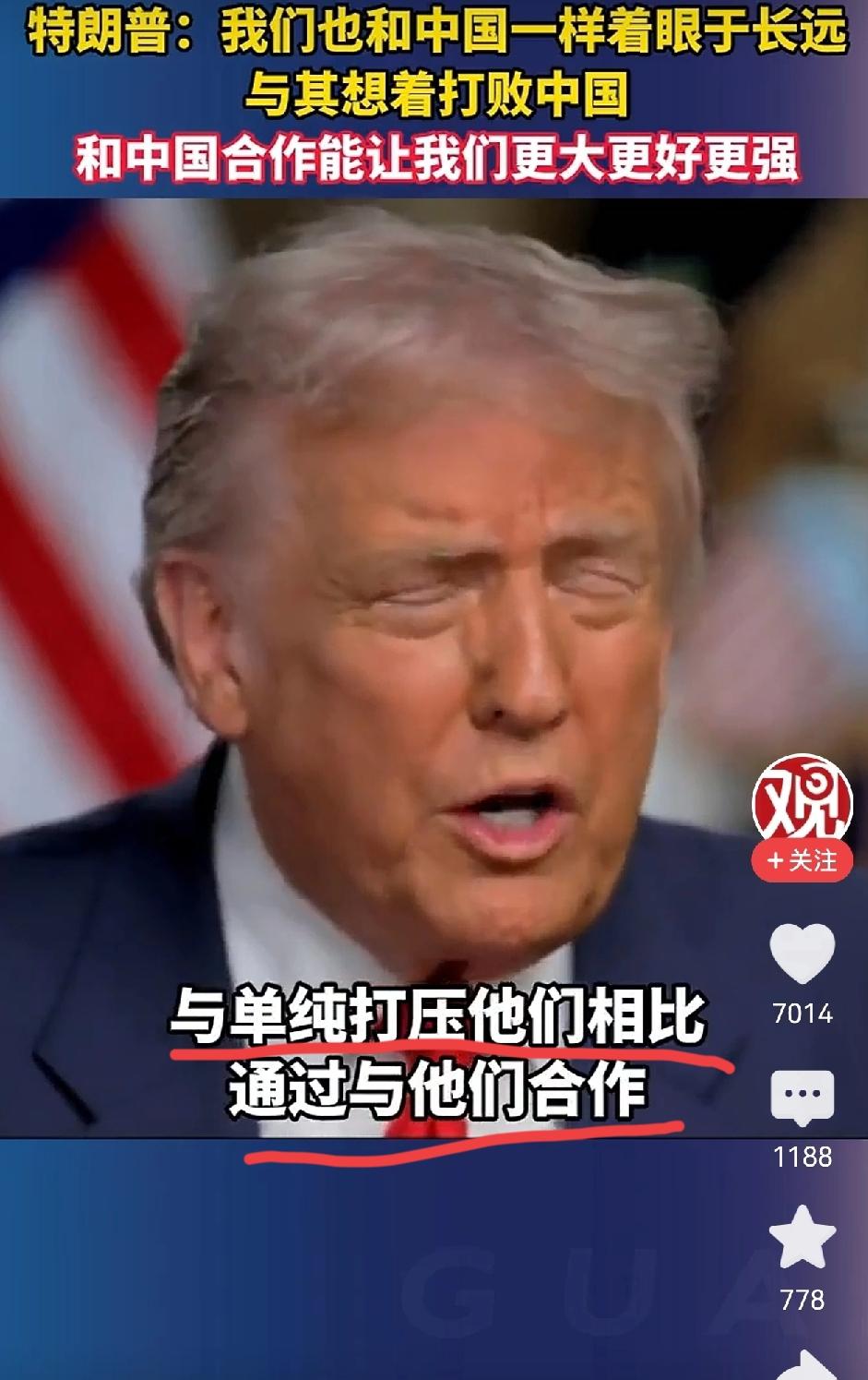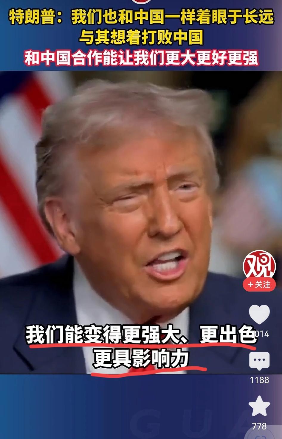 特朗普最近接受采访时对中美关系有了新的定义,可以说这是划时代的,未来的人们回望这段历史,2025年绝对是一个重要的转折点。 特朗普说,美国与中国一样着眼于长远发展,在这个竞争激烈的世界,与其想着如何打败中国,打压中国,不如与中国合作,通过与中国合作美国能变得更加强大,更加出色,也更加有影响力。 试想不可一世的美国,对谁有过这样的表述,对谁说过这样的软化。这意味着,美国对中国的关系定位,已经从居高临下的俯视,转变为地位对等的平视。