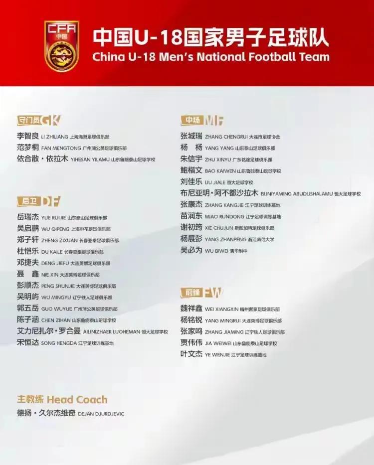 中国U18国青11月集训大名单出炉,久尔杰维奇通过前两次集训筛选出了31人,布尼亚明和魏祥鑫领衔,5个前锋,3个门将,后卫和中场球人员充足,本次集训将在上海进行,期间和吉尔吉斯斯坦U18才2场热身赛,久尔杰维奇没能带上届U20国青进入世青赛,中国足协再给了久尔杰维奇一次机会,这次让他有充足时间组建队伍,争取带这批U18进入下届U20世界杯,中国足球加油!久尔杰维奇加油!