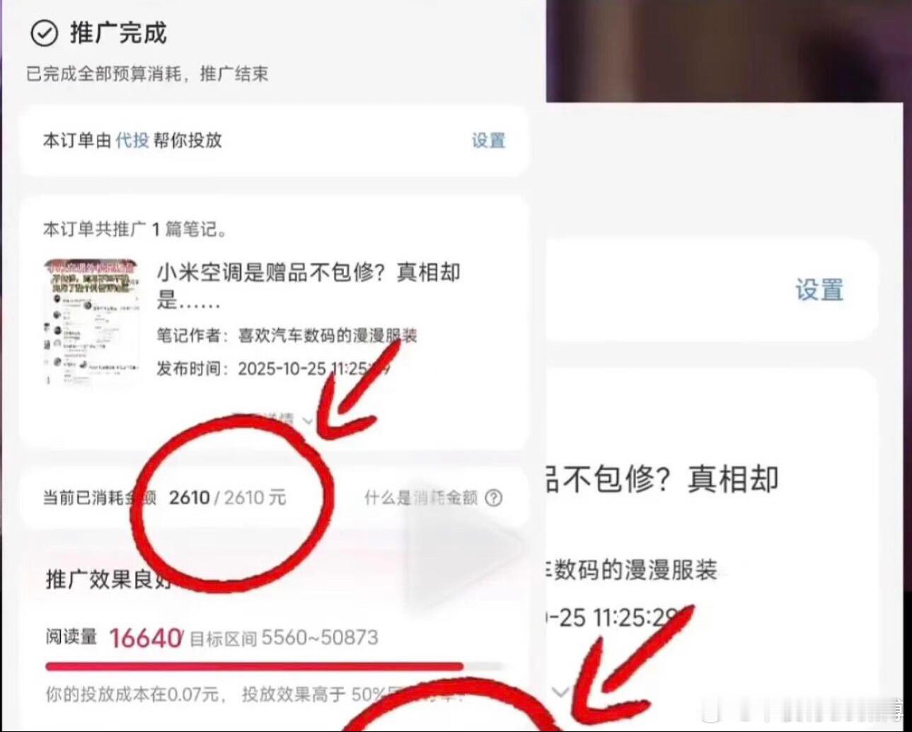 网友曝发小米负面被陌生人投流9000元。