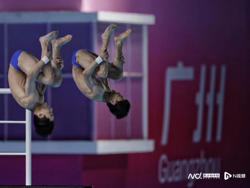 在率先进行的双人3米板项目中,广东两对组合谢思埸/黄博文、郭昊宇/胡宇康分别以258.48分和257.46分位列第二和第三,奥运冠军王宗源搭档世界冠军郑九源以266.88分拿下这个小项的头名。第一项过后,广东队以36.96分的优势领跑。