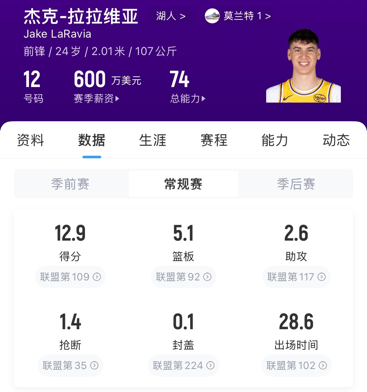 拉拉维亚赛季至今场均12.9分5.1篮板2.6助攻,这哥们和季前赛相比,简直是两个人。季前赛那是运一次球丢一次球,而且软趴趴的。常规赛则是能不运则不运,效率相当高,看来是教练组针对性的对他做出了指点。