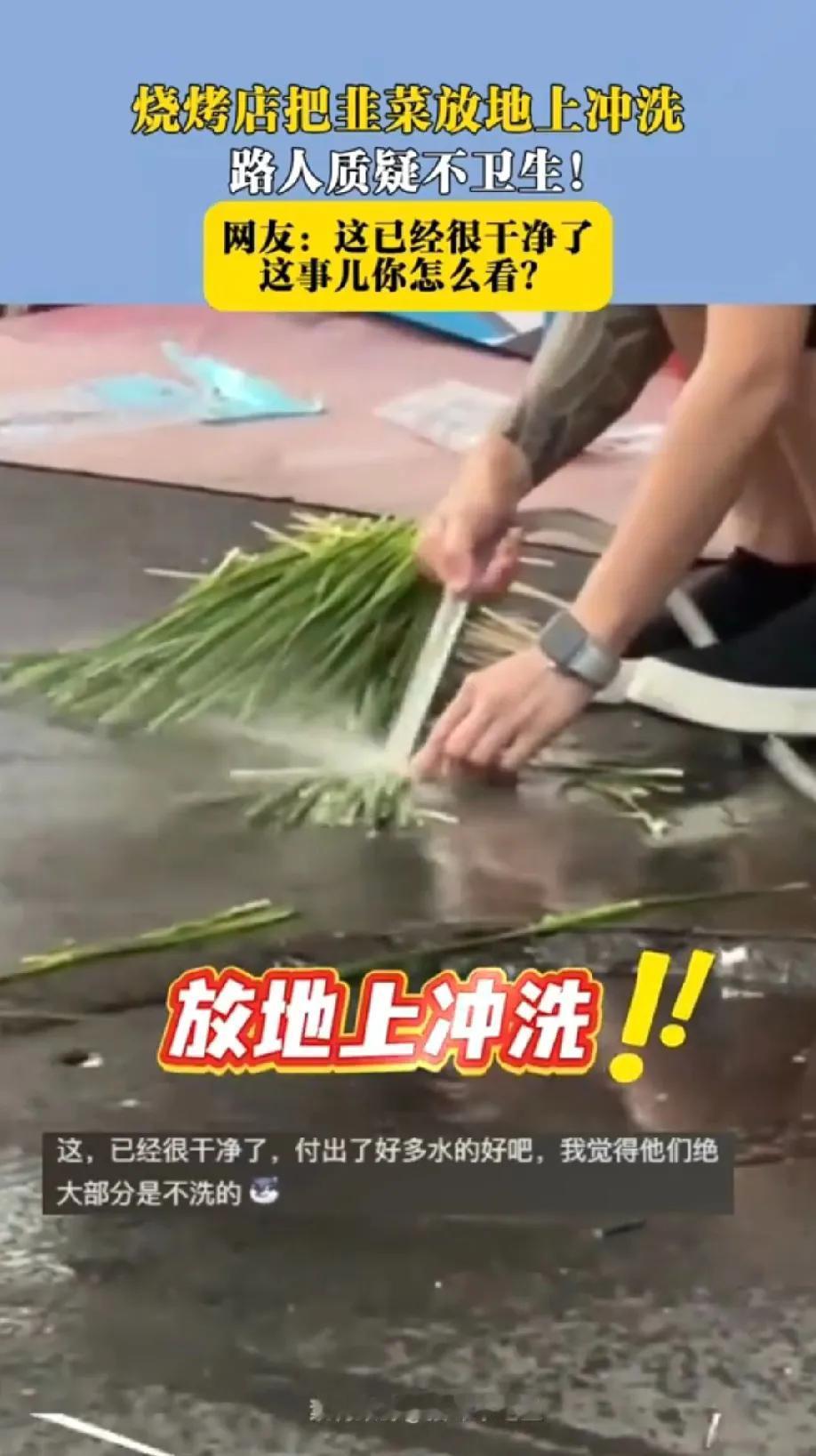 市民在街道看到这一幕,烧烤店把韭菜放在地上冲洗,网友纷纷表示已经很不错了!什么时候大众卫生食品安全已经要求这么低了? 相对比8月份曝出用抹布擦韭菜的根,这起码是用流水冲洗干净了。虽然大家都知道水泥路上很脏,陈年累计的垃圾、灰、痰,全都是印子,不是简单用水冲一下就冲洗干净了。 但是,干过烧烤店的人都知道,绿叶菜都不洗,防止卖不完烂掉,而且洗了菜有水分,也不好烤。这在地上用流水冲几秒的,算是良心商家了。 所以对于爱吃烧烤的我们,只有两种选择。要么眼不净为净,就当什么都没看到,要么自食其力,自己买自己串自己烤,卫生安全有保障!
