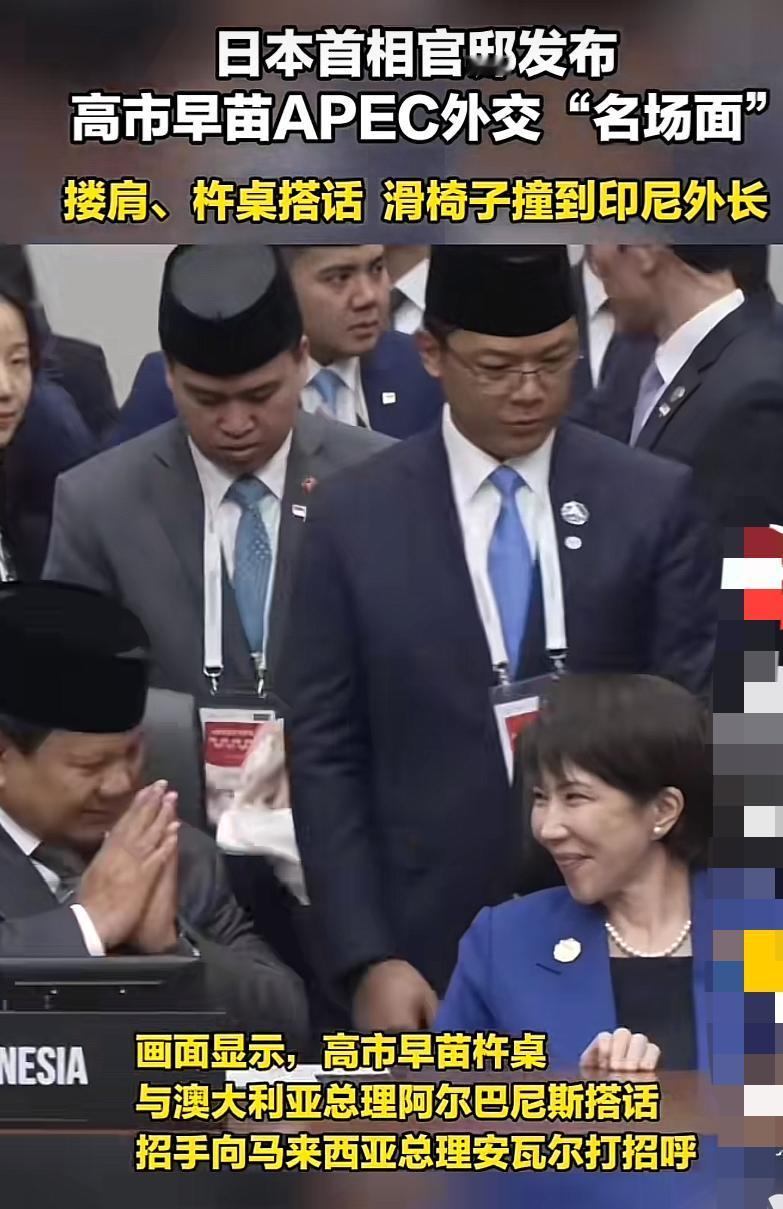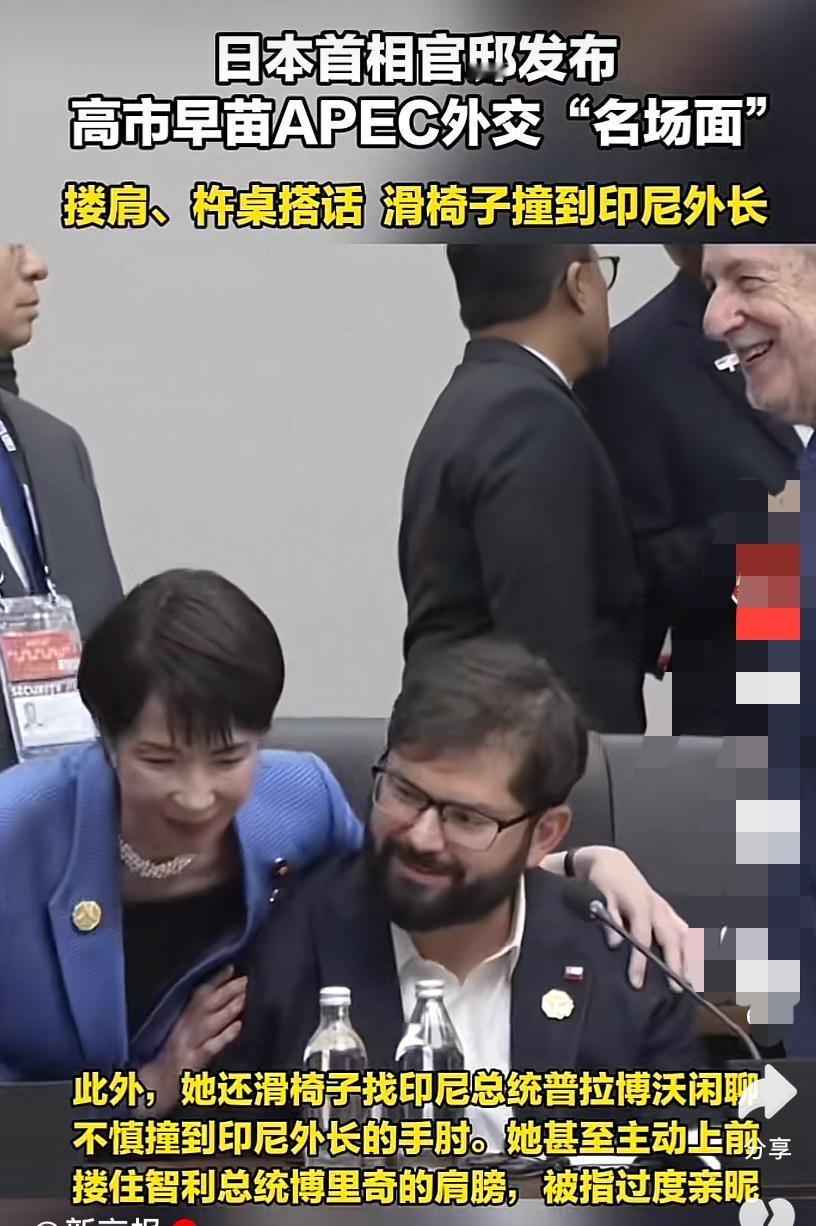 韩国峰会名场面:高市早苗就差没有爬到桌子上了 韩国apec峰会各国领导人都在全神贯注的准备会议资料,每个人都想在峰会上为自己国家争取更多政治或经济资源。严肃大会现场唯独日本首相丑陋百出让人厌恶。 日本首相高市早苗一点也没闲着上蹿下跳惹人反感,屁股杵在桌子上跟澳大利亚总理嬉皮笑脸,她还把座椅💺滑行到找印尼总统搭话皮笑肉不笑吓得印尼总连忙双手合十抵消尴尬。她在椅子滑行时还撞到了印尼外长连声道歉都没说,她又走到智利总统跟前搂住他跟她面对面的交流,智利总统目光躲闪微笑回应。 高市早苗过于亲密的行为让人很不舒服,关键她跟人家又不熟悉给对方带来压力。 高市早苗以为她是窈窕淑女,走纯情路线装可爱,老爷们都稀罕她,事实那群老爷们心里不知怎么唾弃她。作为一个女人而且是国家领导人不注重形象,公共场合不检点,有损国家形象,日本首相官邸都看不惯了把高市早苗的滑稽表现公布出来。不知高市早苗看了有何感想?