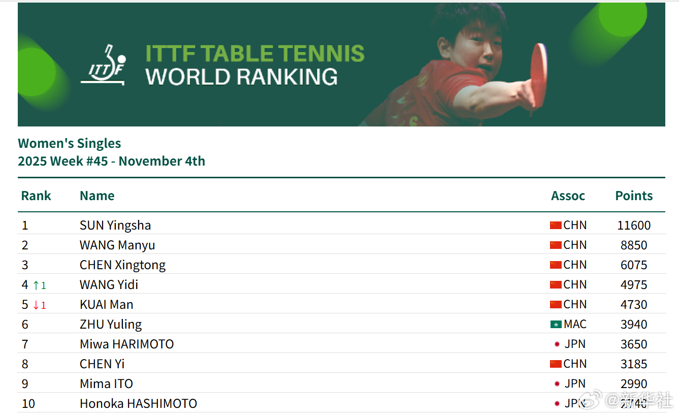 #孙颖莎王楚钦继续领跑世界排名#【#孙颖莎连续第173周世排第一#】11月4日,国际乒联公布2025年第45周排名。女单方面,11600分连续第173周霸榜第一,8850分排名第二,陈幸同6075分排名第三。男单方面,10900分排名第一,8075分排名第二,一起为国乒加油!