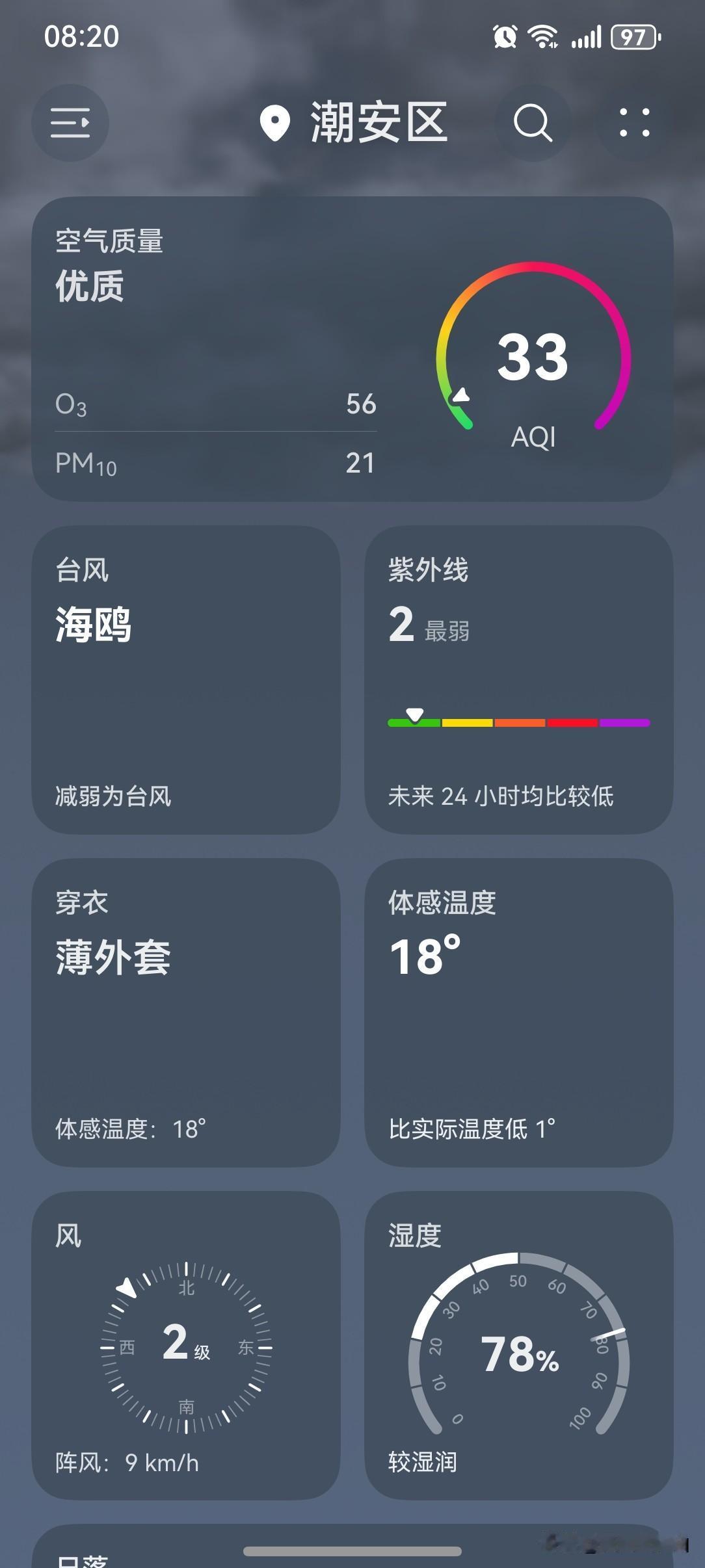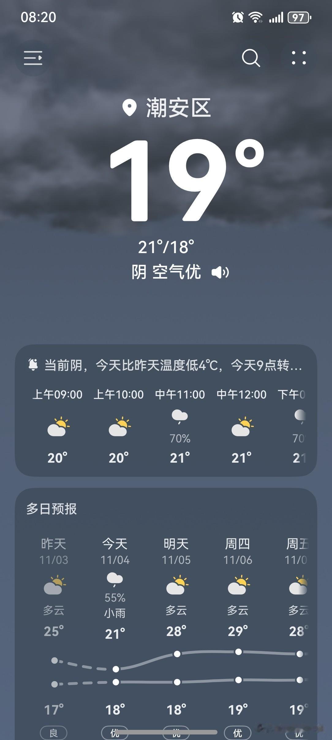 冷!冷!冷! 冷空气携带雨水而来, 广东气温降降降! 4日白天, 韶关、清远、河源北部、梅州北部、粤西大部和珠三角西部市县阴天有中到大雨, 其余市县阴天有小雨局部中雨, 早晚体感清凉; 5~6日,降水减弱, 云量逐渐减少,气温回升。 今天(4日), 潮州多云有阵雨, 气温18~21, 此刻气温19℃, 体感温度18℃。 从昨晚开始, 明显感到气温下降了。 今天早上起来发现, 降温更明显了。 小伙伴们! 长袖+外套必须穿起来啦! 时刻注意防寒保暖, 别让感冒病毒有机可乘! 再来看看今天的天空, 天色看起来还是不错的, 阳光若隐若现! 总体来讲, 今天的天气还是很OK的, 依然值得一个五星好评。 如此天气! 元芳,你怎么看? [捂脸][笑哭][捂脸][笑哭][捂脸][笑哭][捂脸][笑哭]