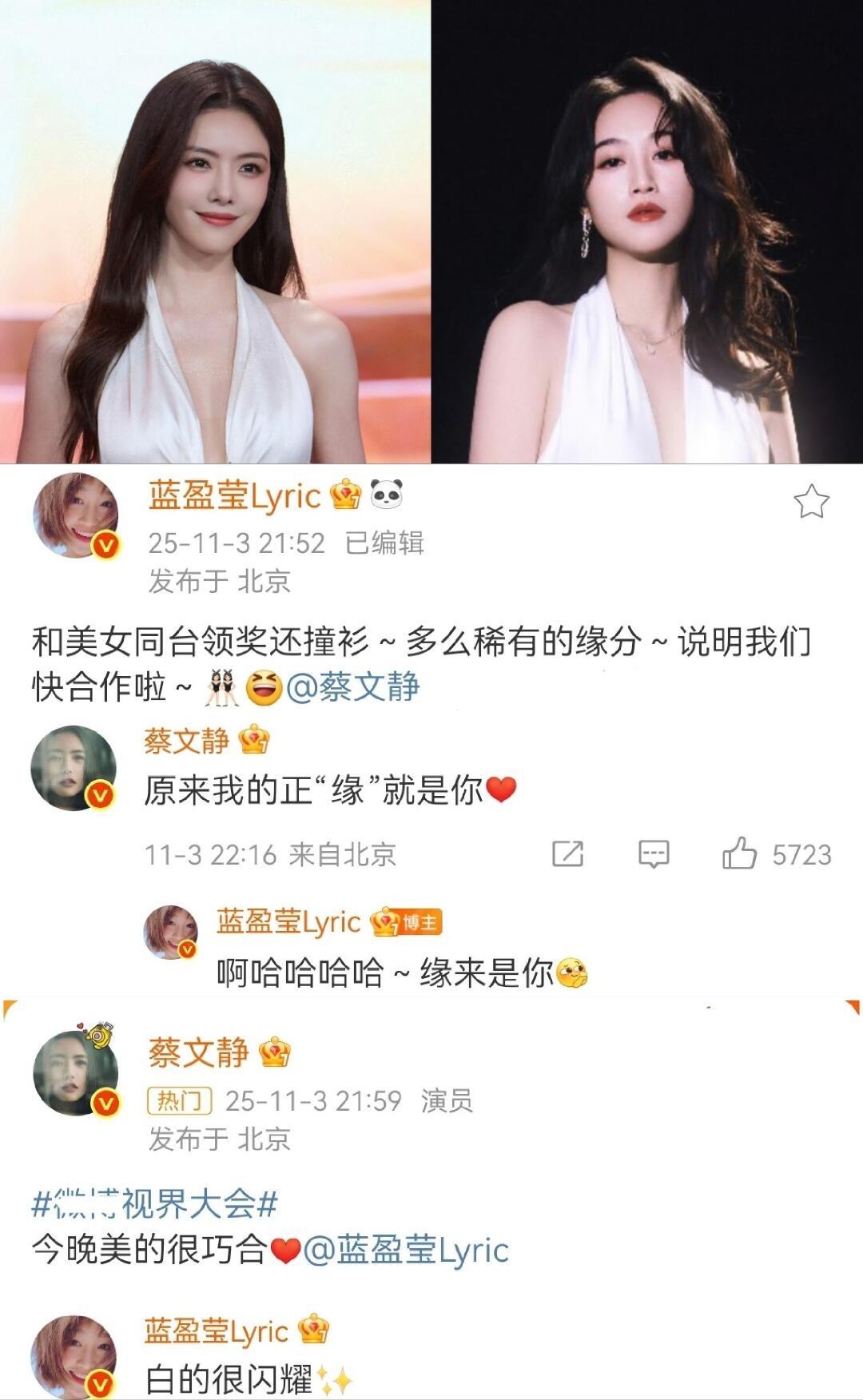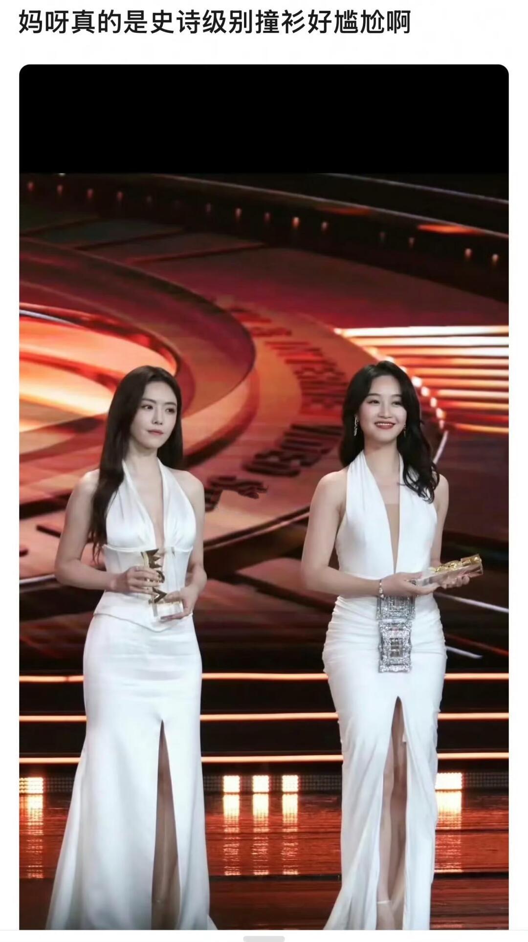 蓝盈莹蔡文静撞衫,两个人都穿了白色深v长裙,虽然细节不一样,但是如果不仔细看,真的很像。 普通人撞衫都觉得尴尬,更何况是两个女明星呢? 虽然两人事后马上高情商互动:蓝盈莹发博调侃“和美女同台领奖还撞衫,多么稀有的缘分,说明我们快合作啦”,蔡文静秒回“今晚美的很巧合”,更接梗“我的正缘就是你”, 但依旧还有很多人觉得很是尴尬的。 大家觉得她们真的是不介意呢?还是在强颜欢笑呢?