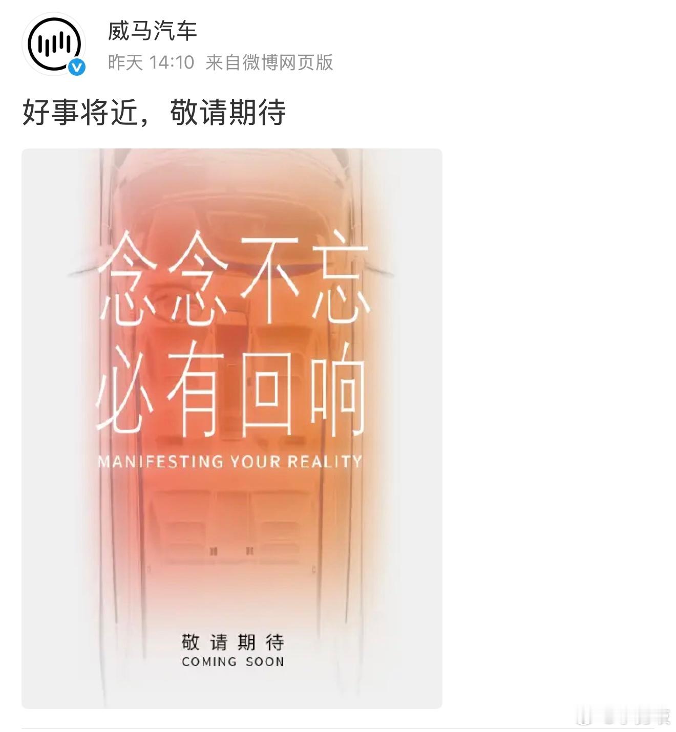 11月3日,威马汽车今日通过官微发文称,“好事将近,敬请期待”,并配图“念念不忘,必有回响”。