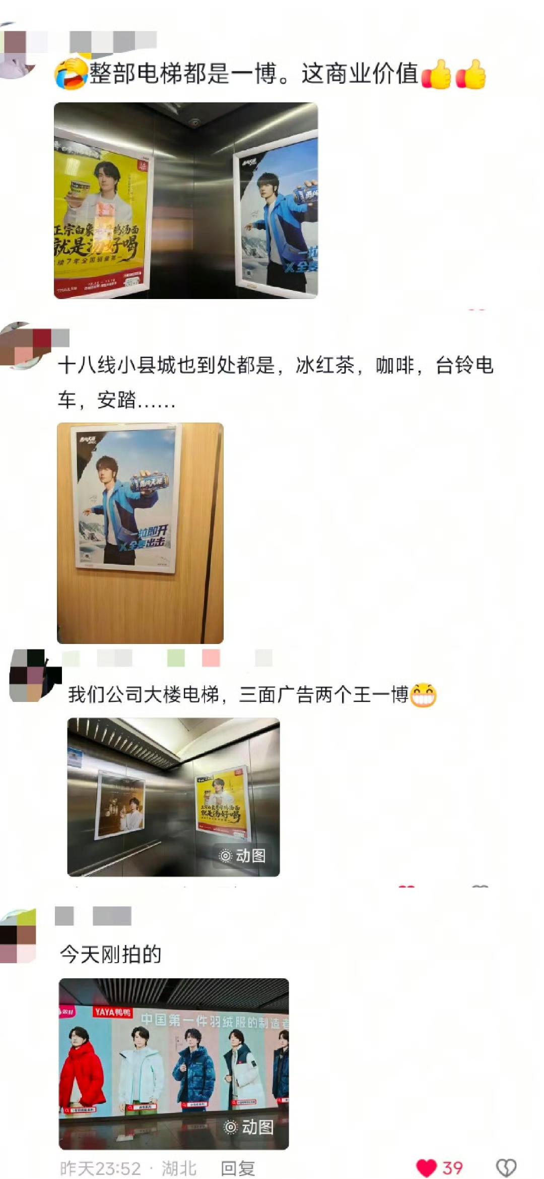 被王一博“包围”是一种什么感觉? 有网友拍到电梯里三面都是王一博,哪一面你都会和王一博“面对面”[偷笑]。 “连续两年了,王一博就没有从我们家电梯上下来过”[捂脸]。 还有谁和王一博“偶遇”的?