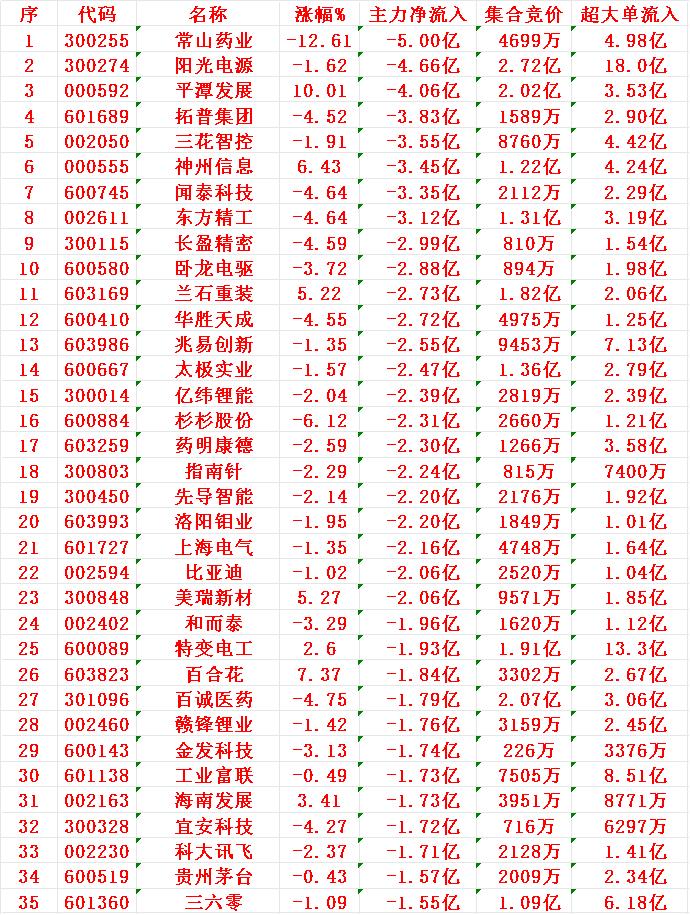 11月4日开盘45分钟,主力资金“卖出的 ”35名单! 常山药业:净流出 5.00亿元 阳光电源:净流出 4.66亿元 平潭发展:净流出 4.06亿元 拓普集团:净流出 3.83亿元 三花智控:净流出 3.55亿元