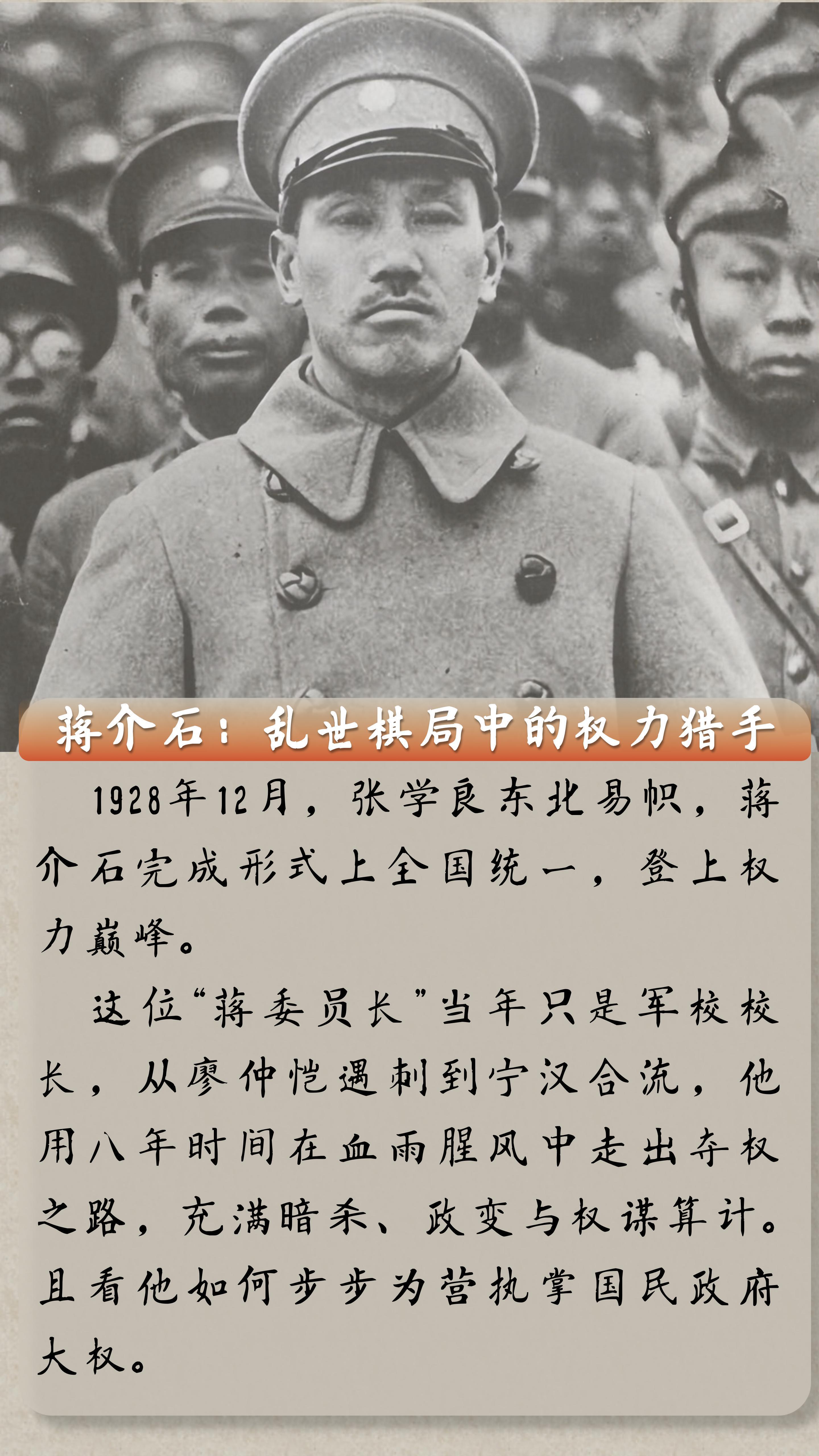 蒋介石:乱世棋局中的权力猎手。夺权八载,权谋尽显。然权谋得一时之利,终失民心。历史知识